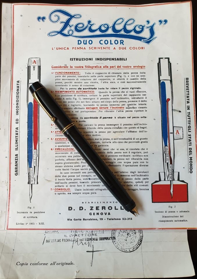 Due stupendi esemplari della mitica Zerollo's, stilografica, con due serbatoi per due inchiostri diversi e due pennini alternativamente emergenti a seconda della rotazione destra o sinistra del fondello. Modello in ebanite, 1934; l'altro 1936.