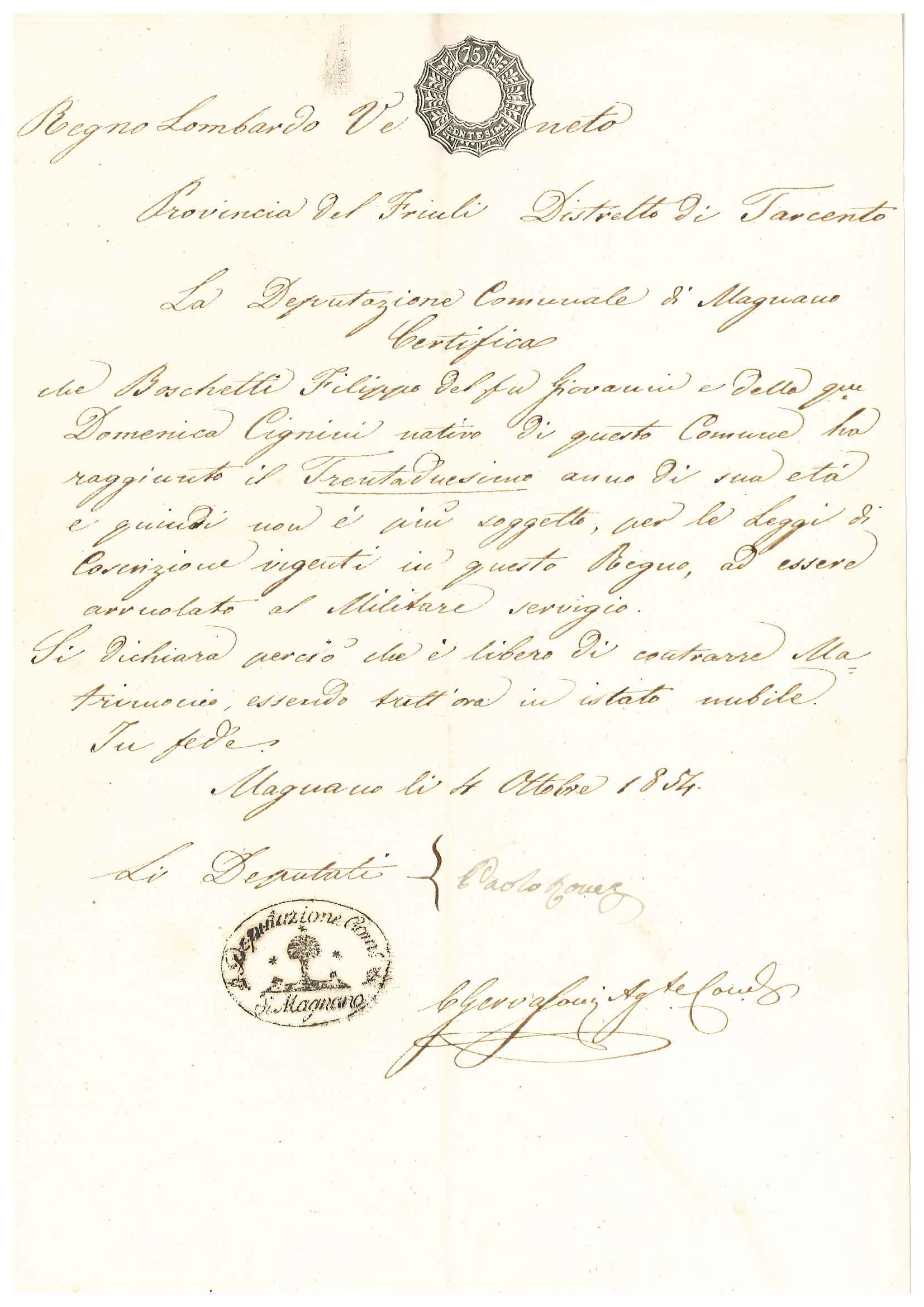 Buongiorno a tutti, allego questo documento datato 1854. Siamo nel comune di Magnano (in Riviera) che apparteneva al distretto di Tarcento, Provincia del Friuli. Questa parte del territorio sarà annessa al Regno d'Italia con la III guerra d'indipendenza del 1866. Il sindaco comunica a Boschetti Filippo che, avendo raggiunto l'età di trentadue anni, è esonerato dal servizio militare e che può, eventualmente, anche sposarsi visto che è "nubile".