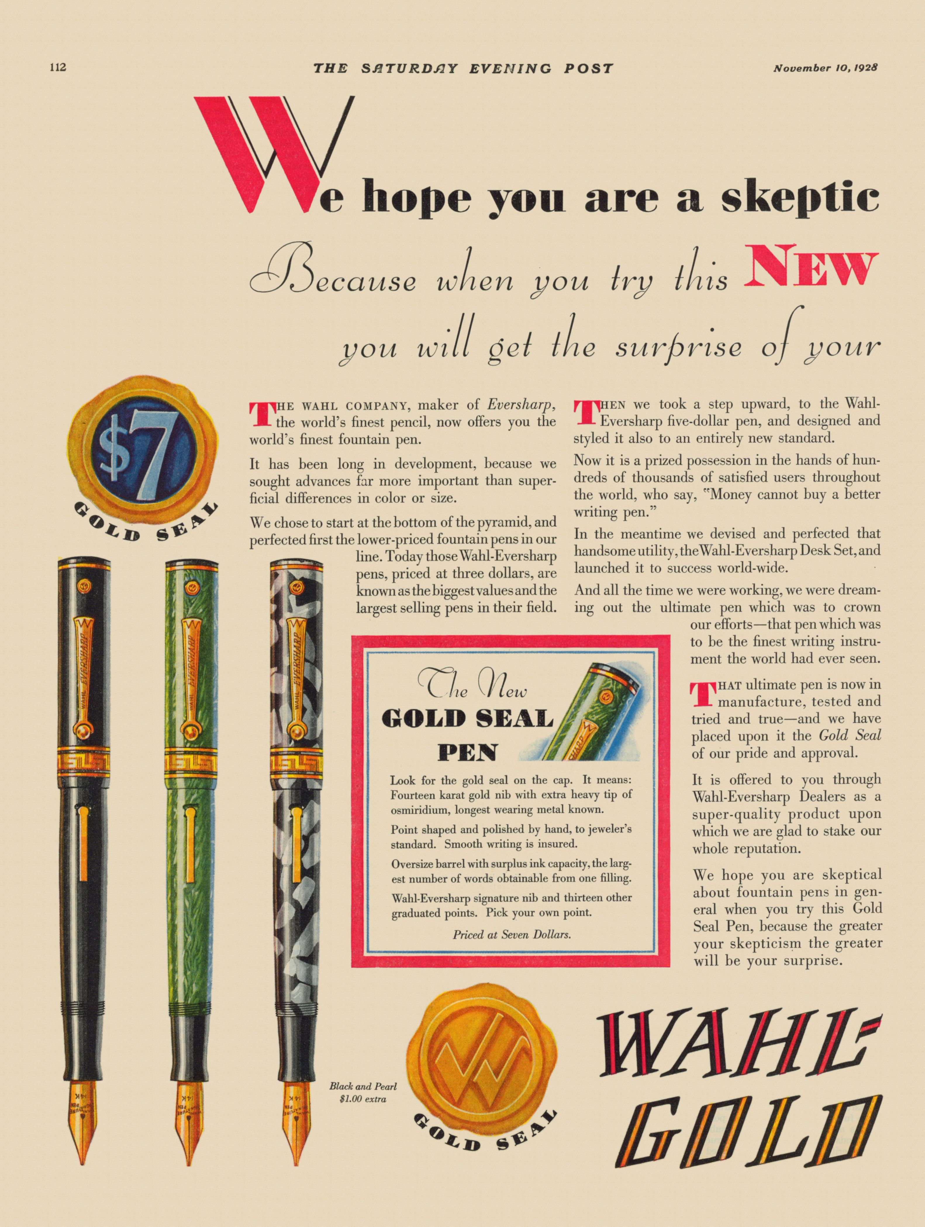 Pensa che, stando alle pubblicità, si può tranquillamente dubitare che le prime Deco Band fossero anche Personal Point (che io vedo essere presentata come novità nel 1929) pur essendo Gold Seal (1928); ma la tua Wahl Pen, come attesta la clip, ha già un pennino anche Eversharp?