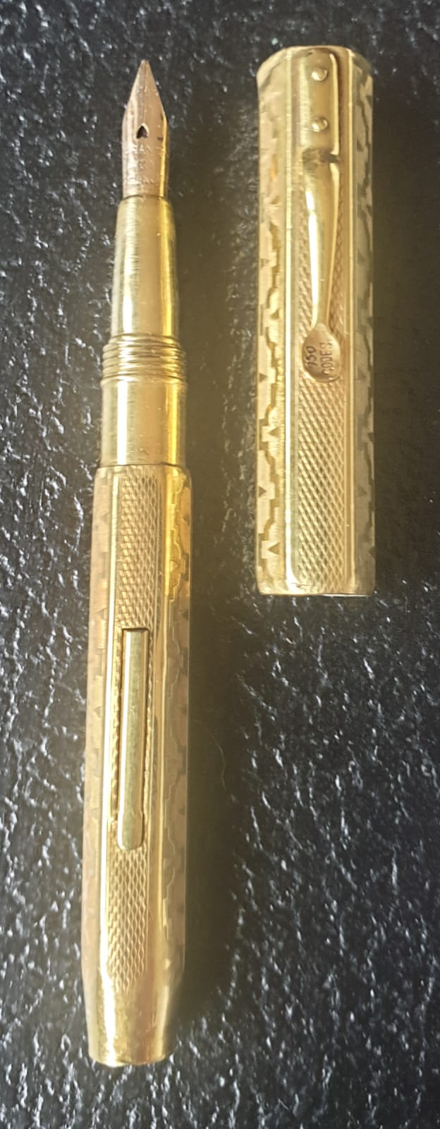 Due stilografiche molto rare, anni '30, di notevole bellezza: una CODES, spagnola, in oro 750 ed una Goldfink, tedesca, in oro 585, cesellata a mano, con fregio in ismalto blu sul cappuccio.