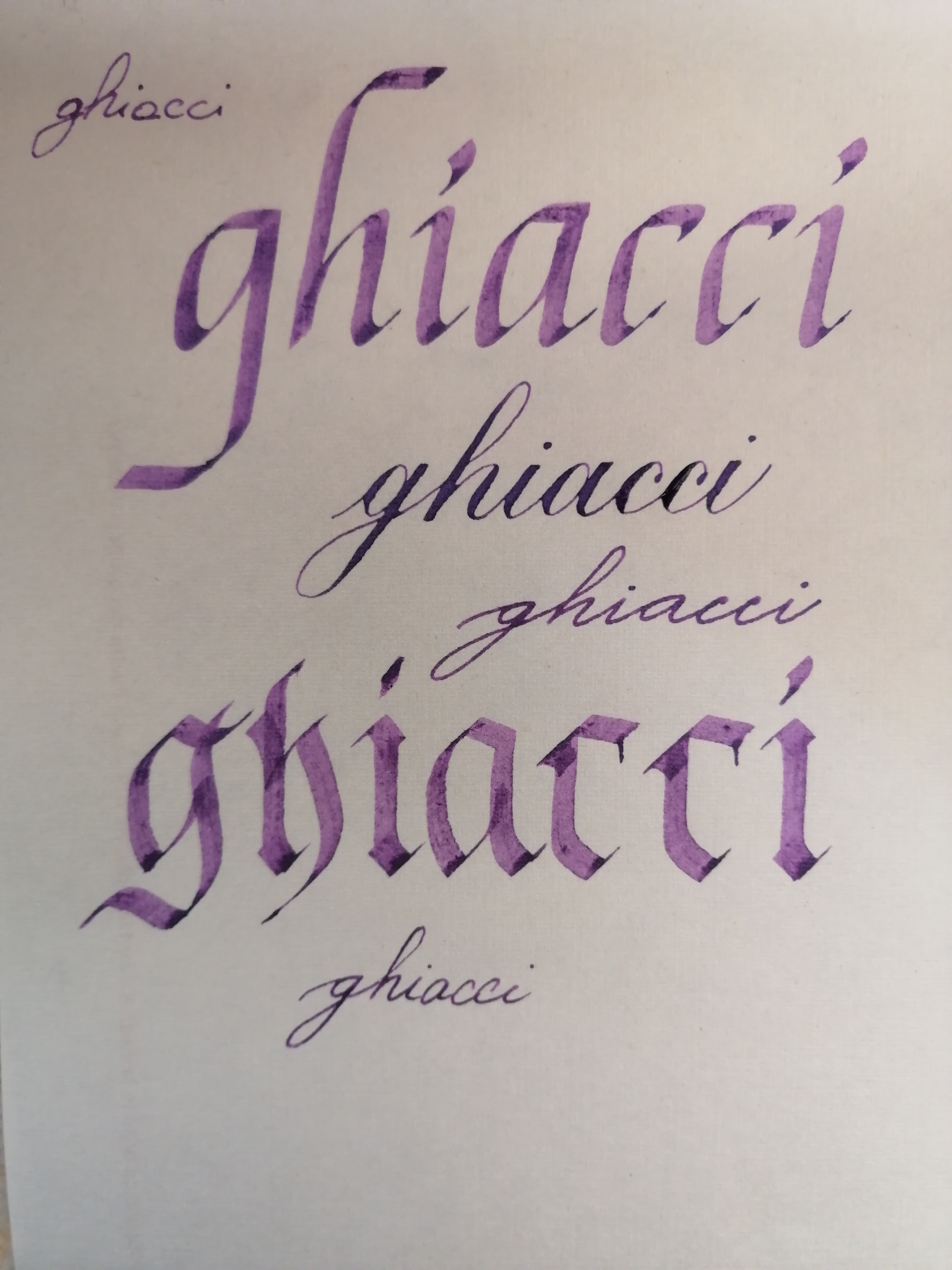 Stesso inchiostro per tutto. Il secondo cancelleresca, il quinto gotico Fraktur entrambi pennino Speedball c1. Il terzo é corsivo inglese con pennino Perry & co n.104ef. Il quarto corsivo americano, l'ultimo un corsivo inglese senza variazione di tratti entrambi con pennini in vetro.