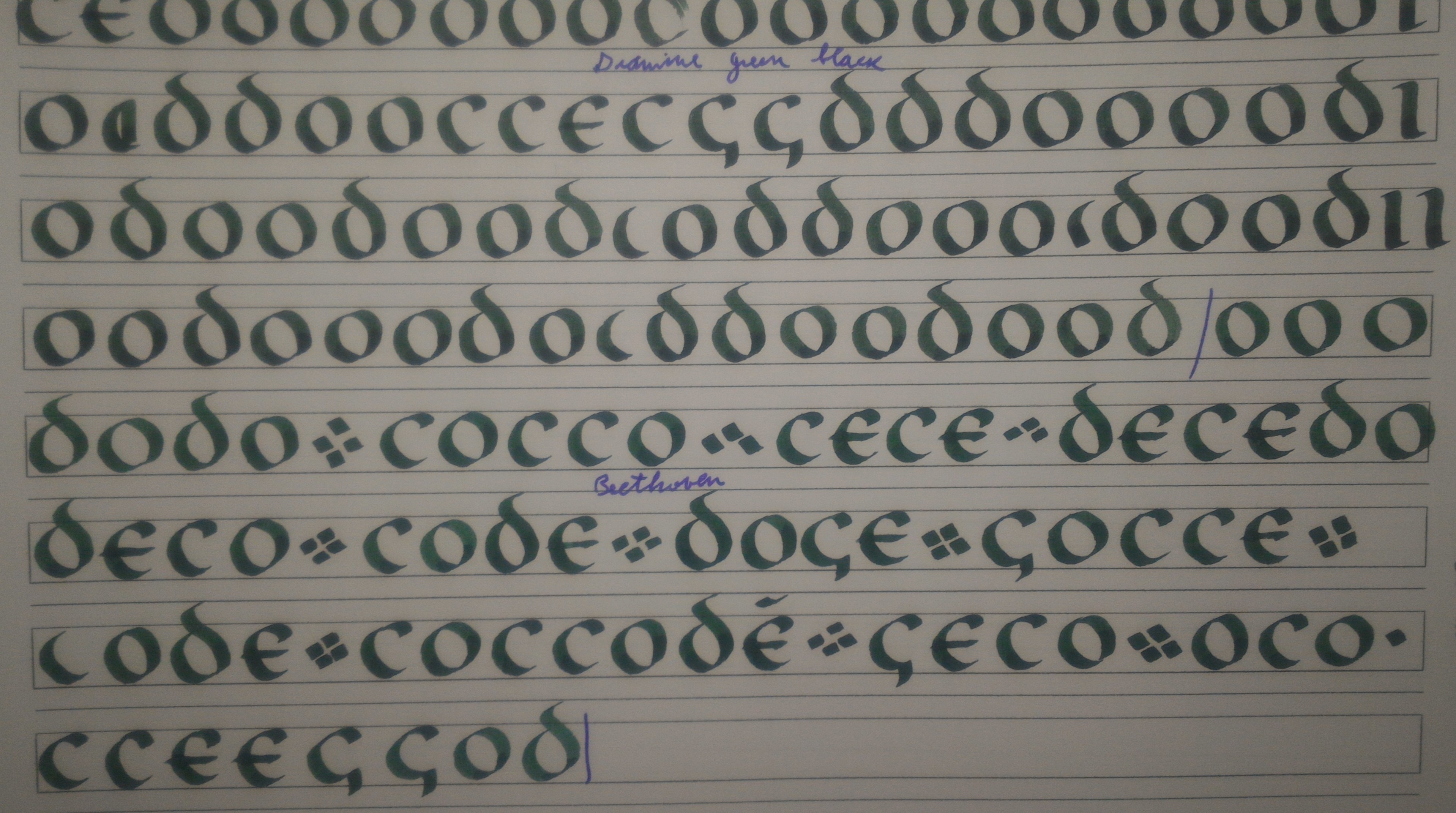 Ho ripreso in mano l'onciale, primo amore calligrafico che, quindi, non si scorda mai. Metodo Kossowska, per adesso mi sono esercitato solo sulle lettere o, c, e, g, d quindi il vocabolario è parecchio ristretto, e anzi la maggior parte del materiale fatto sono solo ripetizioni di lettere una dietro l'altra. Partecipo alla simpatica iniziativa di Dory con molto piacere, con quello che posso.