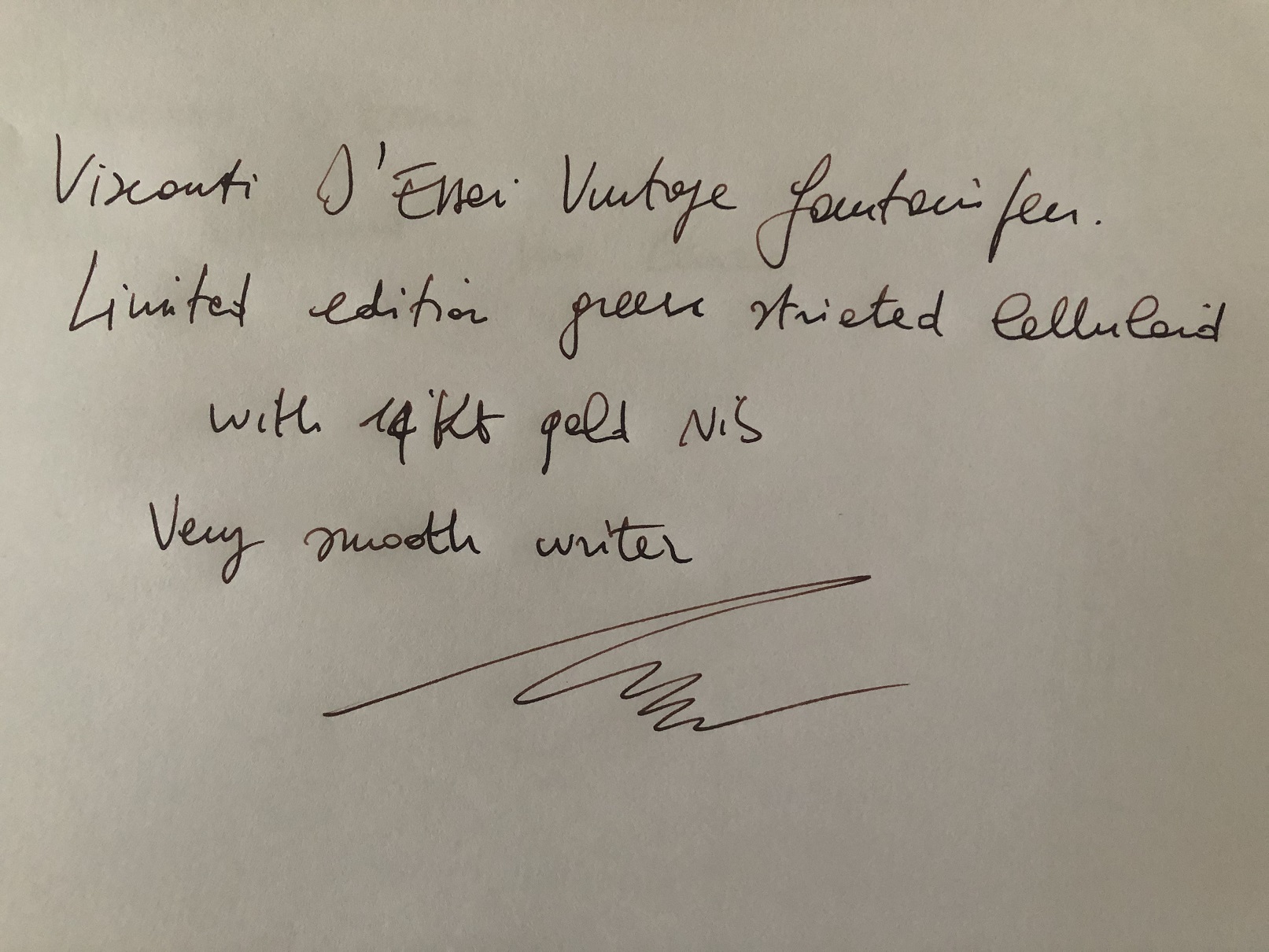 Esperienza di scrittura positiva, con la pecca del converter nascosto che vorrebbe essere uno stantuffo. La celluloide poi ha indubbiamente un fascino che non è paragonabile alle cosiddetta “resina preziosa”. Nel mio caso poi non ho riscontrato i problemi di deformazione che a volte affliggono il materiale (avvallamenti, difficoltà di accoppiamento cappuccio/corpo penna), probabilmente perchè essendo una vecchia partita molto stagionata tutte le deformazioni la celluloide le aveva manifestate prima di essere lavorata.