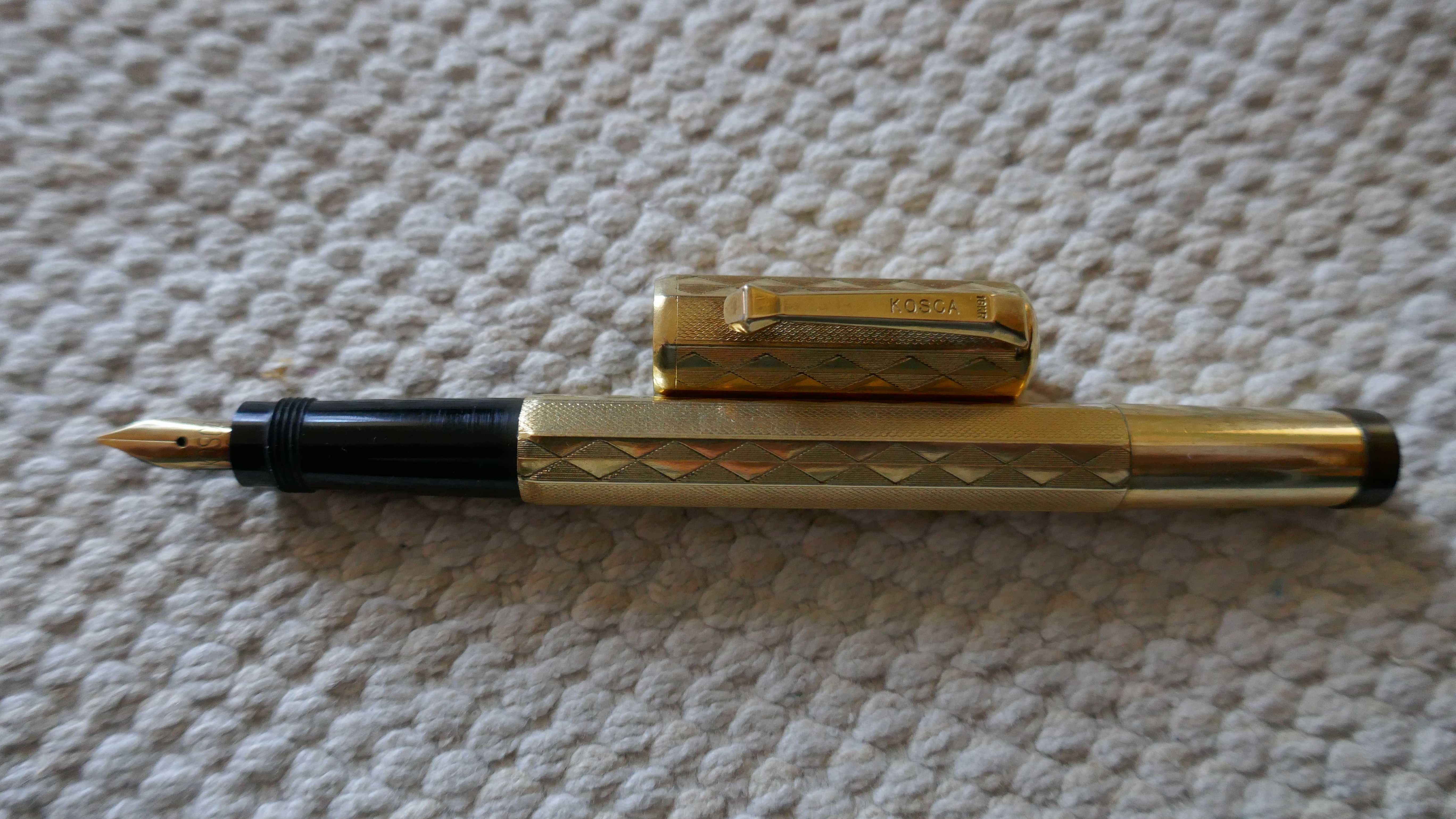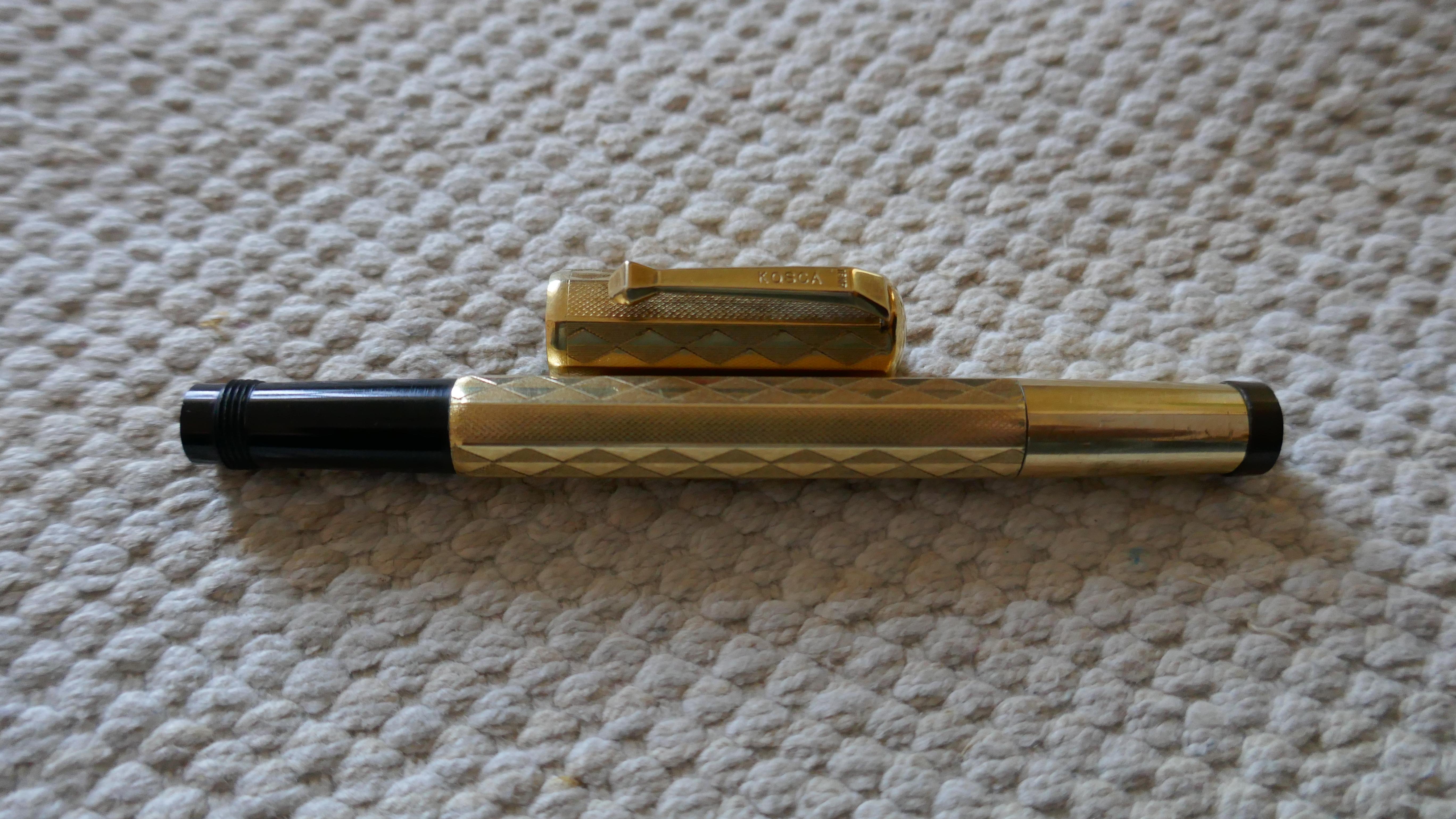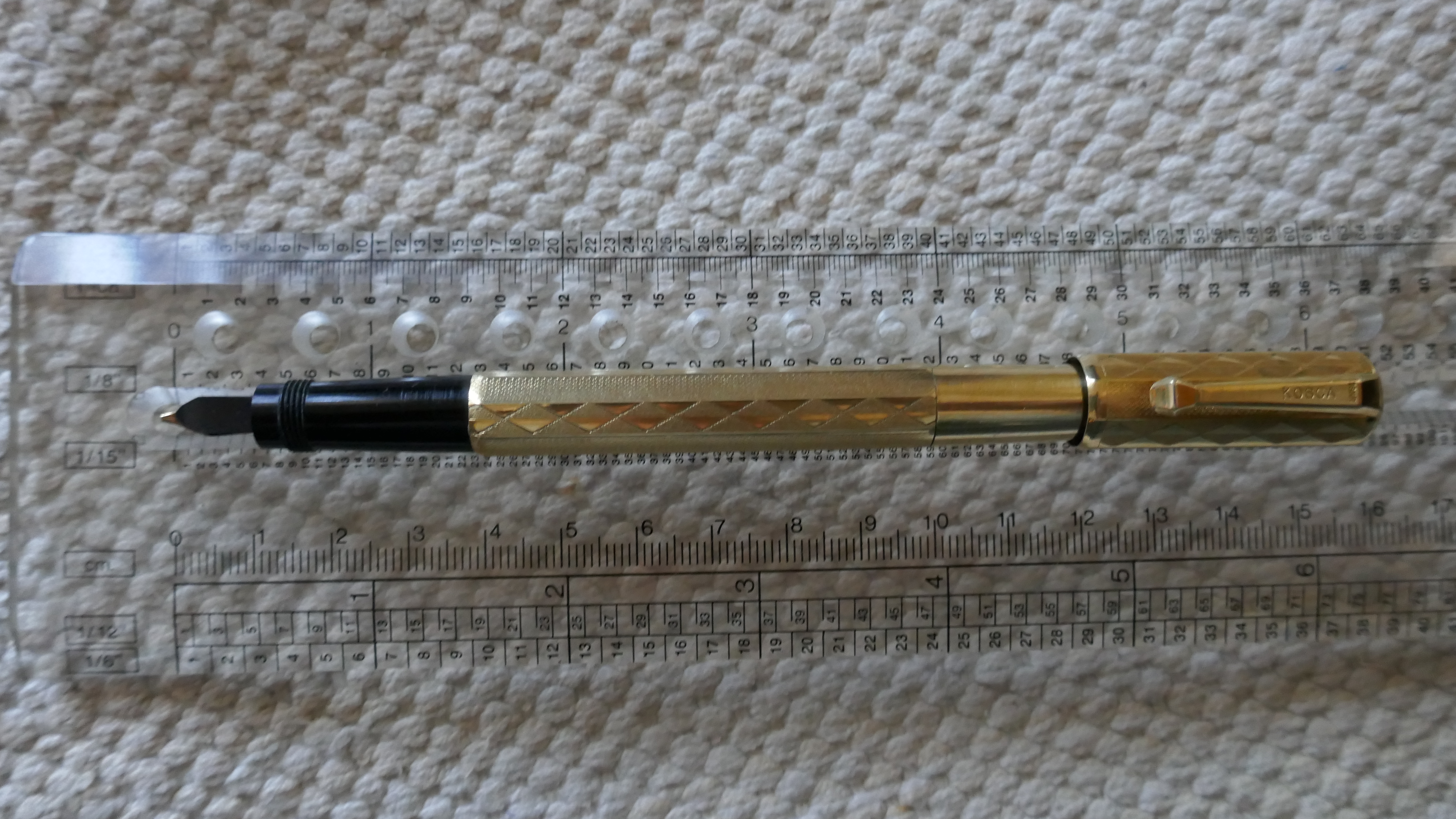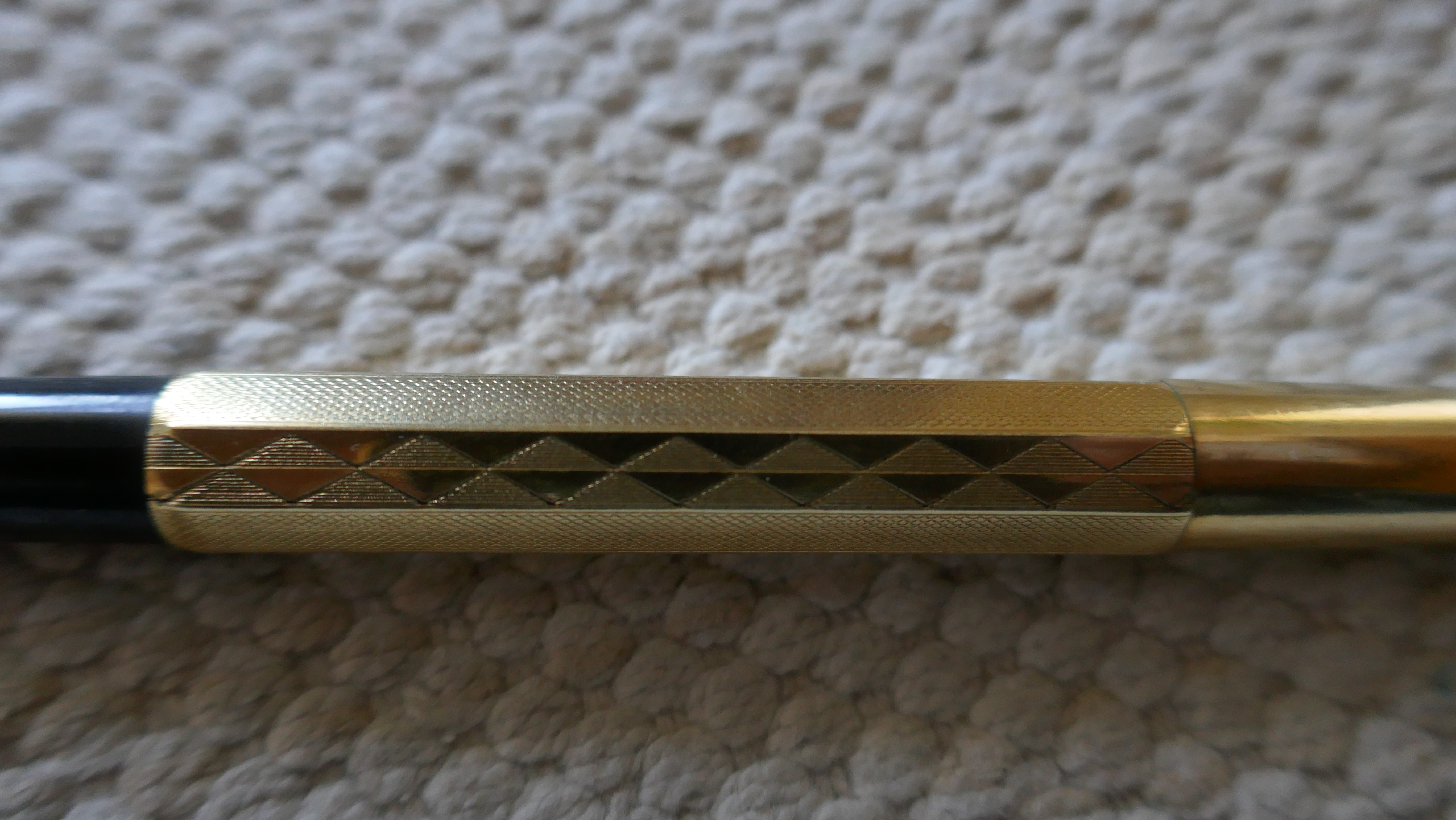 ovvero, sulla "camicia" (tutta la parte metallica che ricopre la penna che, originariamente, era solo in ebanite), in ottone, è steso un sottilissimo (millesimi di millimetro) foglio di oro a 18K