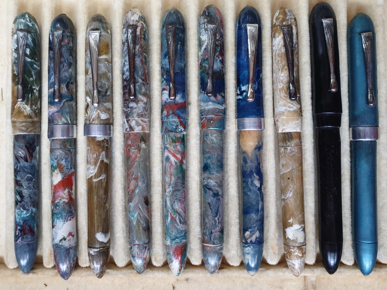 ITALIA 1944/45 – Fratelli Rossi, Sandrigo (VI). Periodo drammatico, ma c'è chi s'ingegna lo stesso a fare stilografiche con caseina e latta (le verette di alluminio sono riparazioni degli anni ‘50). La galalite era già usata, molto meglio, per penne anche belle (v. Monte Grappa, Conway Stewart ed altri che condividerò, sempre con piacere, prossimamente) e per deliziose, coloratissime spille. Quelle qui presentate, oggi non a caso, sono piuttosto... scarse. A parte il valore storico/documentaristico.