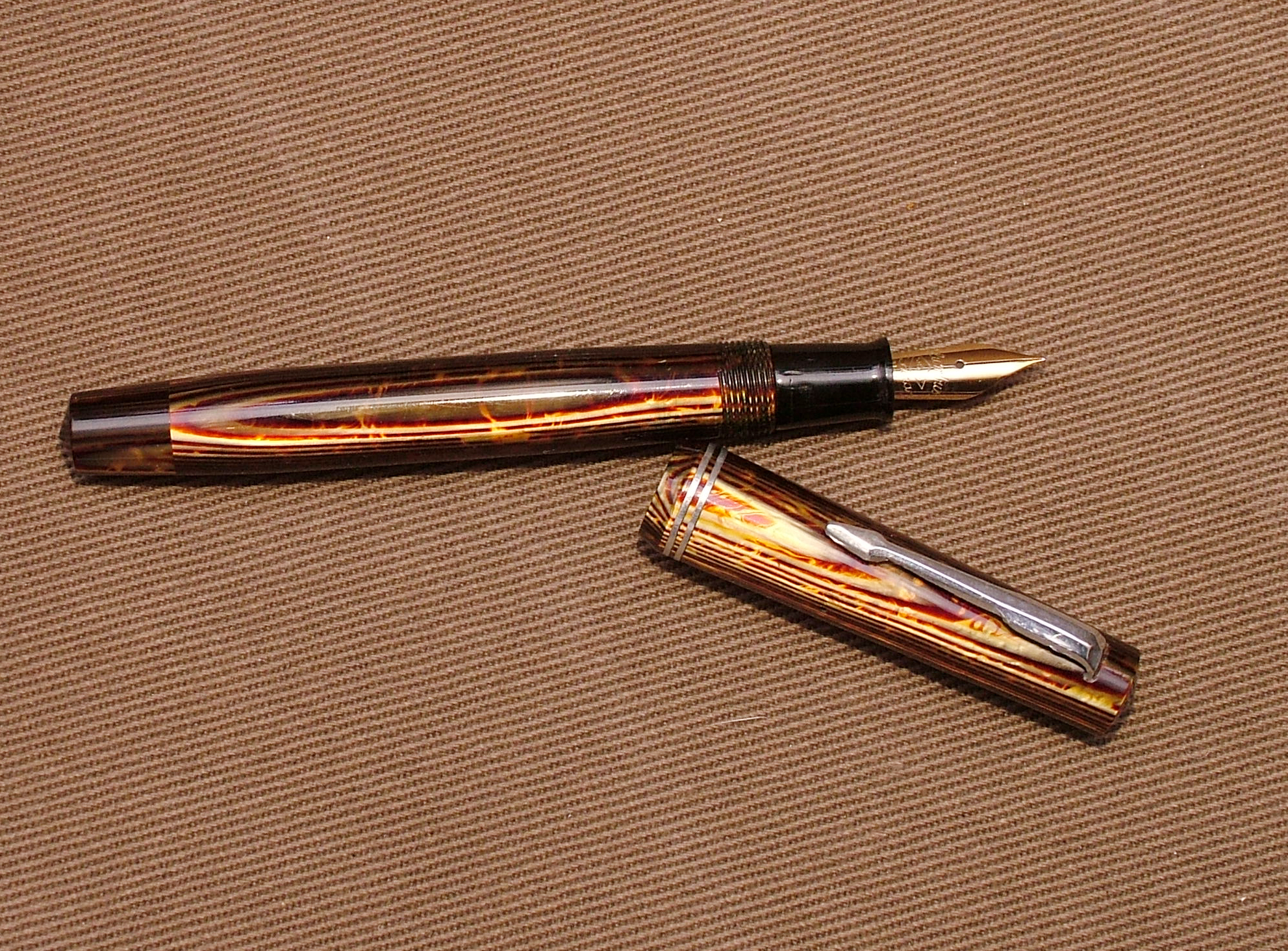 Nella Extra classica la celluloide é stata tornita evidentemente un po' di sbieco invece che parallelamente alla direzione delle lamine, e ciò ha creato quell'effetto veramente speciale. Devo ancora ringraziare a sufficienza Paolo (Sanpei) per aver scovato per mia moglie (per meeee) una penna dalla celluloide cosí bella.