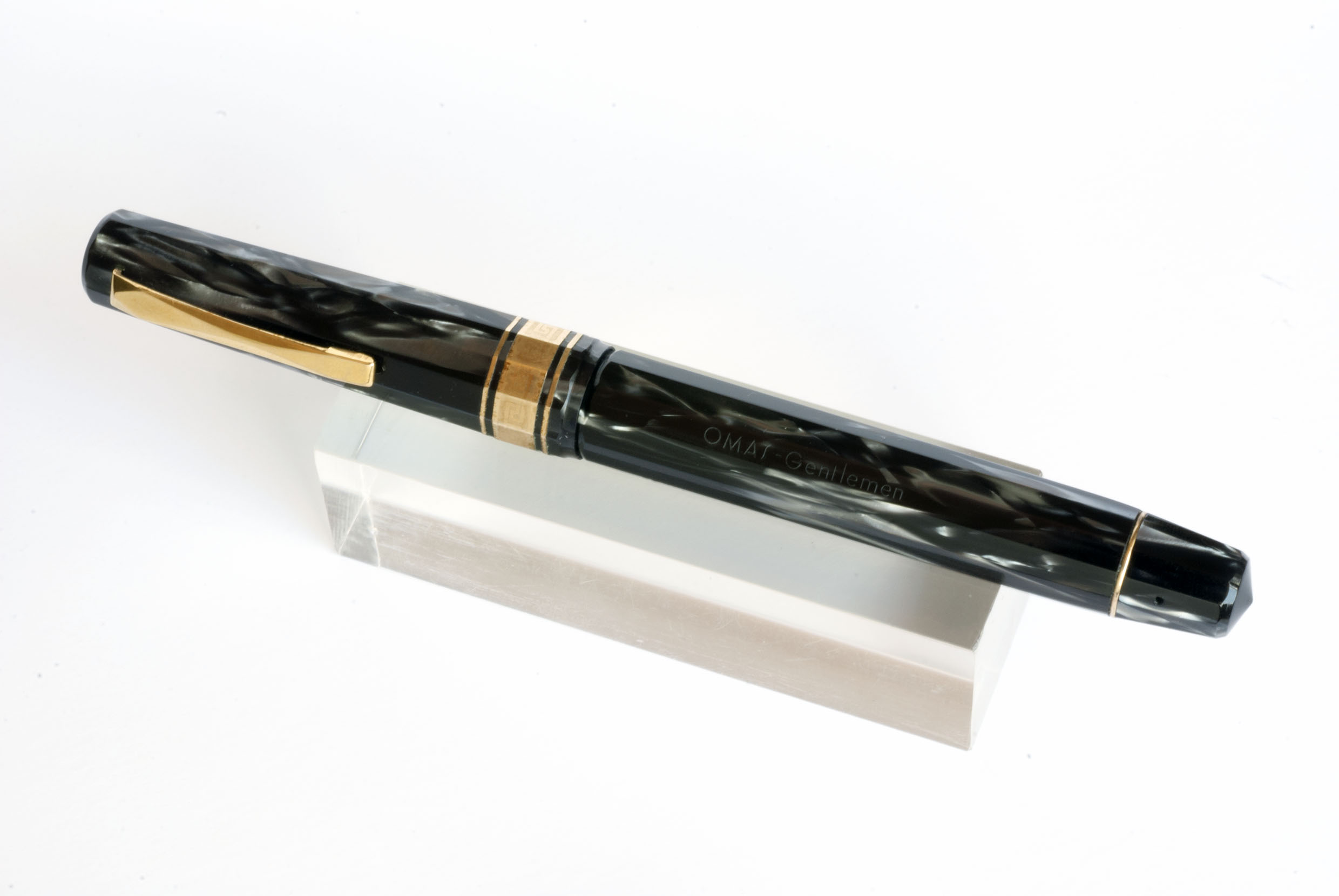 C’è una celluloide grigioperla, diversa da questa, più sobria, come un nero marmorizzato, di fatto quasi un colore nero ma con una variegatura leggera, elegantissima, che OMAS usó quando ripropose le sue penne in celluloide, credo nel 1991 o 1992. La utilizzò solo per un paio d’anni, credo, perché poi la sostituì nuovamente con una celluloide molto simile (se non la stessa) di quella in fotografia e, che io sappia, non la usò mai più per altre penne (forse ne aveva esaurite le scorte). Qualcuno ne avrá una fotografia?