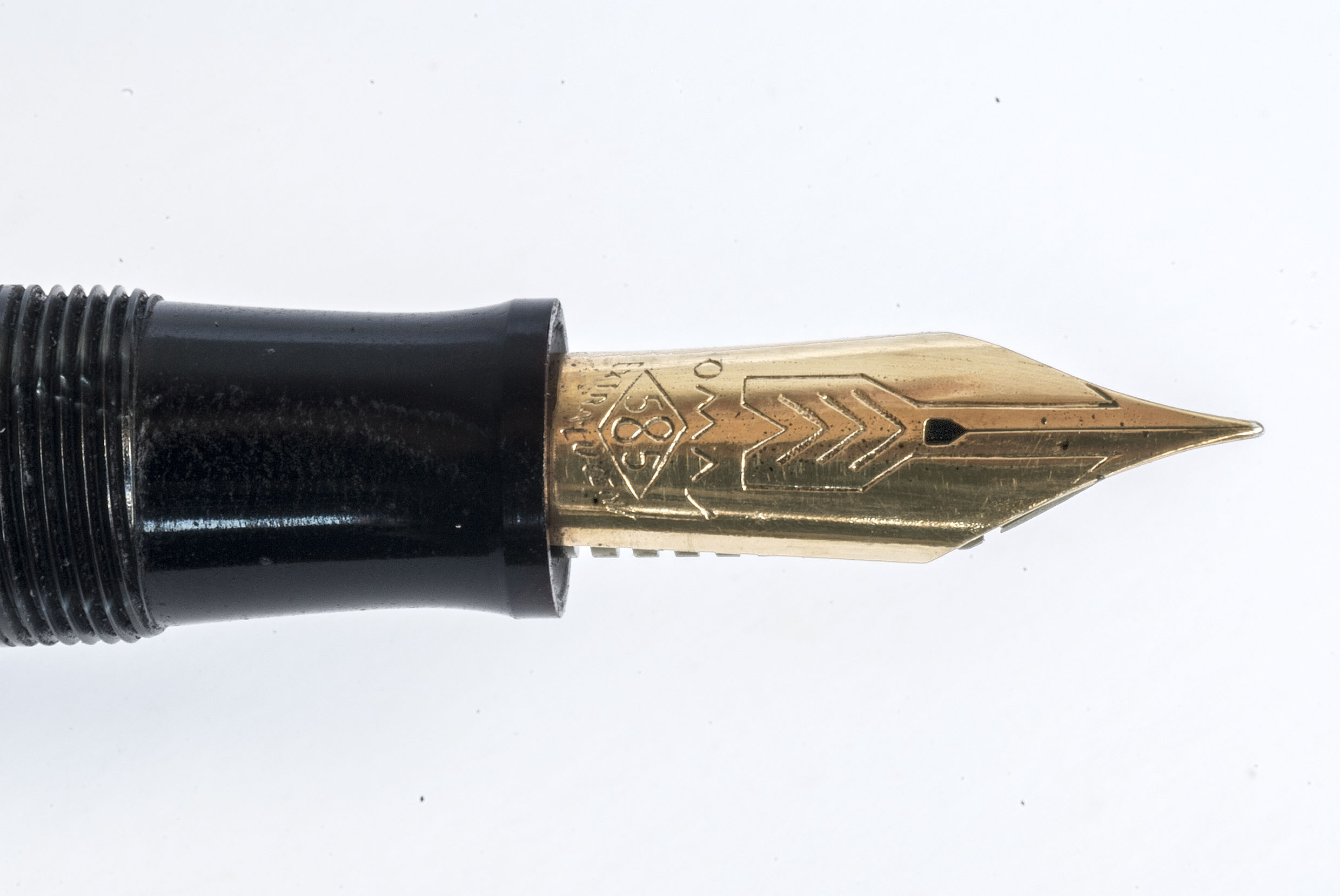 Ora, mi sono fatto la convinzione che all'epoca ci fossero meno "appassionati" di penne, e che la gente acquistasse le penne per usarle e punto. Questo si rifletteva probabilmente in un atteggiamento meno ortodosso e meno purista da parte dei produttori. Alla OMAS, con ogni probabilitá, montavano sulle loro Gentlemen in celluloide i pennini che avevano a mano. In quel periodo erano soprattutto Extra Lucens (a casetta), ma se capitava un Extra (a cuoricino), andava ugualmente bene, e si montava su una penna. Quando OMAS passó dalla Gentlemen alla Gentleman, dalla celluloide alla resina di cotone, dovevano ancora esserci in giro un certo numero di corpi fatti in celluloide, che certo l'azienda non vedeva come qualcosa di vecchio da buttare via. Di fatto, del periodo a metà del guado, uno può trovare con frequenza delle penne Gentlemen, in celluloide, messe dentro una scatola e una controscatola sulle quali il nome é scritto con la "a", Gentleman. La mia Gentlemen aveva una scatola Gentlemen e una controscatola Gentleman. Infine, quando tuttavia esistevano corpi in celluloide, ma le scorte di pennini Extra ed Extra Lucens si erano ormai esaurite, alle maestranze di OMAS dovette sembrare del tutto normale inserire nel conduttore uno dei nuovi pennini, con sfiato rotondo. In questo modo, accanto alle Gentlemen con pennino Extra Lucens (diciamo, quello corretto), abbiamo anche "modelli di transizione": Gentlemen con pennino Extra (rimanenze) e Gentlemen con pennino dallo sfiato rotondo (il nuovo tipo), e tutte legittimamente OMAS.