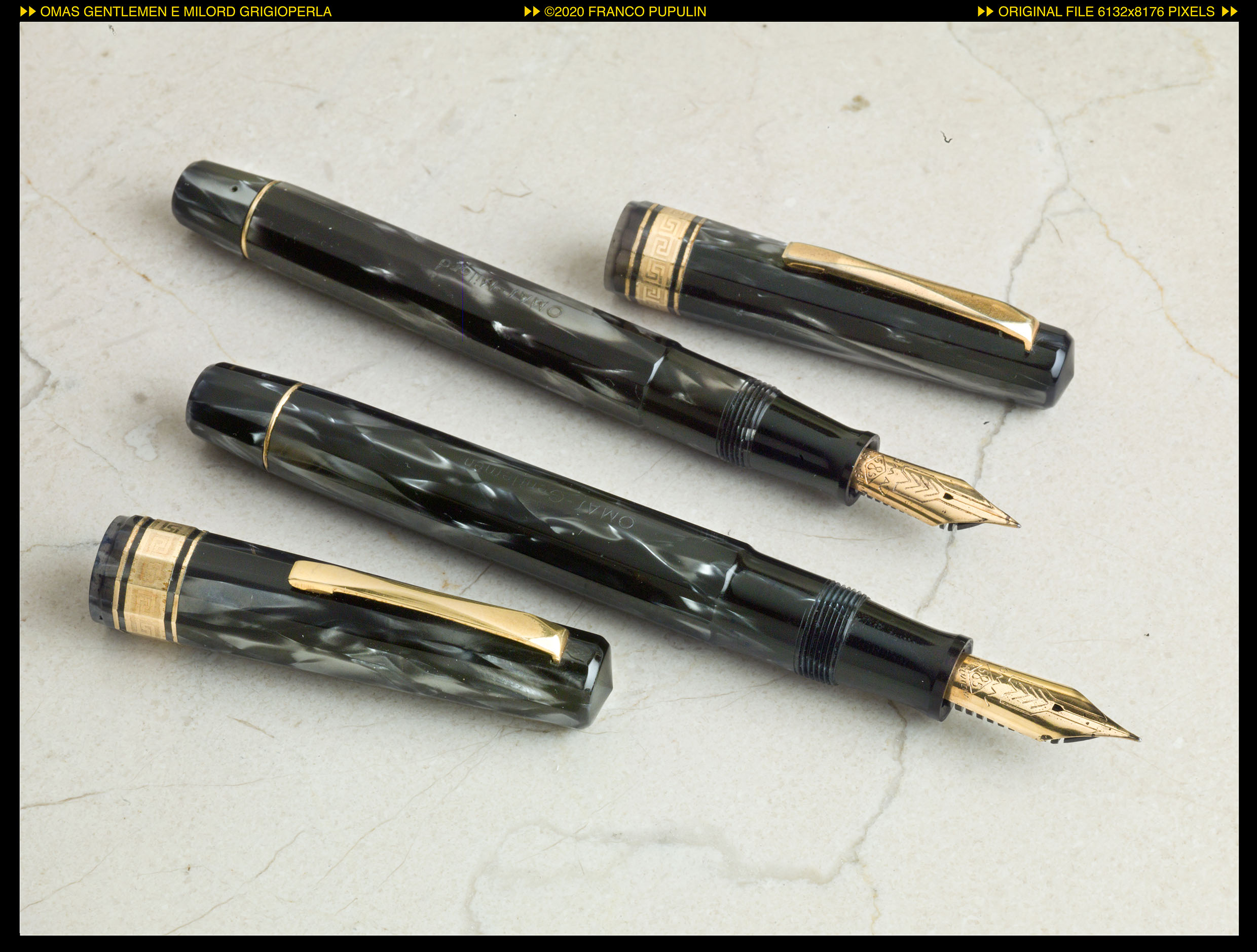 Come ha fatto giustamente notare Francesco, la celluloide Grigioperla di OMAS con il tempo può assumere una certa “dominante” di colore, che probabilmente dipende tanto dal dove e come è stata conservata quanto dal colore degli inchiostri con i quali è stata utilizzata. Come si può notare nelle fotografie più sopra, la Gentlemen ha mantenuto un tono neutro, mentre la Milord ha appena una sfumatura più calda, più rossa. Mia figlia Carlotta ha una 555-F degli anni ‘50, sempre nella stessa celluloide, leggermente virata verso il verde.