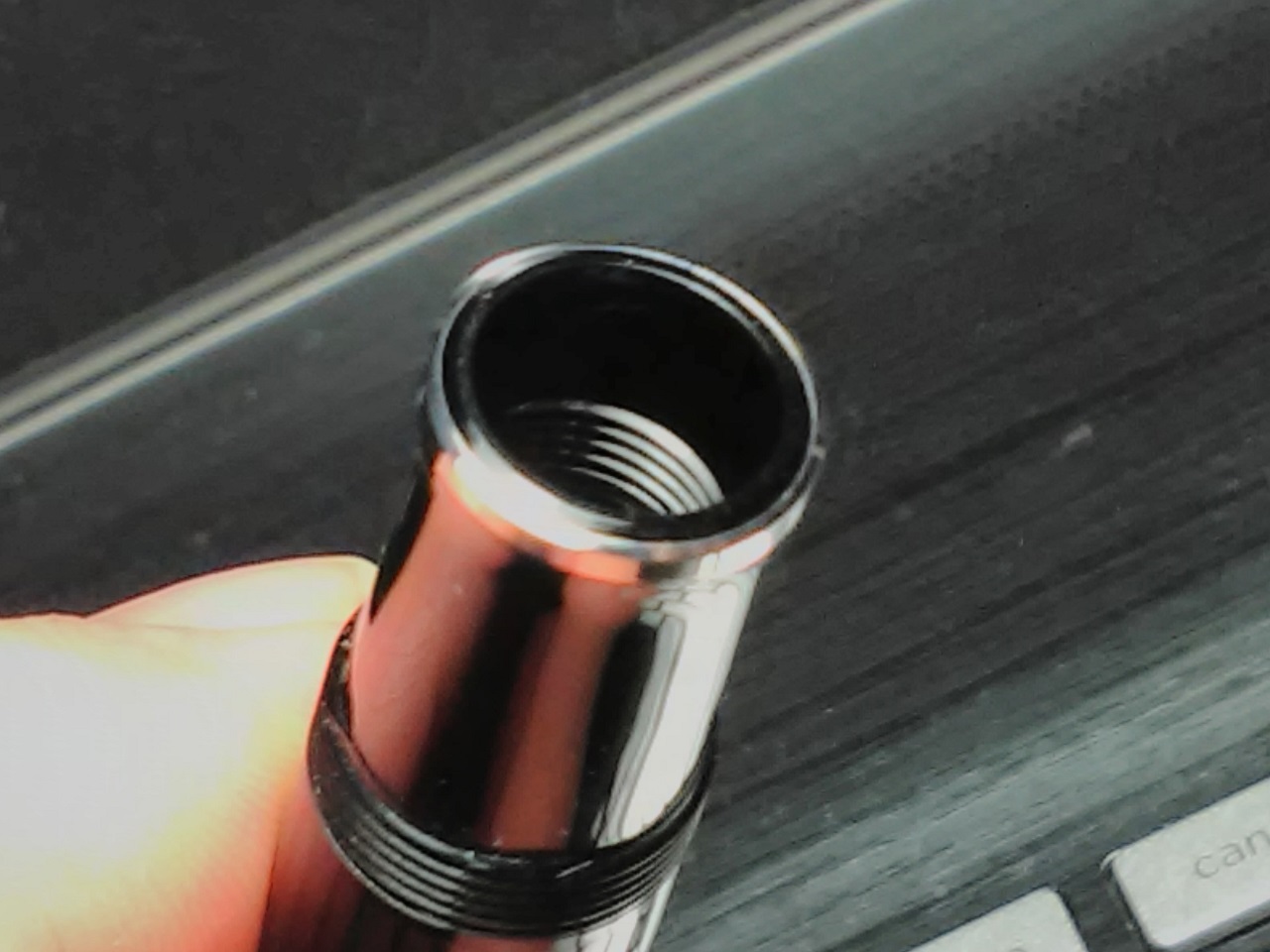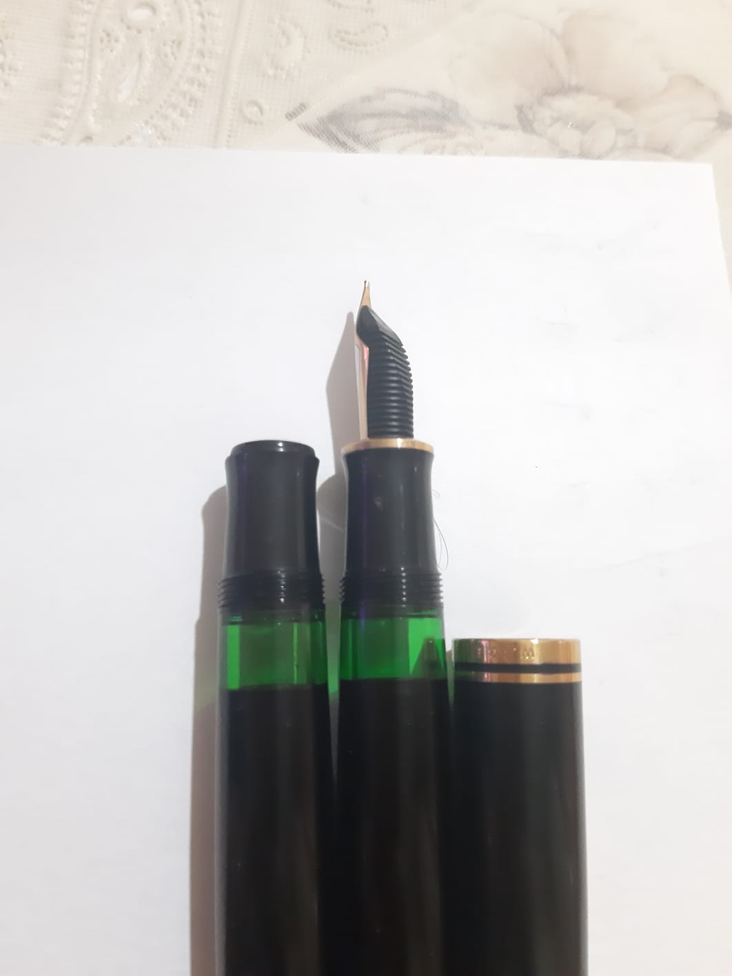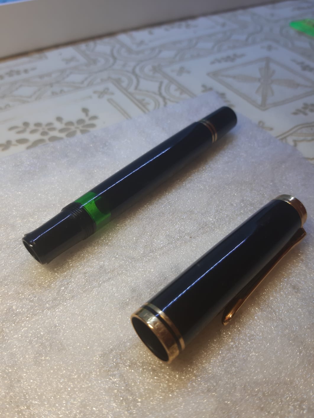 Scrivo questo post per chiedere lumi sul corpo di una M800 che sto cercando da un po' perchè mi avanza un pennino. Ne avrei trovato uno ma il venditore mi dice che, siccome manca la rondellina dorata, non si riesce ad avvitare il pennino. A questo punto chiedo delle foto perchè, da che mi risulti, la rondellina è solo decorativa e non ha nulla a che vedere con l'avvitamento del pennino (corregetemi se mi sbaglio.) Vi allego le foto che mi sono state fornite. Io sono molto scettica ma evito di dire cosa penso perchè con le penne ci so solo scrivere e non so fare altro, quindi lascio la parola agli esperti! Secondo voi quale problema potrebbe impedire al pennino di avvitarsi?