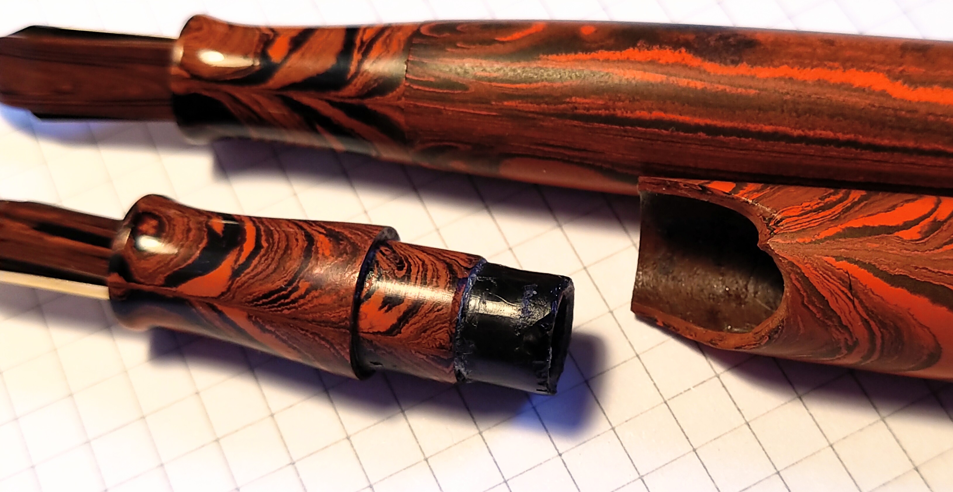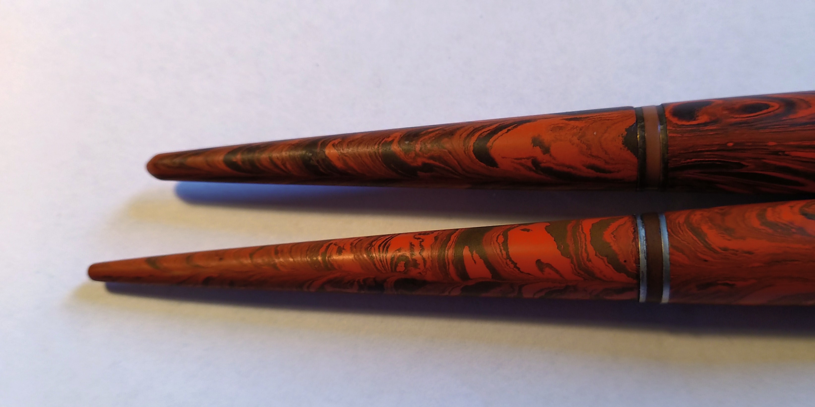 Per quanto riguarda le penne stesse, la Pink come hai notato presenta la parte terminale accorciata, in aggiunta il corpo non sembra avere alcuna scritta. Probabilmente si saranno cancellate, essendo sulla nera appena leggibili. Altro dettaglio che mi rende perplesso è la trama dell'ebanite: sulla Pink vi sono meno volute rispetto alla Black, perciò inizialmente pensavo che il corpo della Pink fosse stato sostituito. Potrebbe anche trattarsi di una differente miscelazione che ha portato ad una penna meno Ripple e piu lineare.