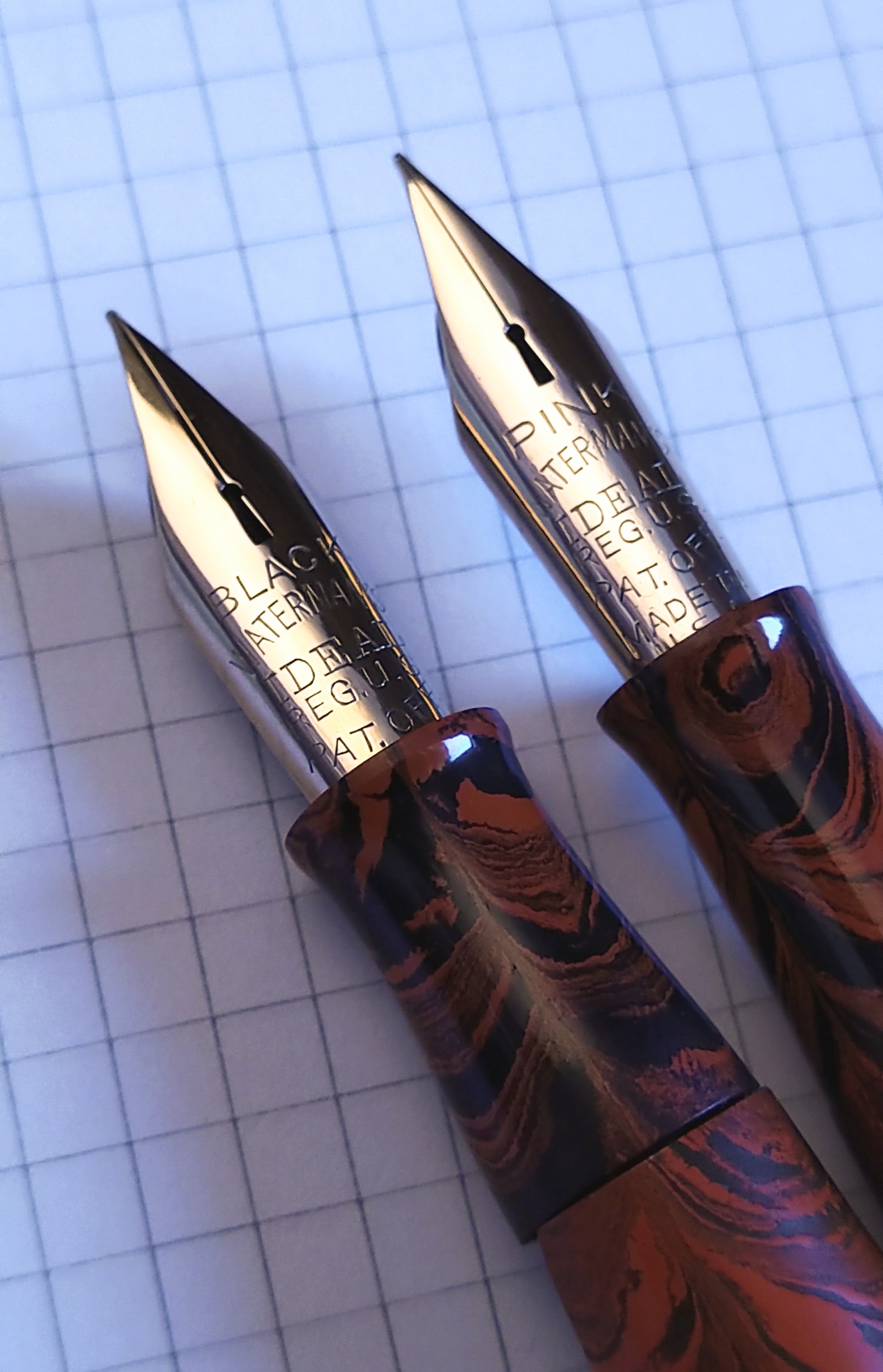 I pennini mi hanno letteralmente lasciato di stucco: di una bellezza mozzafiato, non solo alla vista ma soprattutto nella scrittura. La flessibilità di ciascuno è impressionante, ma provato nulla del genere. Il Black è un po' più flessibile del Pink, e di partenza ha un tratto lievemente più ampio del Pink.