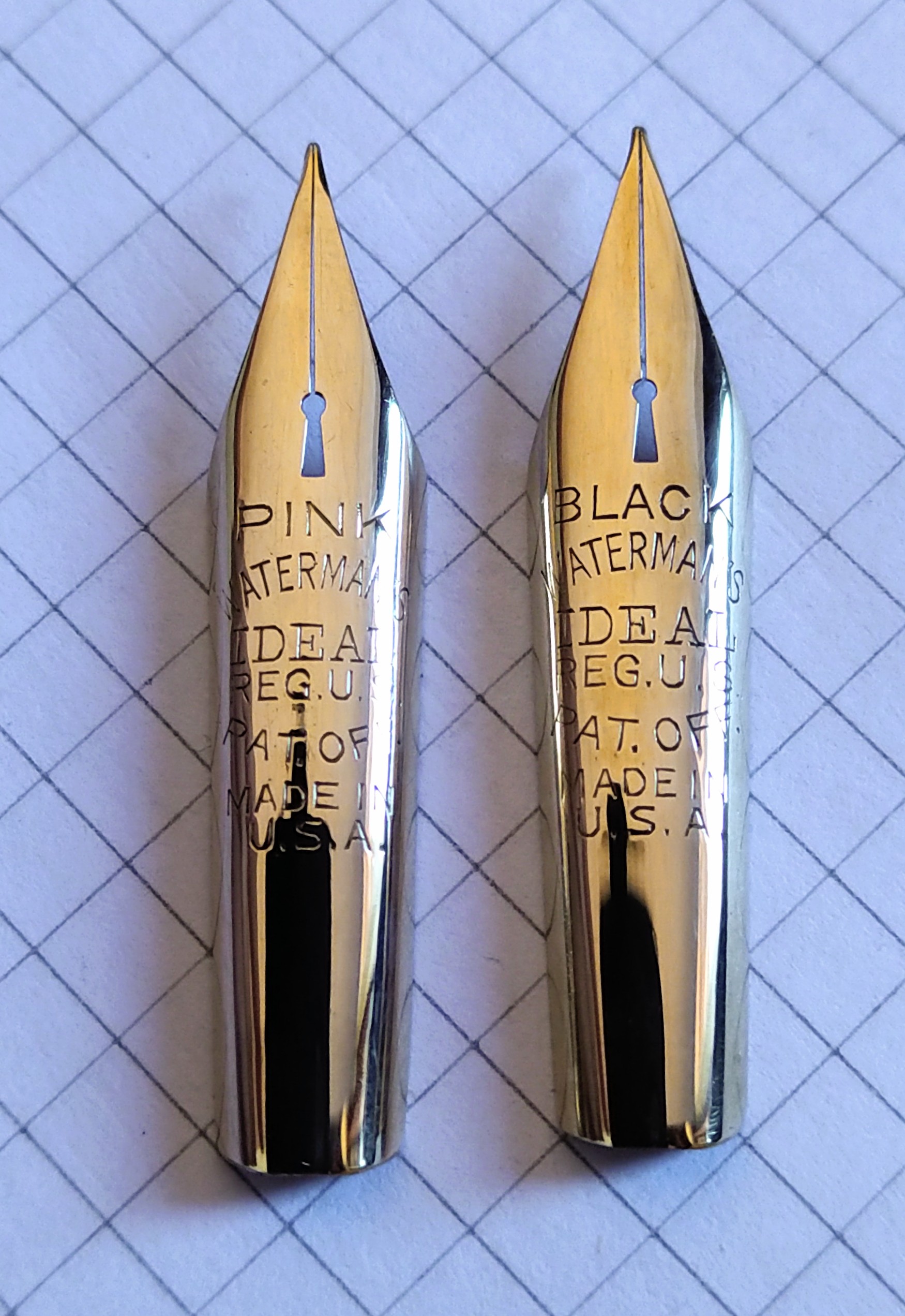 Ciò che mi colpì di più furono due anellini colorati posti verso il fondo delle penne, uno di colore rosa e uno di colore nero un po' ingiallito. I due anelli stanno a rappresentare i "colori" dei pennini con cui erano dotate le penne. La faccenda dei "colori" è in realtà un'idea di Waterman per suddividere in diverse categorie (inizialmente sei poi ampliate a dieci) i pennini in base alle caratteristiche meccaniche degli stessi, dedicati così a sei differenti utilizzi.