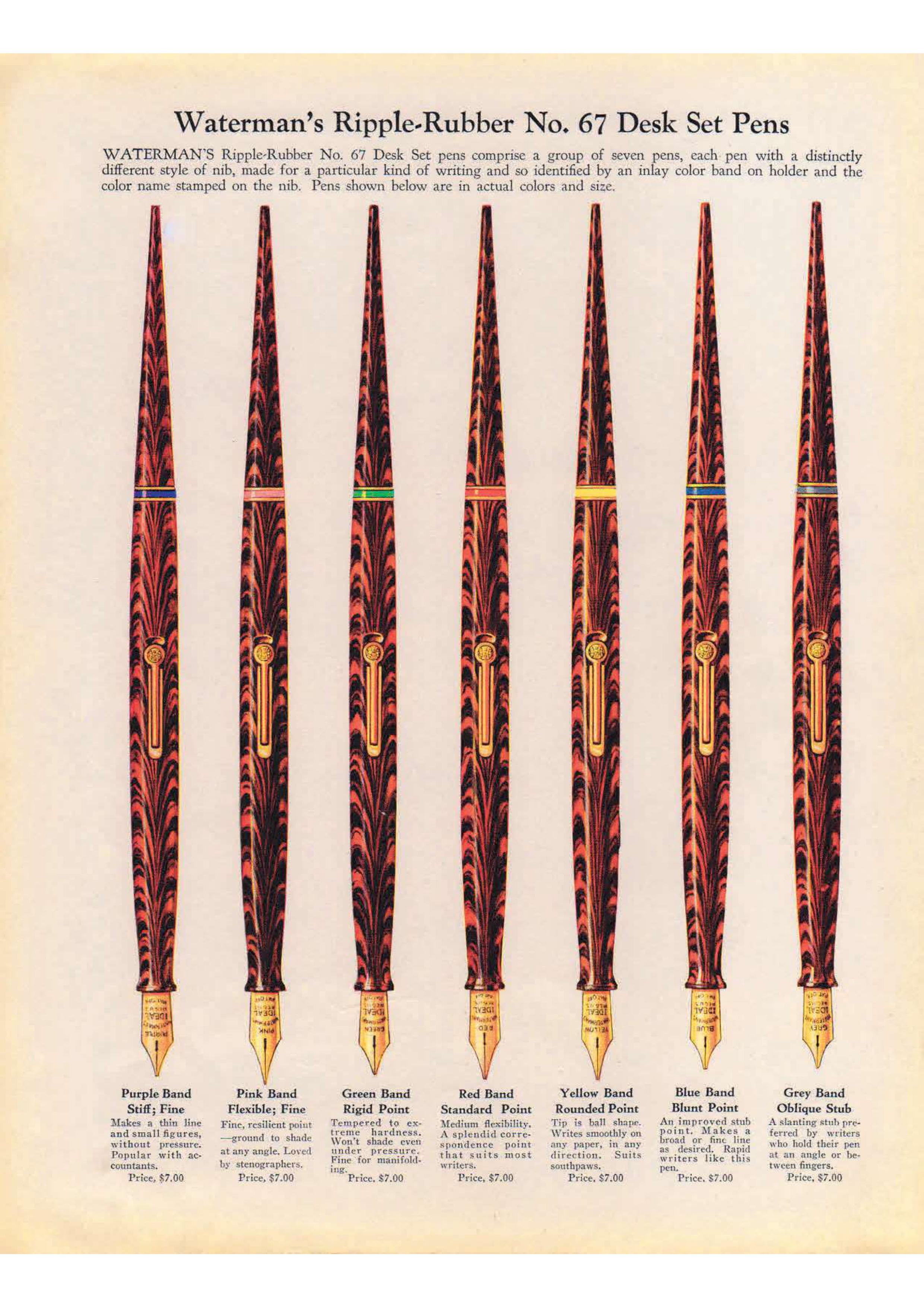 Veniamo alle penne che per gli stilofori erano di due taglie: le più grandi, chiamate 67, e le standard 62 1/2, ma solo le prime montavano pennini con codice colore e lo sfiato a foro della serratura (qui sotto nel catalogo 1928). I due pennini sono rari (rarissimo il nero: è solo la seconda volta che lo vedo sul nostro Forum) e preziosissimi per le loro prestazioni eccezionali!!!