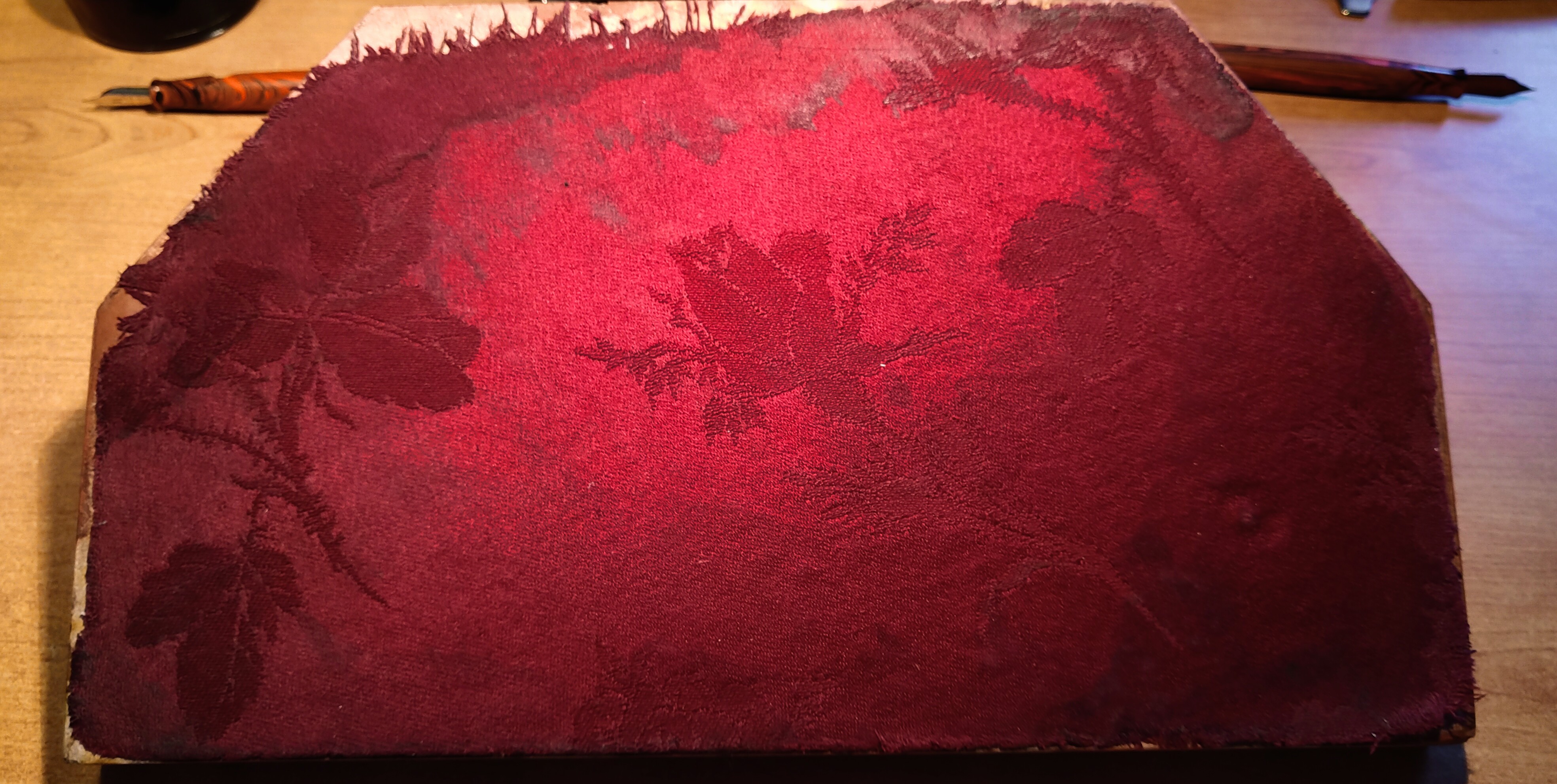 Ritornando alle penne, purtroppo la base non presenta alcun feltro verde al di sotto, ma al posto vi è una copertura di stoffa rossa bordeaux (non saprei dire se di raso o di un altro tessuto) decorata con dei fiori, ai lati un po' rovinata. Al tatto posso avvertire che i due calici sono tenuti in sede da due dadi, perciò ci deve essere una vite all'interno.
