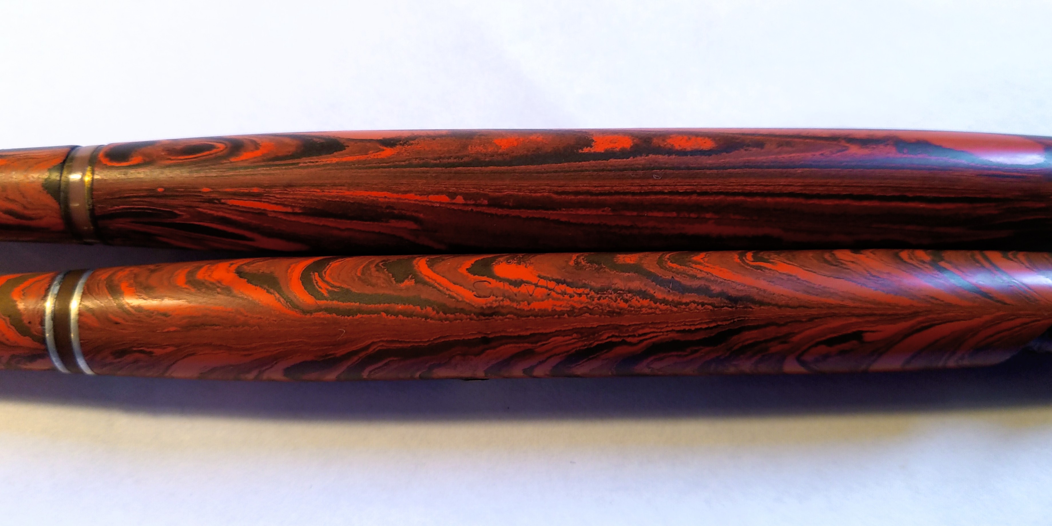 Bellissimo set, complimenti. Ľebanite Red Ripple è sempre affascinante. La differenza di volute nel materiale dei due stilofori, a mio parere nulla di strano, sarà sicuramente dovuta alla fattura assolutamente artigianale del materiale.