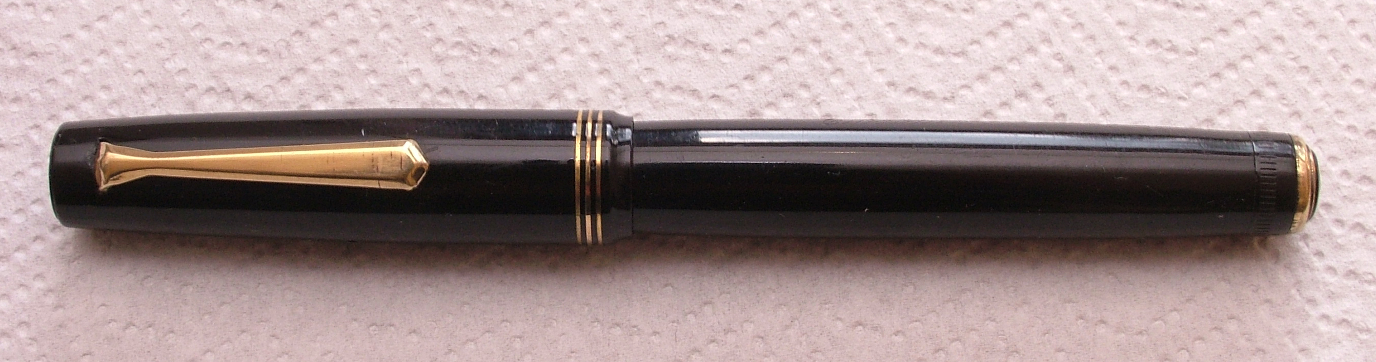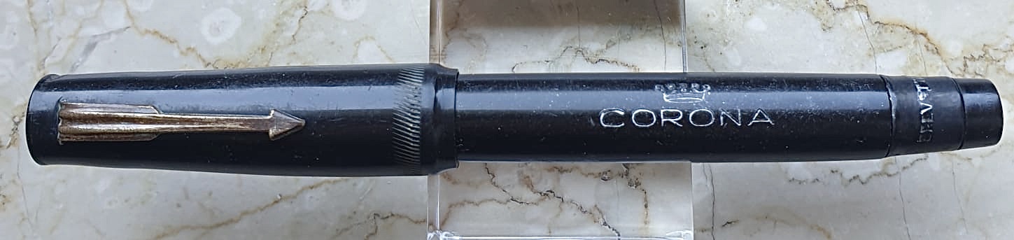 Stilografica Corona (nome sinistramente... di moda da qualche mese!), di Luigi Vigorelli, Milano 1944. Interessantissimo il caricamento brevettato: il coperchietto di fondo contiene un cerchietto in ottone con due camme (vedi foto). Ruotando questo, si ottiene la pressione che, piegando la molla, riempie il sacchetto di gomma. Stesso principio a levetta di fondo che avevano utilizzato Curzons e Debrett’s negli anni ‘20, e Aurora negli anni ‘30.