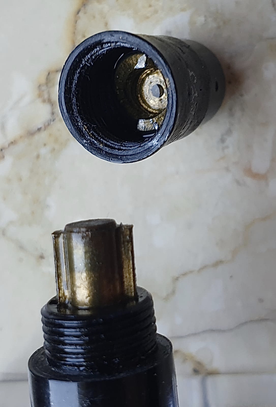 MaBaskirotto ha scritto: venerdì 29 maggio 2020, 14:23 Stilografica Corona (nome sinistramente... di moda da qualche mese!), di Luigi Vigorelli, Milano 1944. Interessantissimo il caricamento brevettato: il coperchietto di fondo contiene un cerchietto in ottone con due camme (vedi foto). Ruotando questo, si ottiene la pressione che, piegando la molla, riempie il sacchetto di gomma. Stesso principio a levetta di fondo che avevano utilizzato Curzons e Debrett’s negli anni ‘20, e Aurora negli anni ‘30.