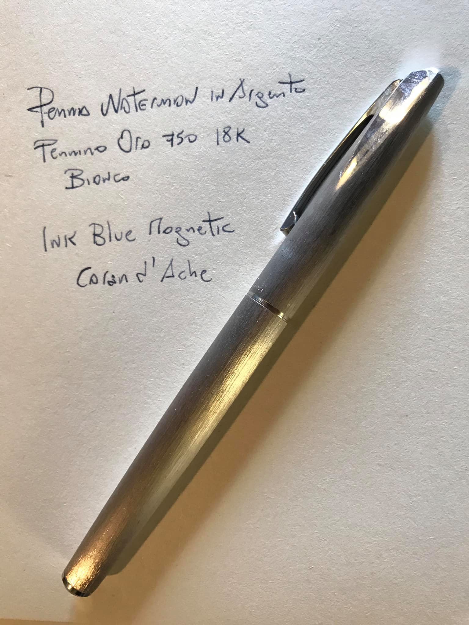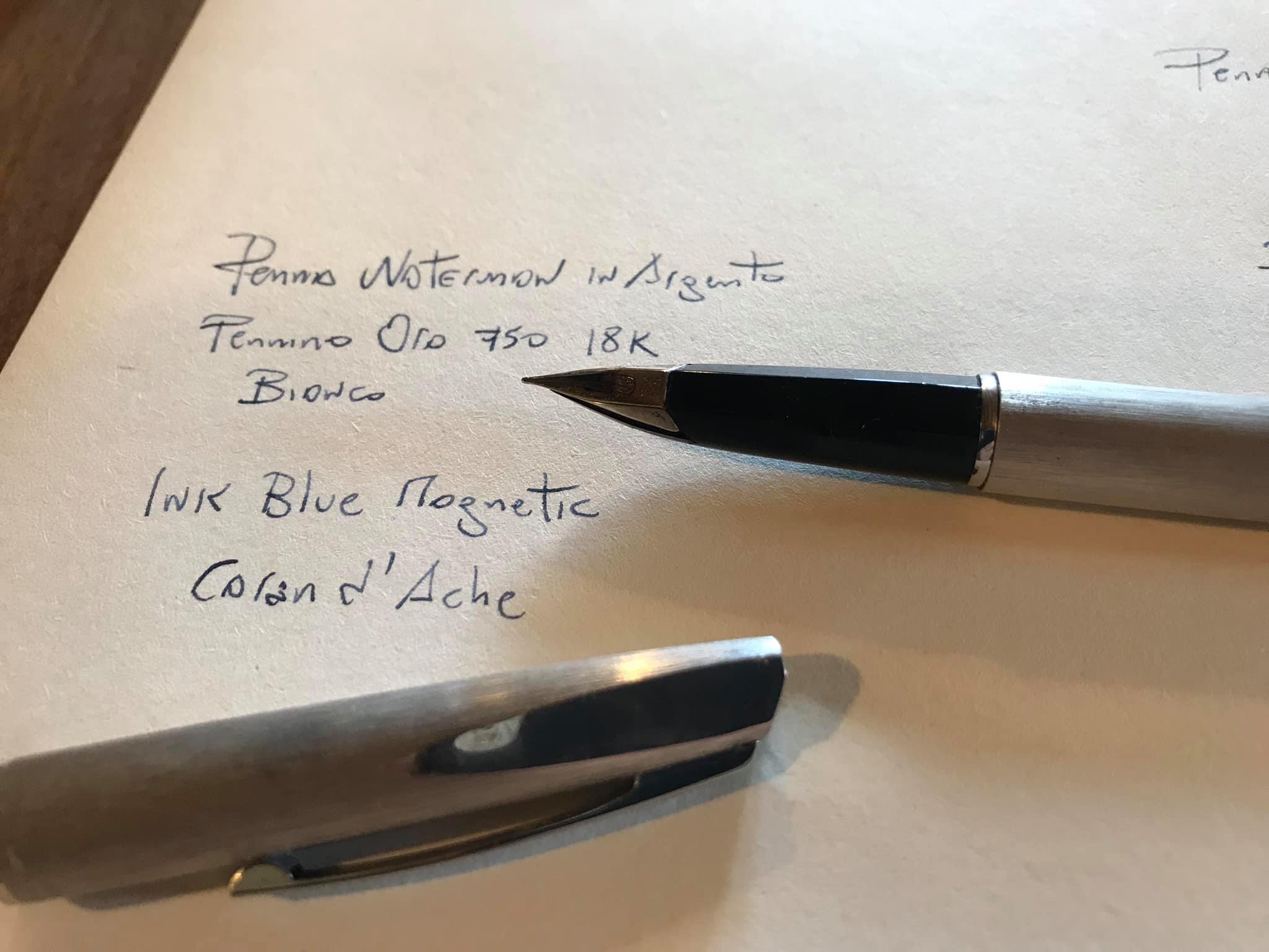 Oggi ho comprato a un prezzo che mi pare buono (35 euro) una stilografica waterman (con imballo) in argento con pennino in oro bianco 750 18K. Pennino fine.