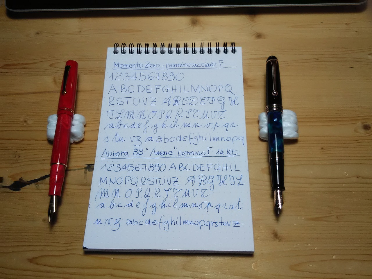Ecco una breve comparazione tra la 88 Amare e la Momento Zero Corallo. La prima con un pennino F in oro 14 kt e la seconda con un pennino Bock F in acciaio dorato. L'Aurora caricata con una miscela di Iroshizuku e la seconda caricata con la sua cartuccia di serie. La vera sorpresa è stato il pennino Bock, ero talmente abituato alla loro rigidità che questo mi ha veramente sorpreso. Oltre alla scorrevolezza possiede quel ninin di elasticità che lo rende morbido nella scrittura e molto piacevole nell'uso. Il pennino della 88, anche se più rigido,ha il fascino del feedback (come si dice) caratteristica che non mi dispiace affatto. A chi interessa la carta è la Rhodia 80 g/mq.