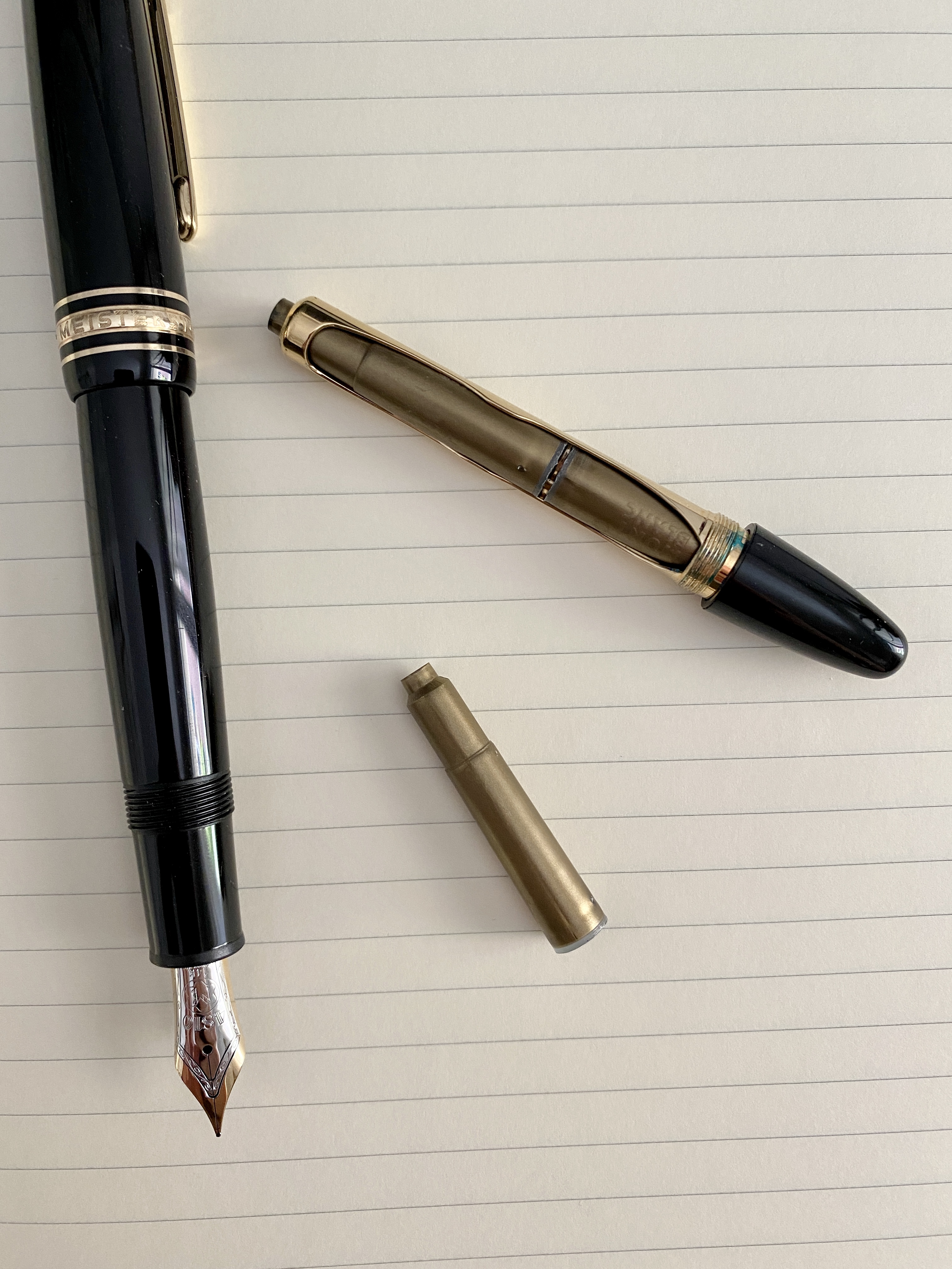 Nella Montblanc 147, sono necessarie 2 cartucce alla volta. Dentro all’apposito astuccio, ne ho trovata una “vuota” e ho pensato di riempirla con un inchiostro che ho in casa. Ma avrei un paio di splende: