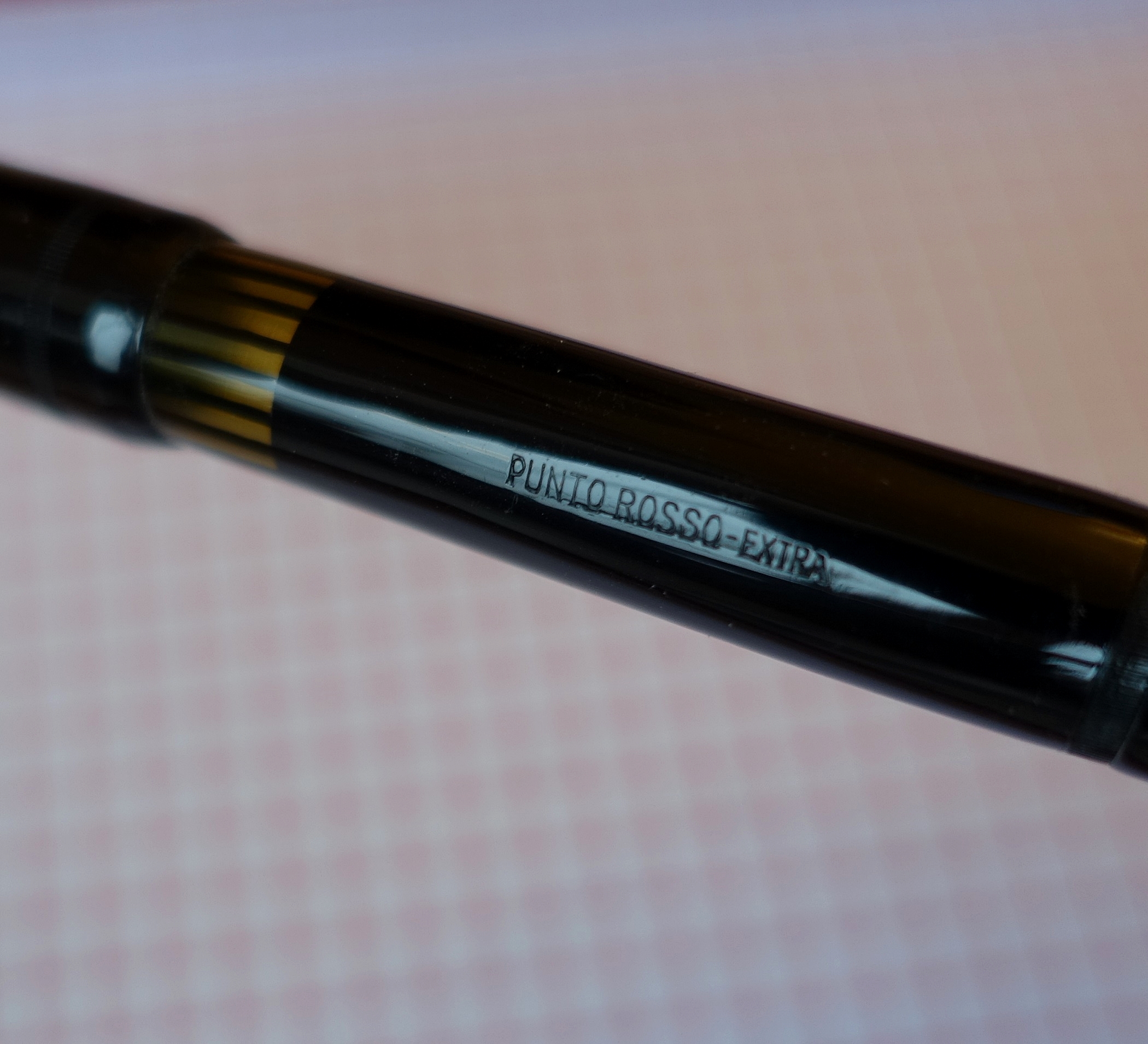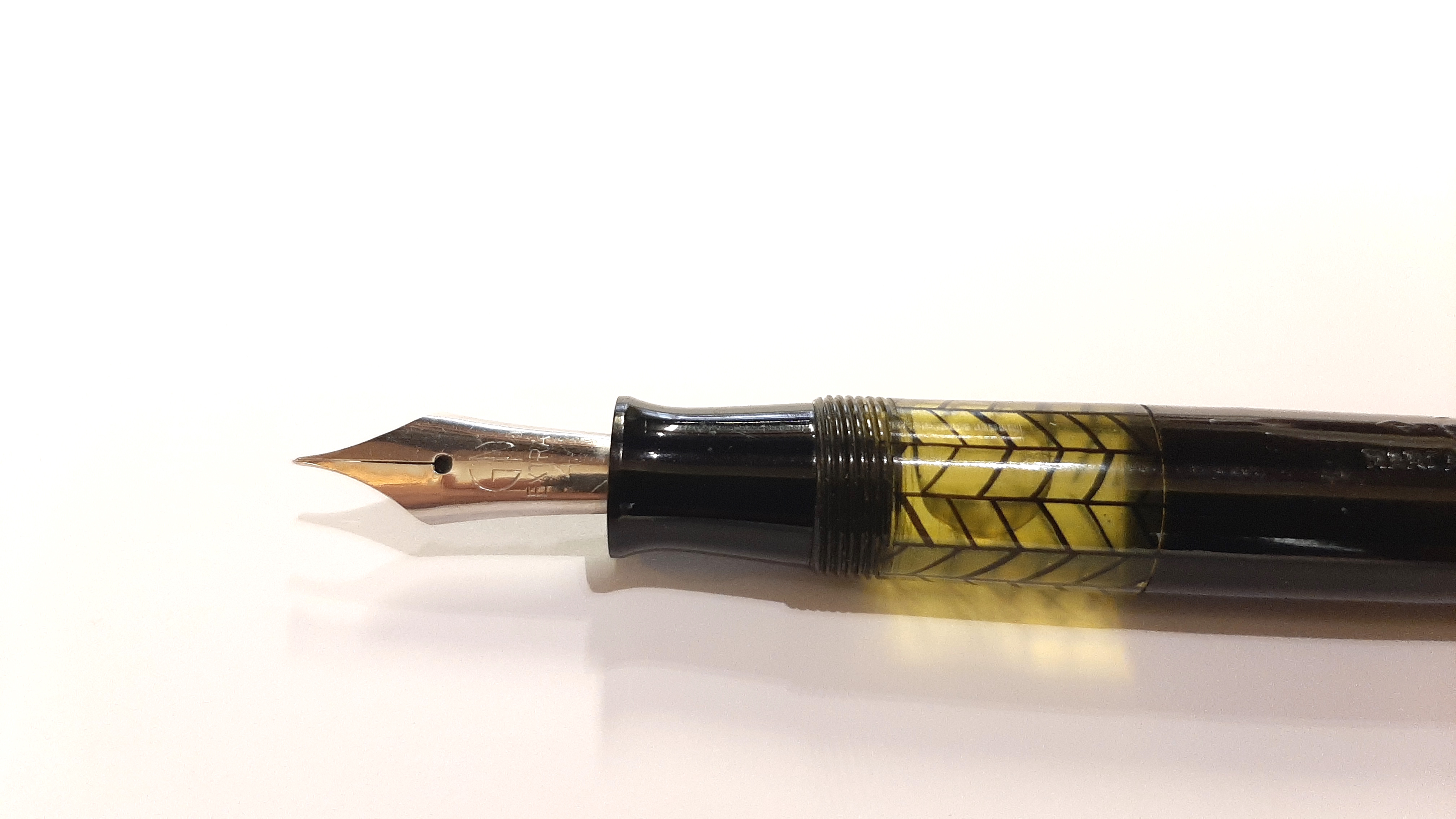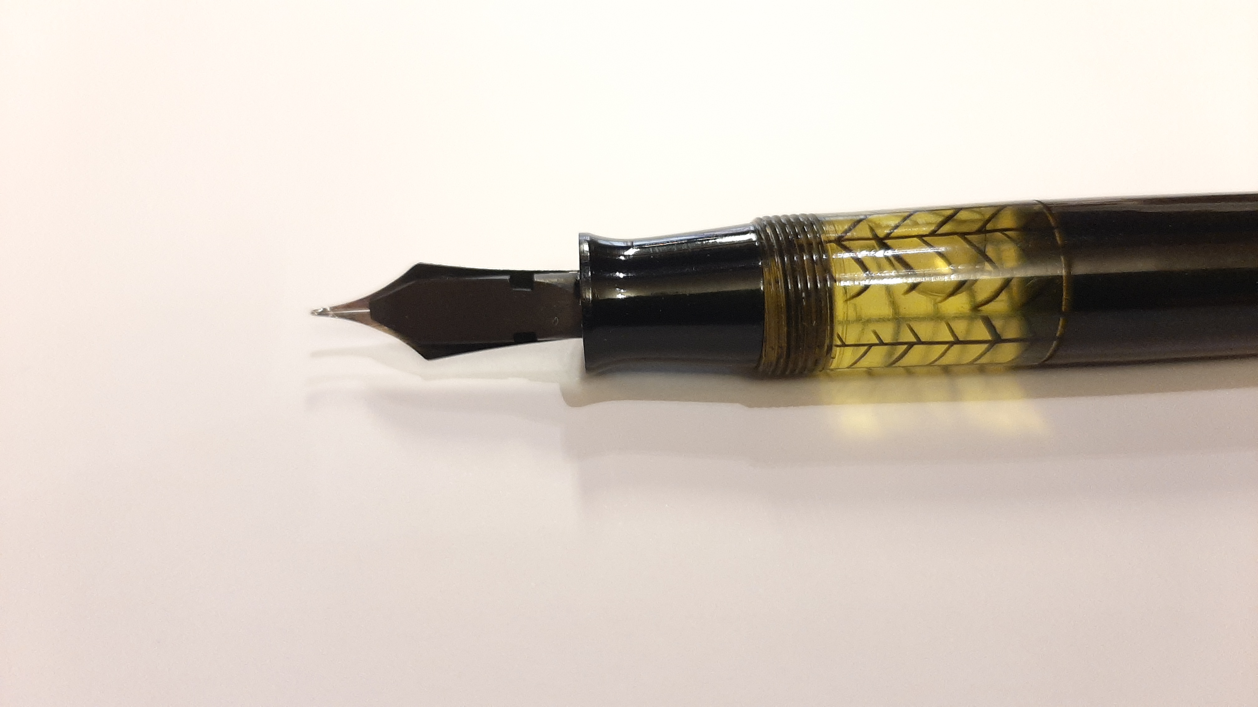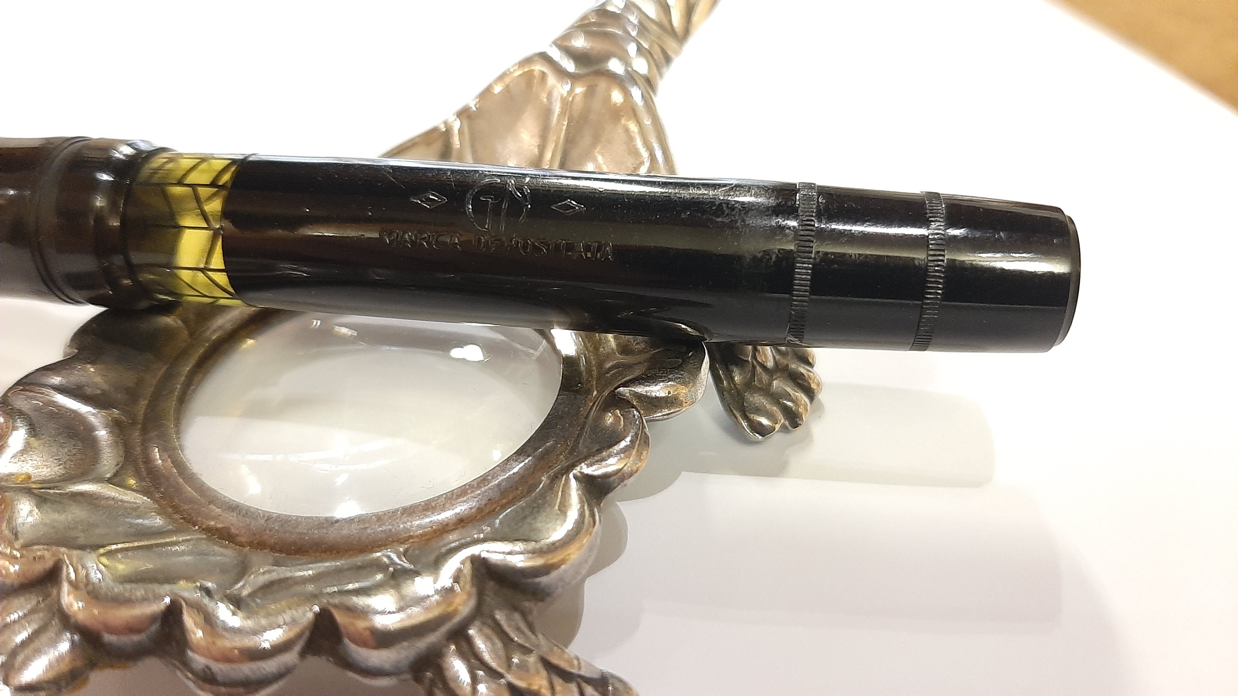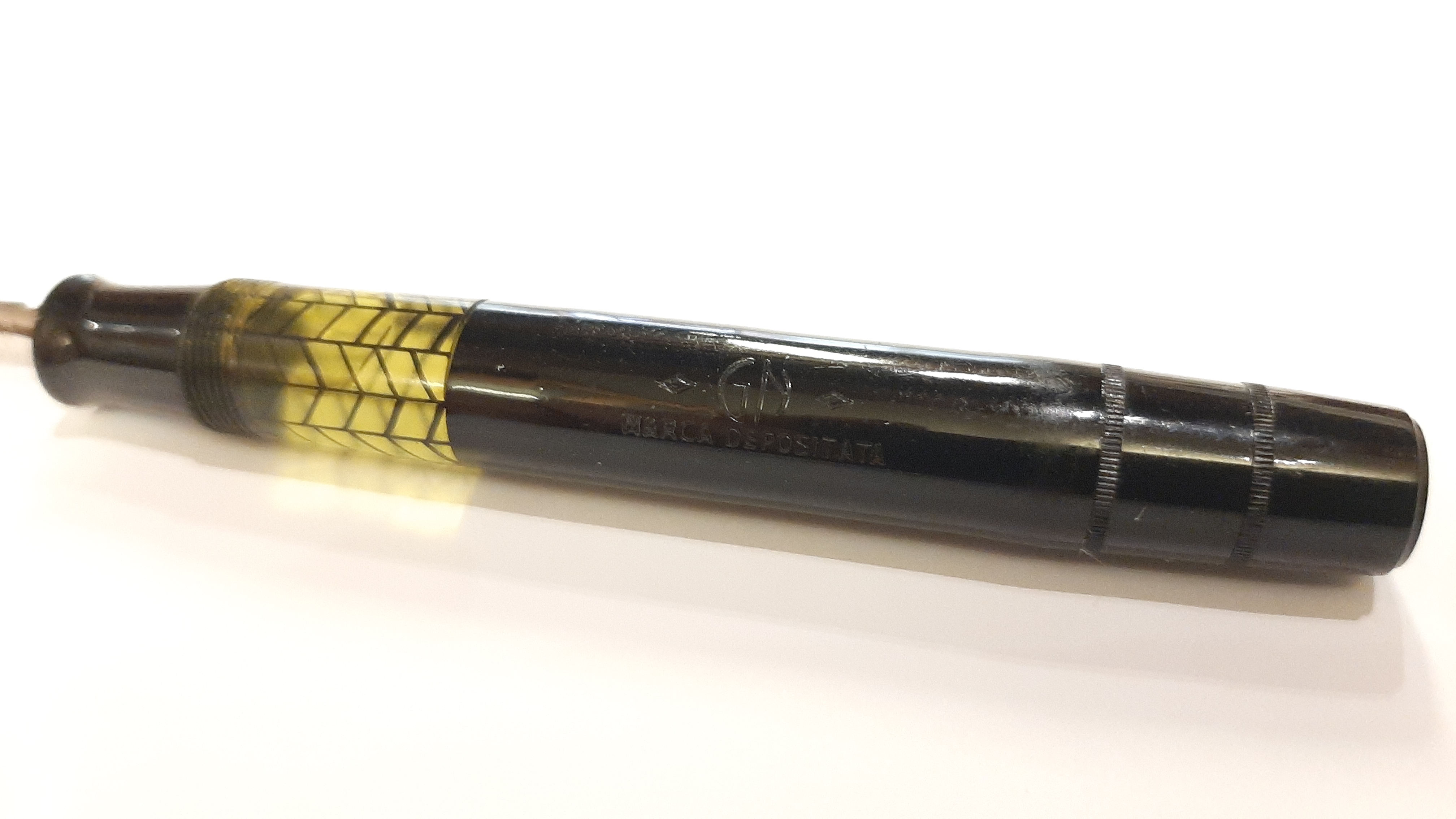 Ultimo ritrovamento questa penna che riporta la scritta "G N" di cui non sono riuscito a scoprire nulla. Misura 132 mm, carica a pistone con guarnizione in sughero, monta un meraviglioso pennino anch' esso marchiato G N dal tratto fine e di una flessibilità straordinaria. Fortunatamente sia la sezione che il pistone sono stati facilmente accessibili, la celluloide si è leggermente deformata in alcuni punti ma niente di catastrofico, manca la veretta sul cappuccio. Sebbene carichi abbastanza bene sto valutando se darle un sughero nuovo. Mi piace molto la finestrella perfettamente integra, denota che è stata una penna usata molto poco.