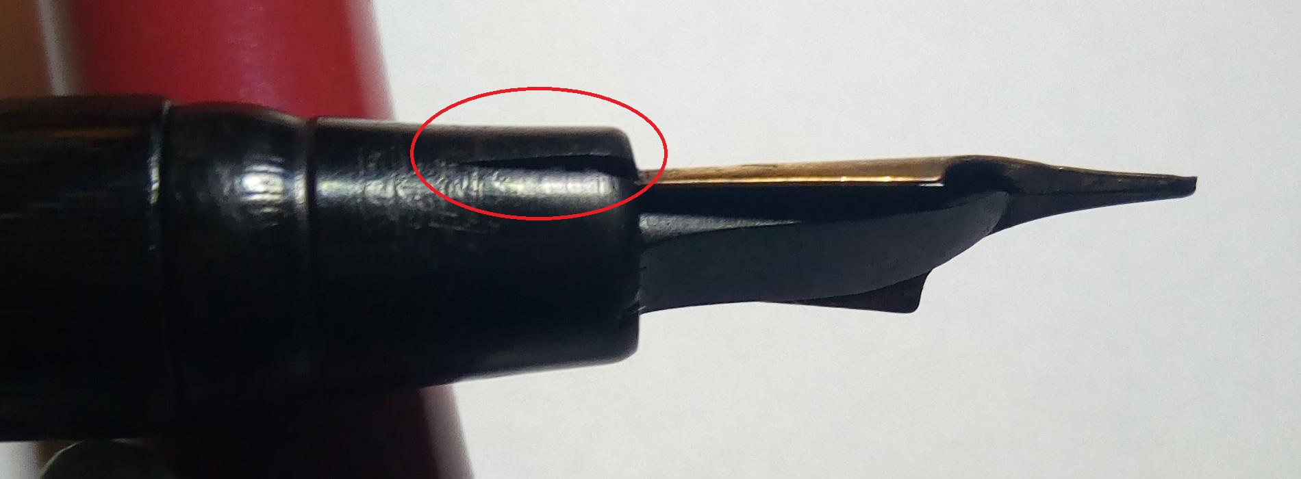 Immagino che tale fessurazione possa far sgocciolare l'inchiostro, cosicché mi domando se è una cosa normale (perché, ad esempio, frutto della mancanza di una guarnizione) o se il gruppo pennino/alimentatore sia stato malamente sostituito con uno non originale.
