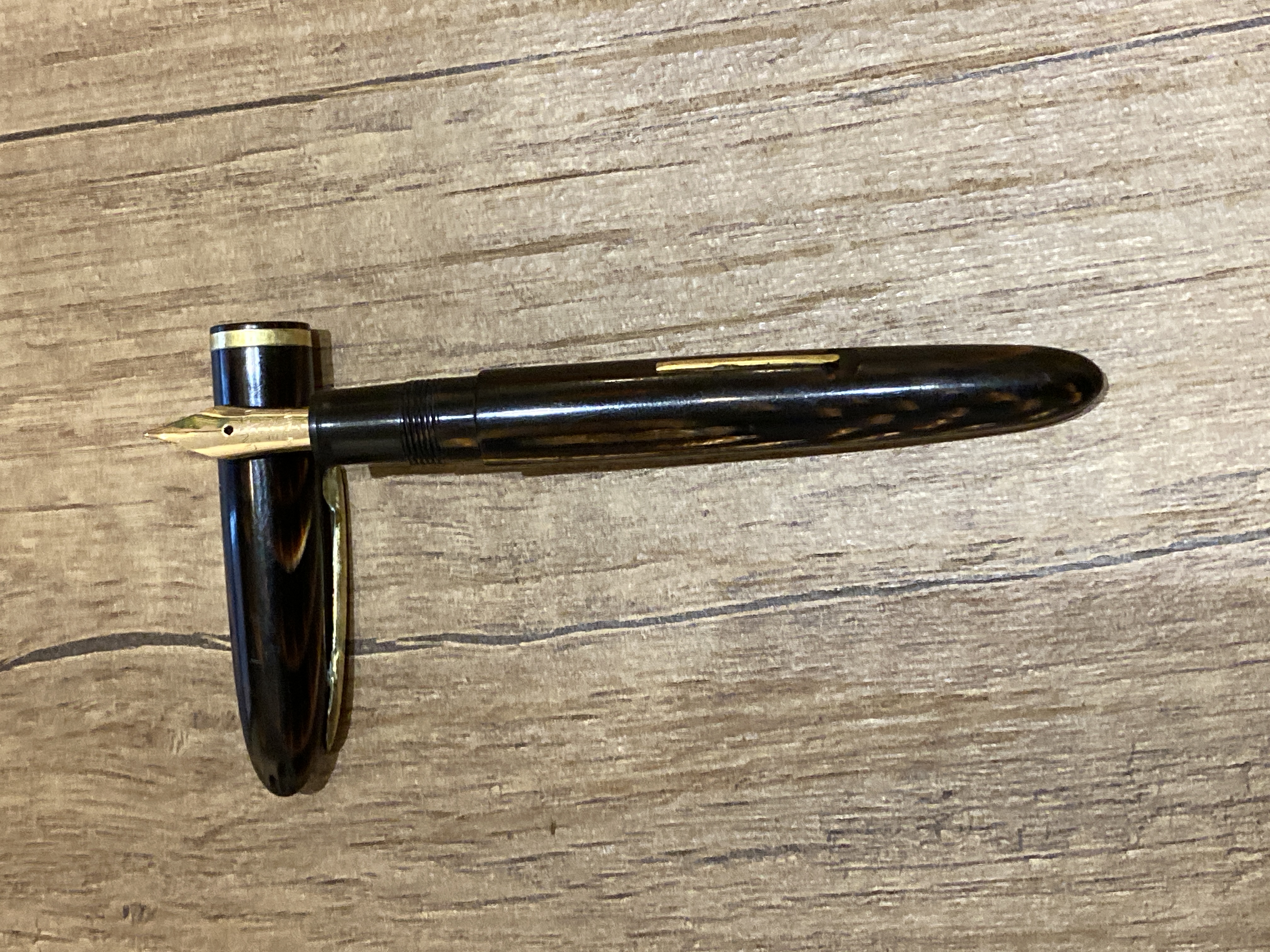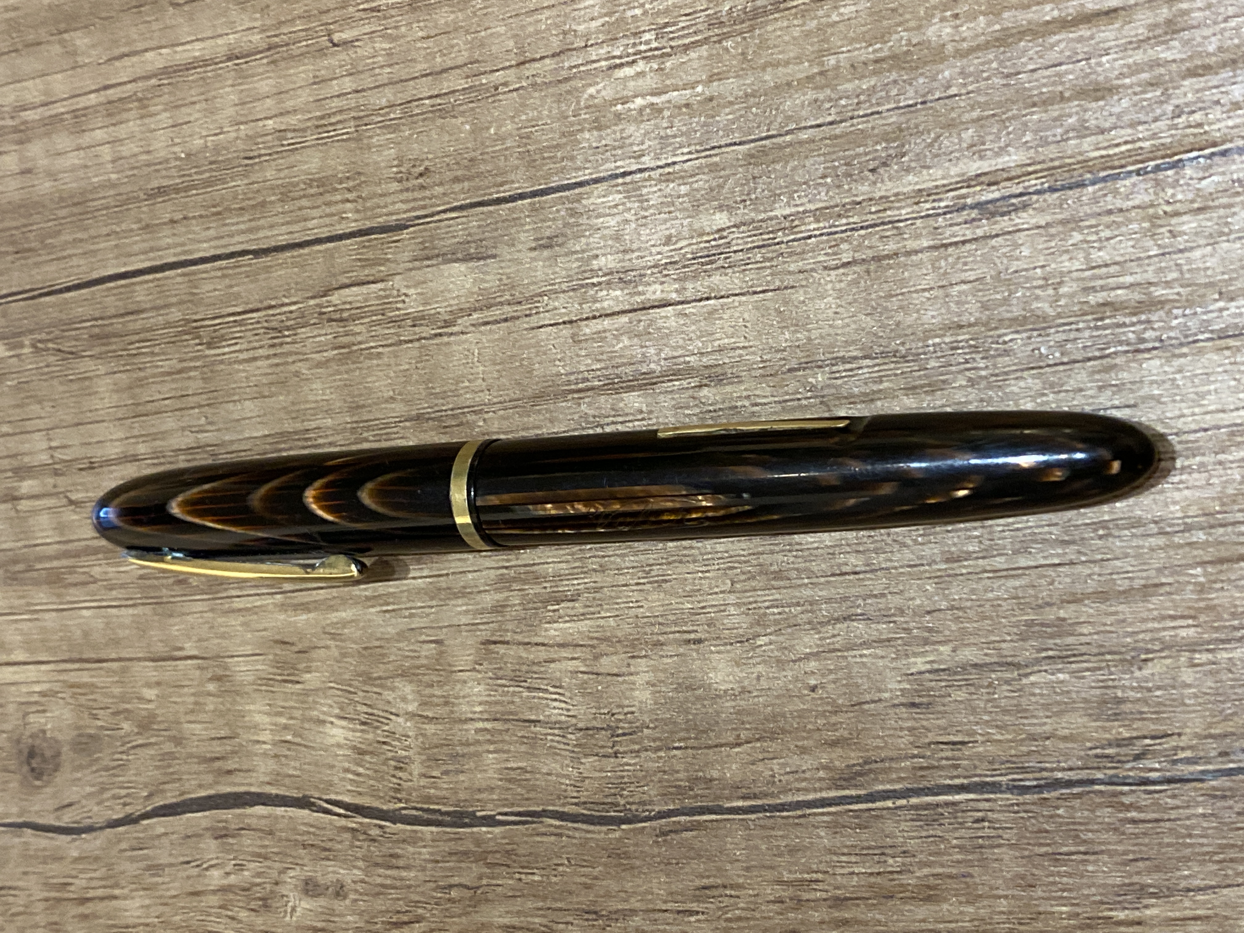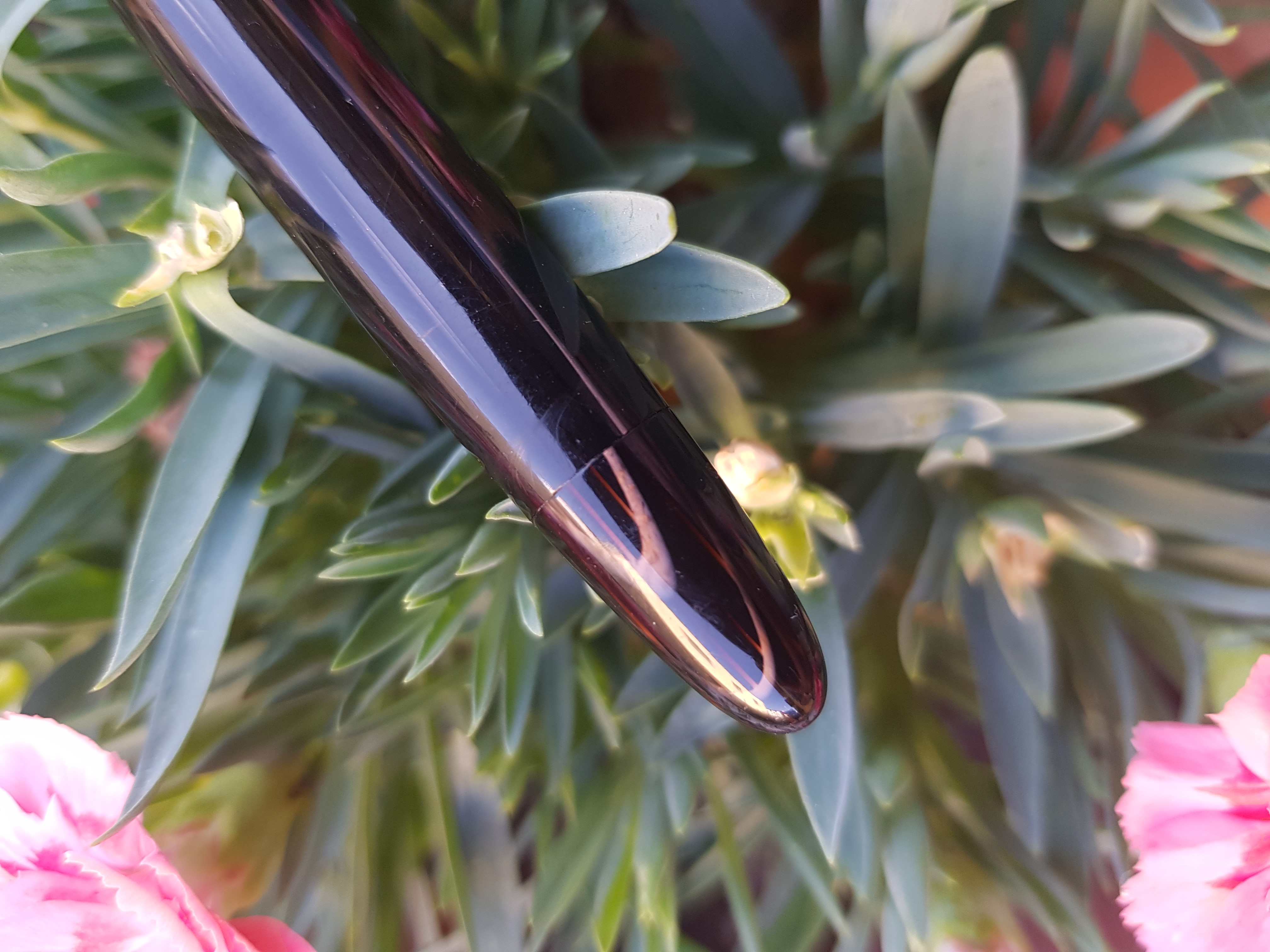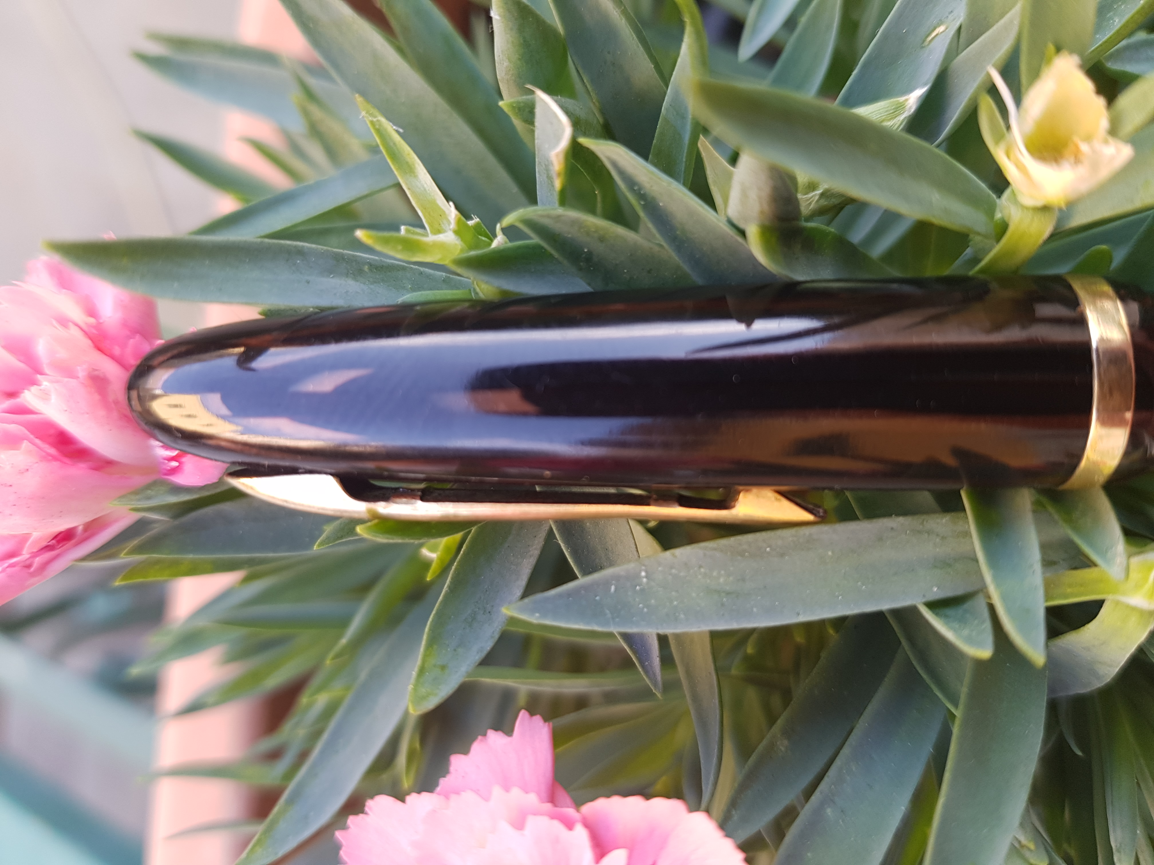 Cavolo si rassomigliano davvero tanto. La sola differenza che noto è sul fusto, la mia ha una rastrematura prima della filettatura, mentre la tua invece scende diritta fino alla sezione. La celluloide arco è bella proprio per questo non esistono due penne uguali, a questo aggiungi che il tempo ha sicuramente stagionato i materiali in maniera diversa ed ecco che si notano diverse luminosità e sfumature nella celluloide.