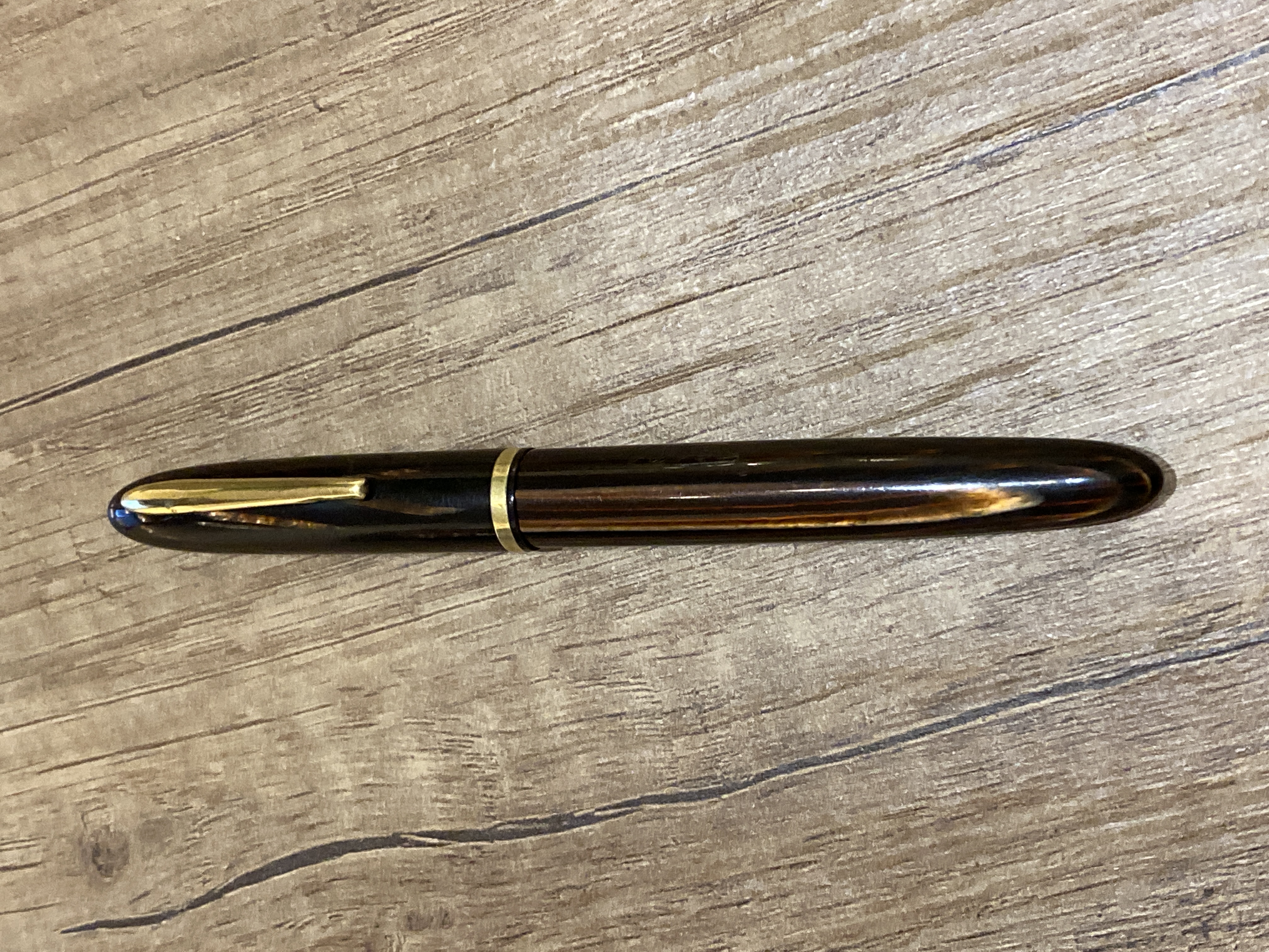 La penna è in celluloide Arco Marrone, non so se qualcuno ha avuto modo di accorgersene, ma è un materiale che mi piace un sacco, quando lo vedo mi si illumina l’animo.