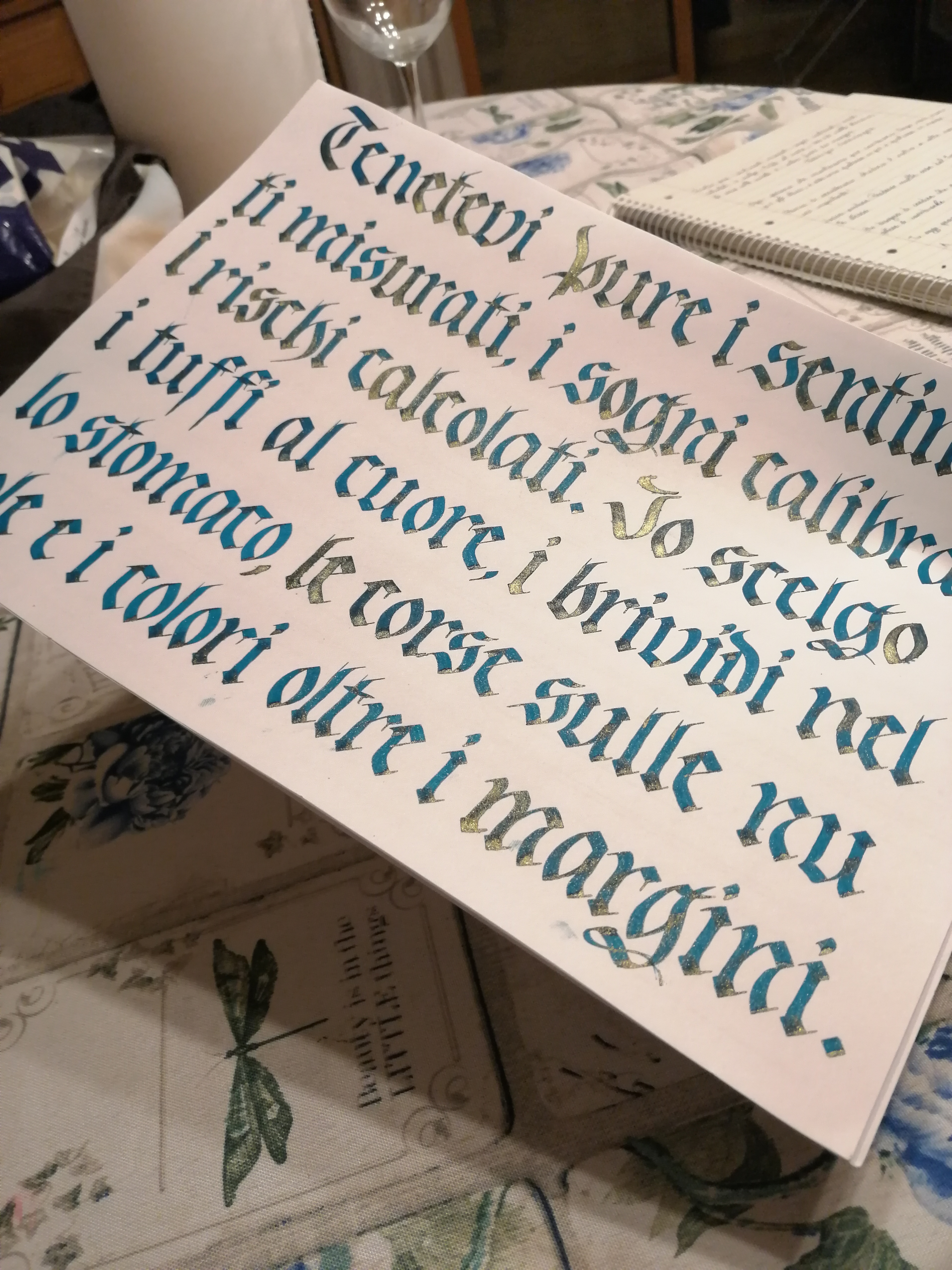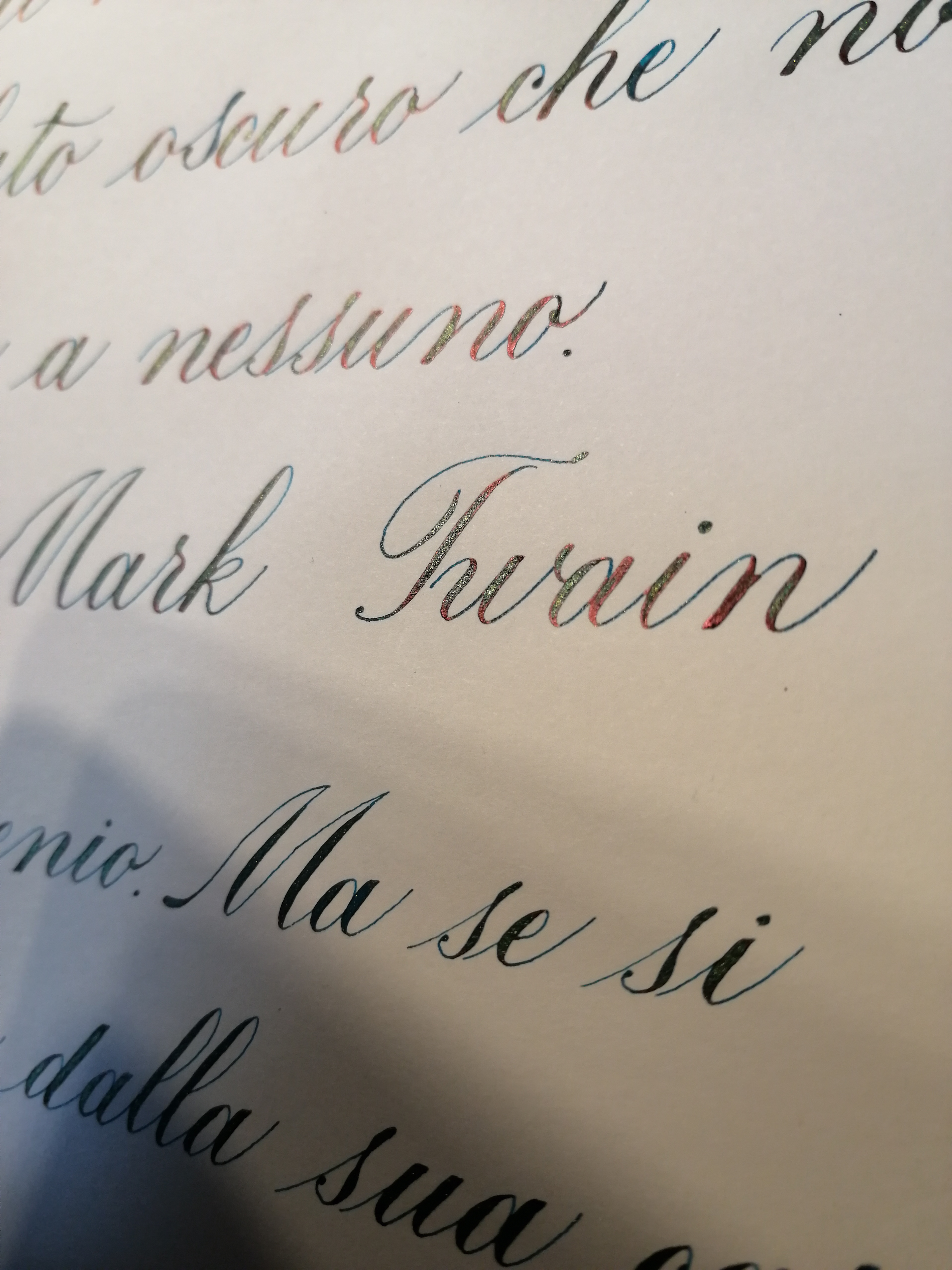 Stasera ho esercitato il gotico Fraktur con inchiostro Herbin Emerald de Chivor con pennino tronco 3 abbondante e carta Rodhia. Per esperienze passate mi spettavo un bel sbrilluccichio dorato con fondo verde smeraldo e tratti viranti al rosso...ma il rosso dov'é finito? Avendo messo un pó di inchiostro in un calamaio a parte per praticità (usare quello originale per intingere il pennino é uno scempio) ho pensato fosse quello il problema, ma non cambia (metà pagina é scritta direttamente dal calamaio per la felicità delle mie mani).