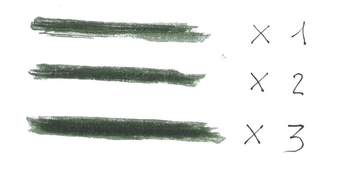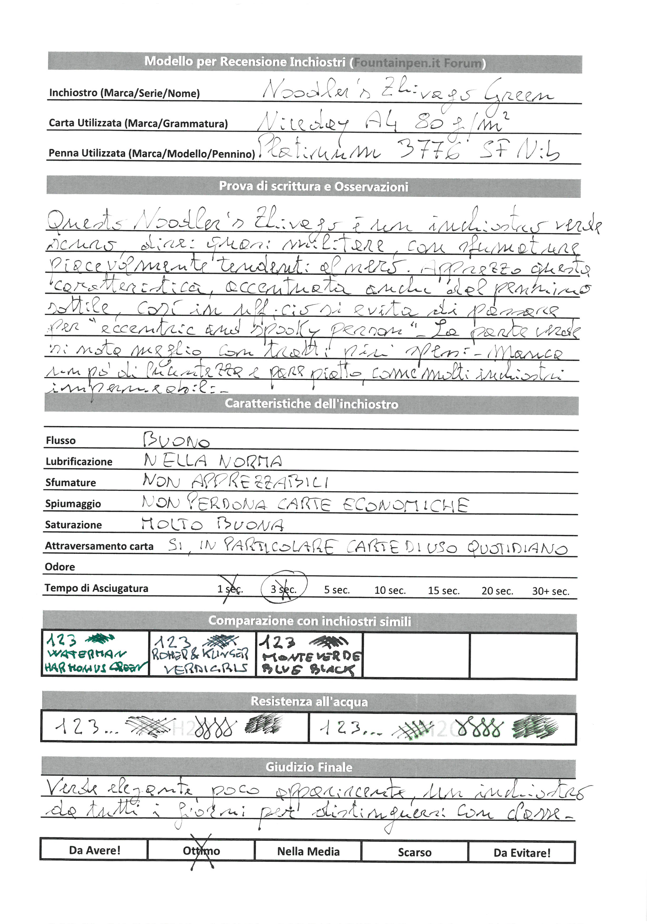 Personalmente ho molto apprezzato questo inchiostro dai toni molto scuri e militareschi. Come scrivo nella recensione, la vena verde esce soprattutto con pennini più abbondanti, mentre restando su tratti sottili il tono resta molto scuro.