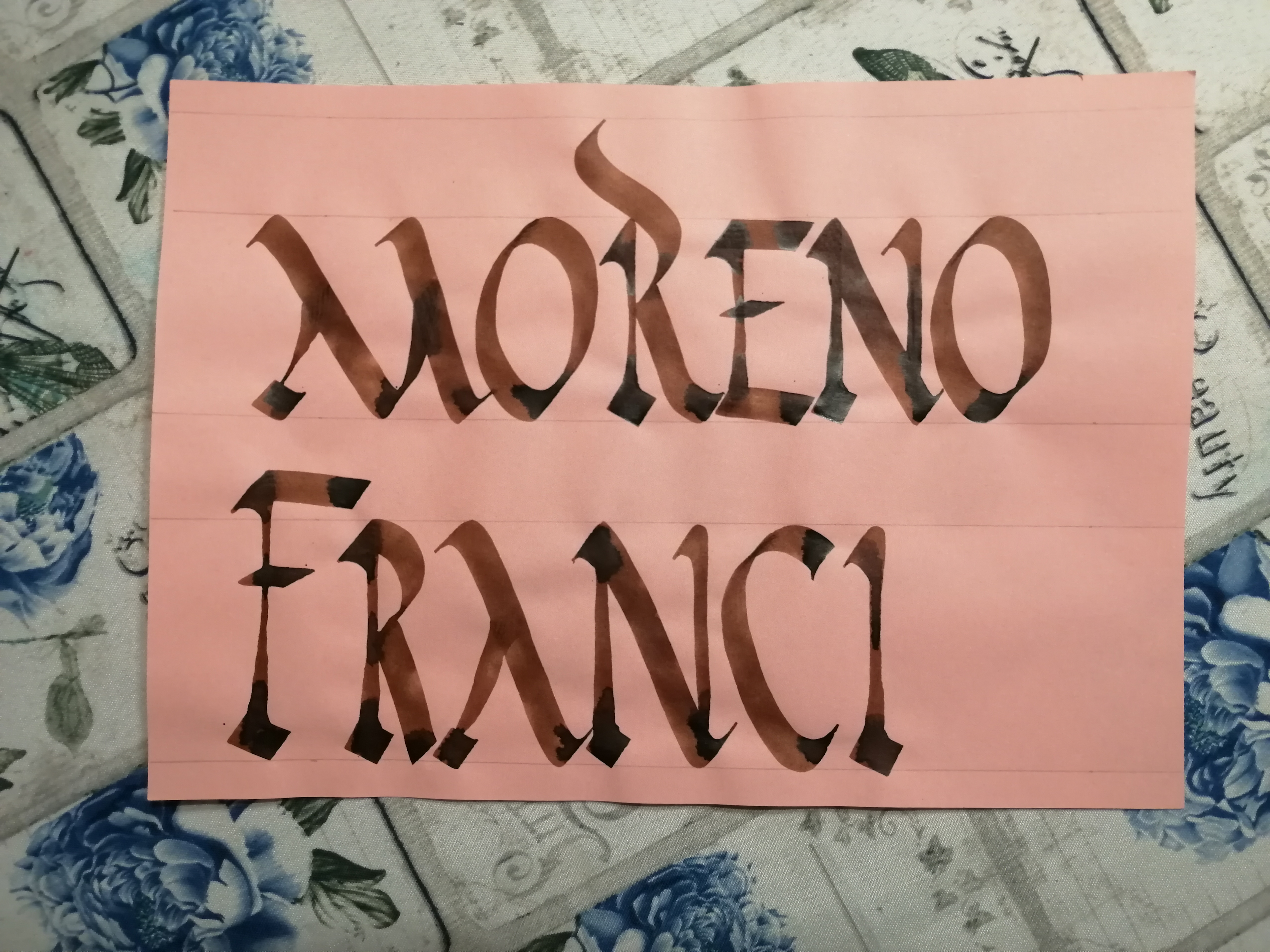 Buongiorno Dory, domenica 30 ho fatto anch'io il corso di rustica e devo ringraziarti perché, se non ricordo male, ne avevo avuto notizia proprio da un tuo post qui. Mi è piaciuto molto il corso e molto la scrittura, ma non ho ancora raggiunto il tuo livello. Ti allego l'ultima prova che ho scritto ieri( A3, Parallel per 3.8 e 2.4, carta Canson Croquis), non mi sono preoccupato molto delle rifiniture (in particolare dei piedi delle lettere) perché la misura contenuta della penna mi rende particolarmente difficoltoso il ritocco (a dir la verità anche con misure più larghe sovente i ritocchi mi vengono degli obbrobri inguardabili). Spero comunque di riuscire a migliorare.... magari approfitterò per chiederti qualche consiglio.