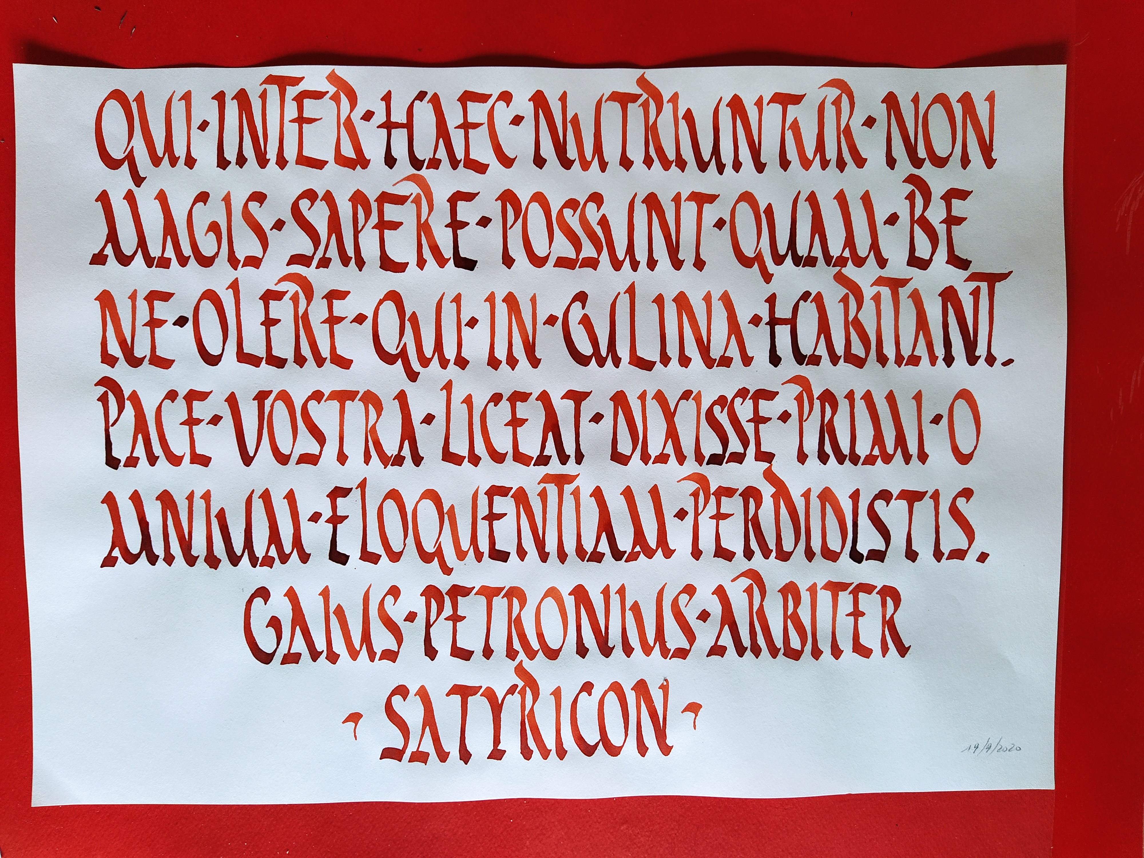 fufluns ha scritto: martedì 15 settembre 2020, 21:45 Dory, calli1958... richiede una continua e controllata rotazione del pennino e un cambio della posizione della mano mentre si eseguono i tratti: cambiare tra un tratto e l'altro sarebbe già difficile, ma nell'atto, beh, é davvero da maestri!
