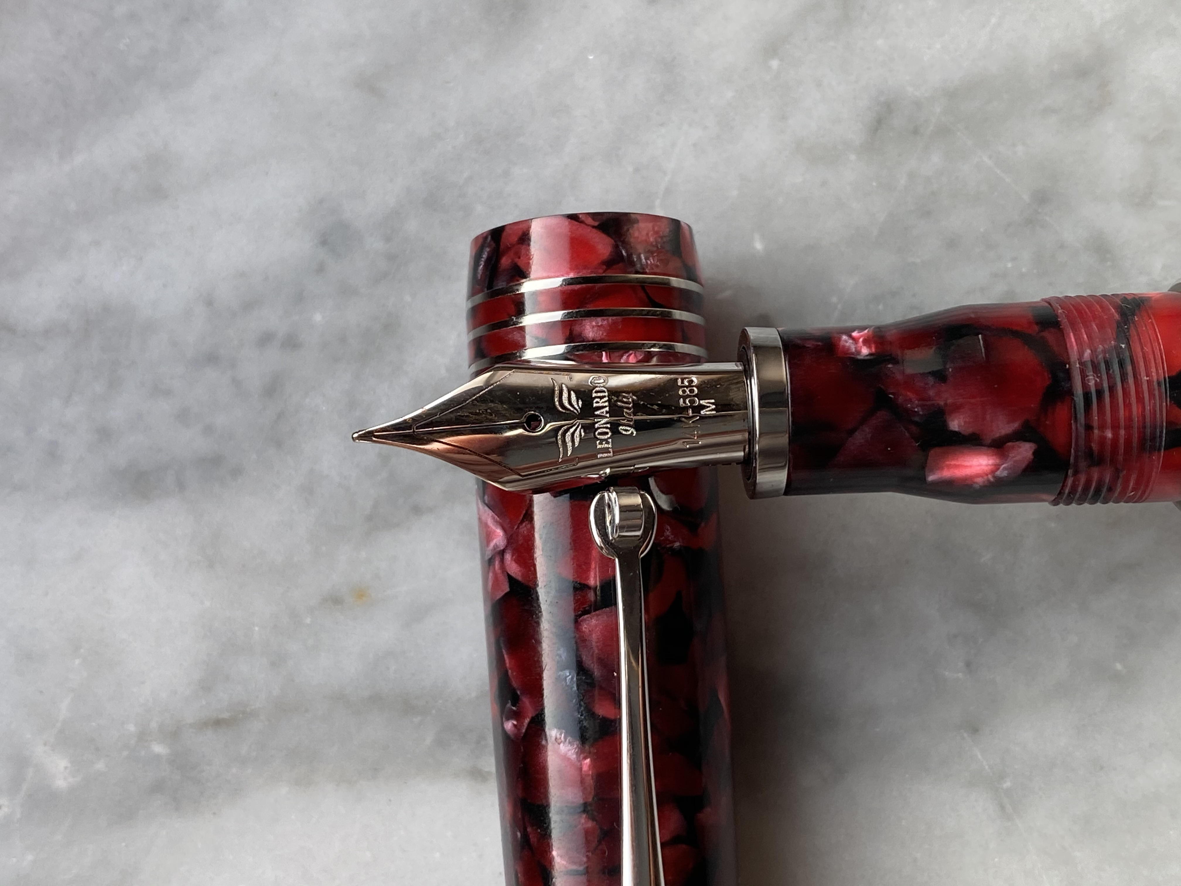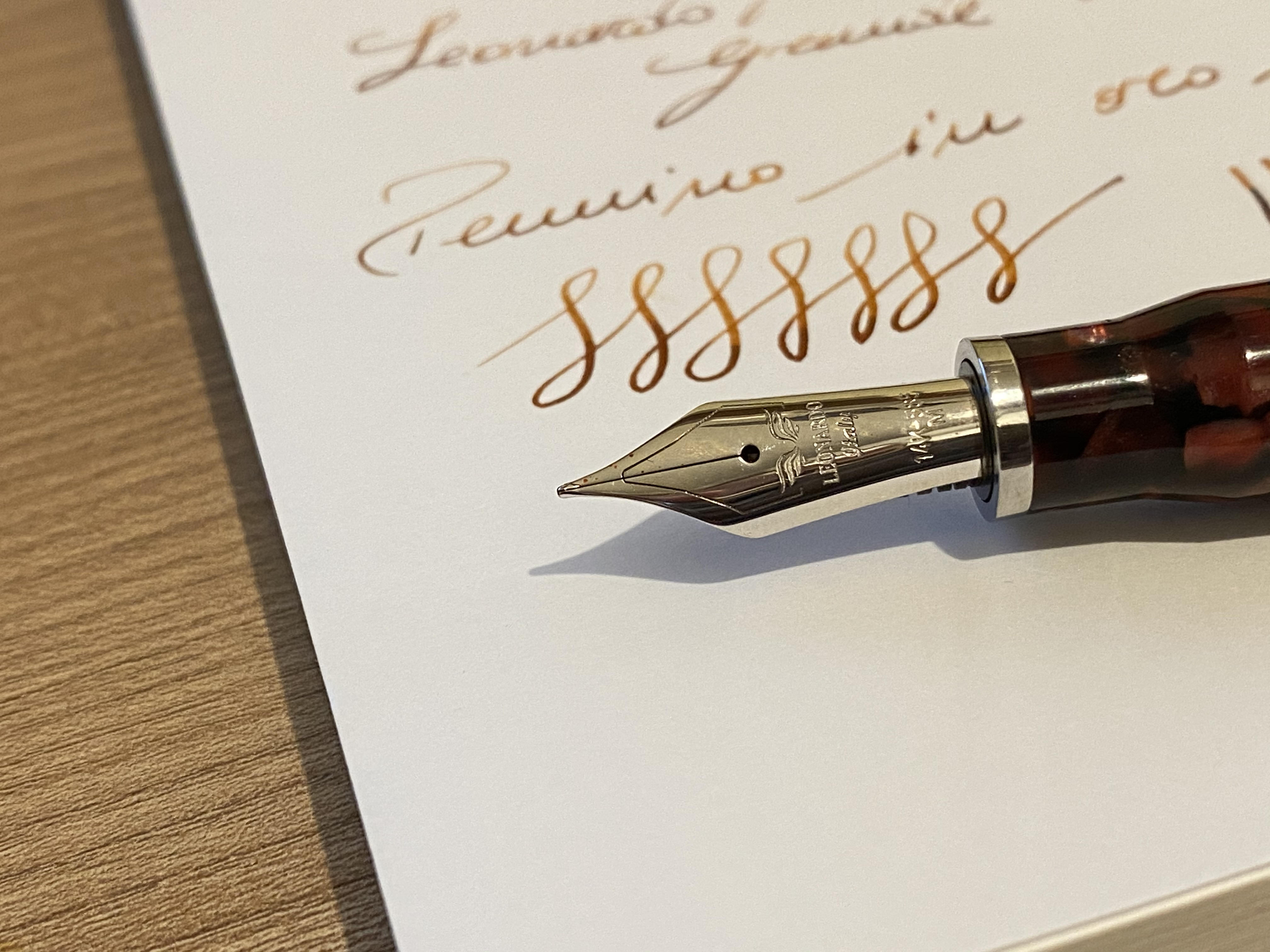 Il fusto presenta uno scalino poco sopra la filettatura su cui si avvita il cappuccio, gradino però addolcito da un anellino metallico e che comunque non infastidisce in scrittura essendo abbastanza in alto. La sezione è molto comoda, l’ho apprezzata appena presa la penna tra le dita, ha una svasatura che si restringe fino a 11mm, un forma ed un diametro che trovo perfetto per le mie mani. La penna viene commercializzata in due diverse versioni, una base con pennino in acciaio ed una, che definirei “deluxe”, con pennino in oro 14K. La penna oggetto di questa recensione era corredata di pennino in acciaio di gradazione M, in un secondo momento ho preso quello in oro a 14K nella stessa gradazione, entrambe i pennini sono di produzione Bock. L’alimentatore, a prescindere dal pennino è sempre lo stesso, in ebanite realizzato da Leonardo. Entrambe i pennini hanno scritto bene fin dalla prima volta che hanno toccato la carta, in maniera diversa però. Il pennino in acciaio l’ho trovato più generoso sia nel tratto che nel flusso, è un pennino morbido ma poco elastico, molto liscio dal feedback poco pronunciato. Il pennino in oro invece è leggermente più esile, ha un tratto ed un flusso più controllato ma comunque non scarso. Lo trovo più morbido del pennino in acciaio e consente una variazione di tratto un po’ più pronunciata, il feedback è molto simile a quello in acciaio, forse un pelino più presente.