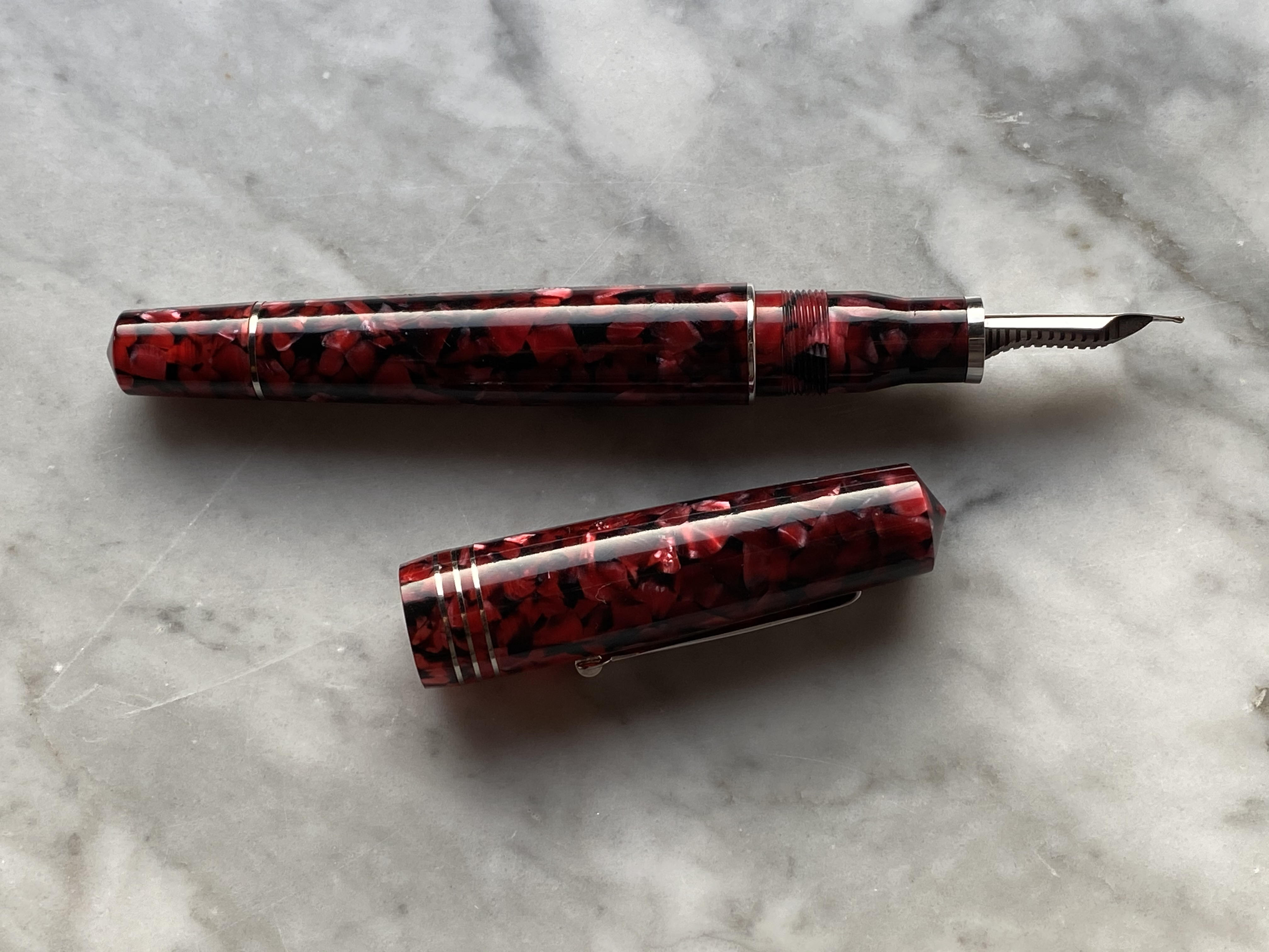 Anch'io felicissimo possessore dopo la mz pietra marina con pennino in acciaio sf che scrive benissimo e una mz stub 1.1 sono passato alla mz grande stavolta però ho fatto il botto una dark Hawaii pennino oro elastic f Meravigliosa