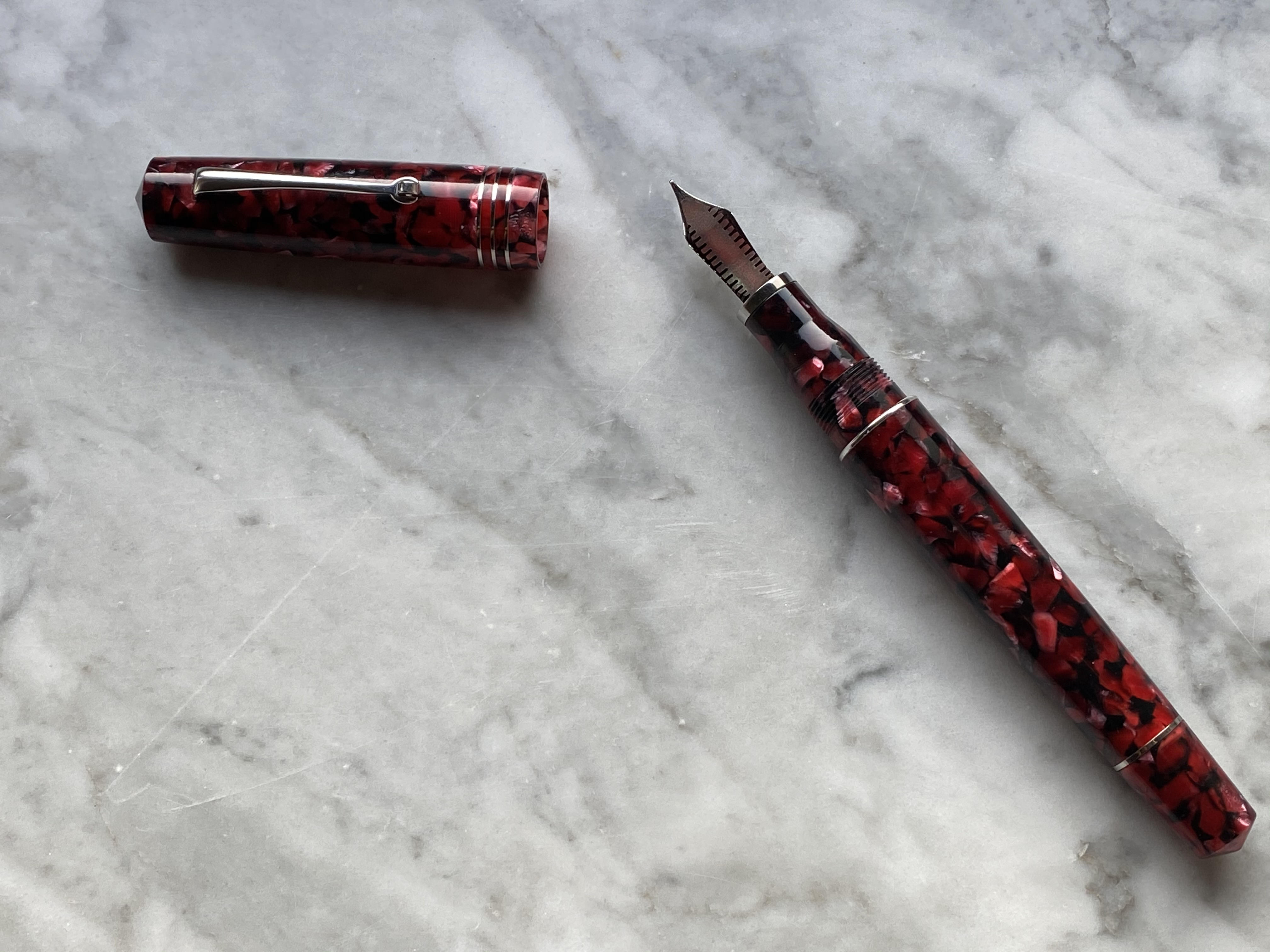 Rapporto qualità prezzo, vediamo: per meno di 300€ di listino ci portiamo a casa una penna di misura importante fatta in resina, di cui una più bella dell’altra, ricarica a pistone di buona capacità, conduttore in ebanite e pennino in acciaio, insomma facendo un po’ di paragoni in giro direi che non è male. Per 200 cucuzze in più abbiamo il modello deluxe con pennino in oro, ancora tutto sommato non male paragonando con altri marchi nostrani.