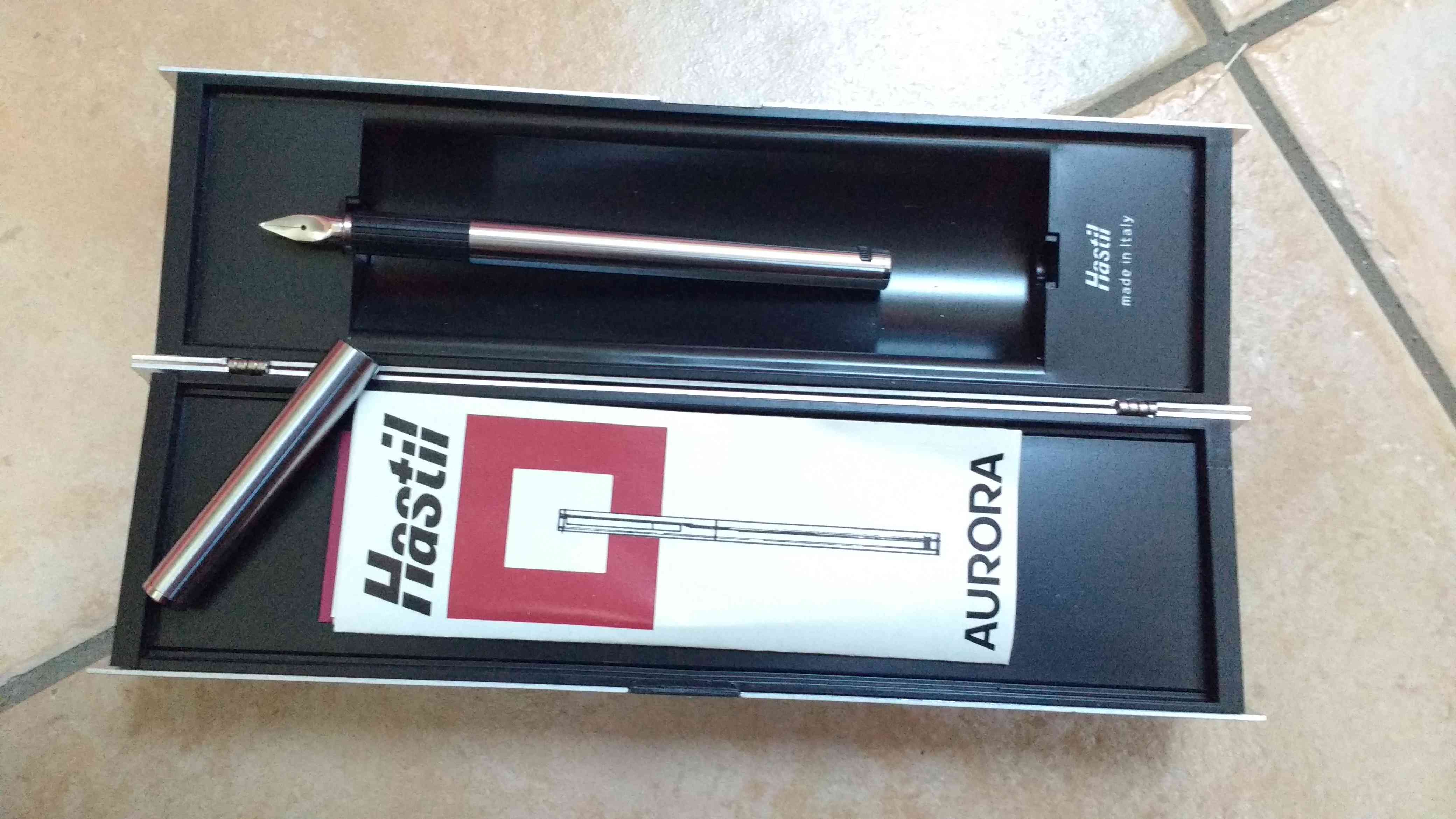 Aurora Hastil in perfette condizioni, secondo me mai inchiostrata, visto che la confezione contiene due cartucce intatte oltre al "converter" ad aspirazione.