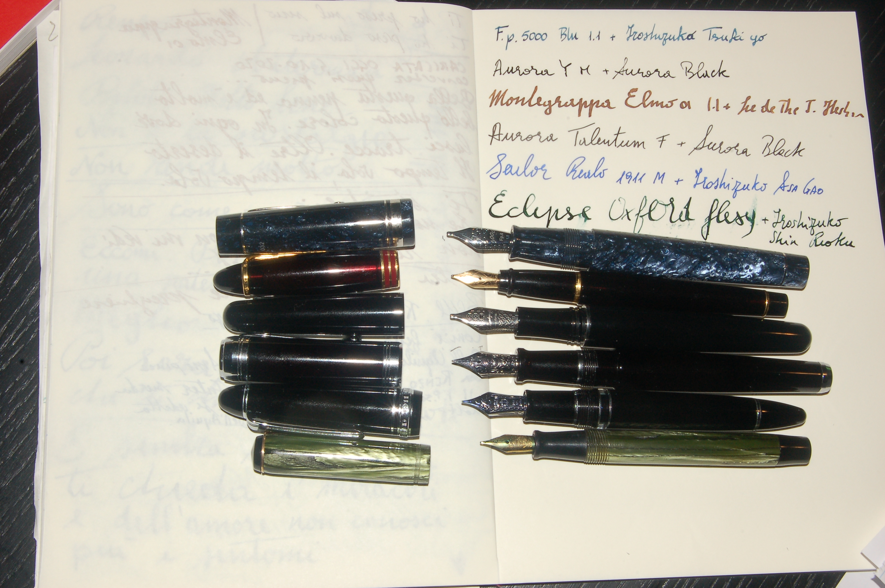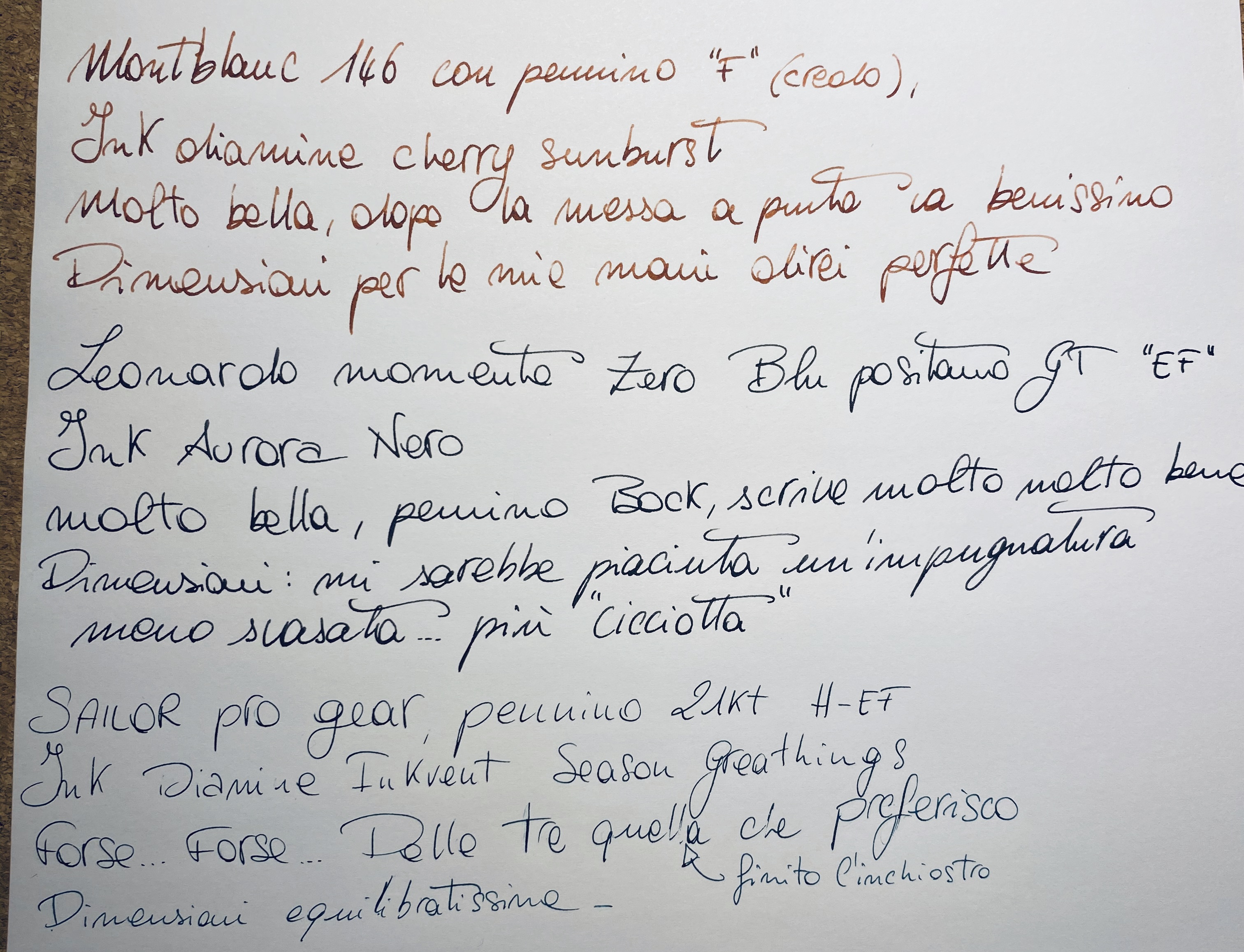 In studio una Montblanc 146 F con R & K Sepia, Aurora Talentum nera EF con Diamine Eclipse, Platinum 3776 Century Bourgogne nib oro 14k F con Waterman Audacious Red, Pelikan M600 old style Nib 18k F con Pilot Iroshizuku syo-ro.