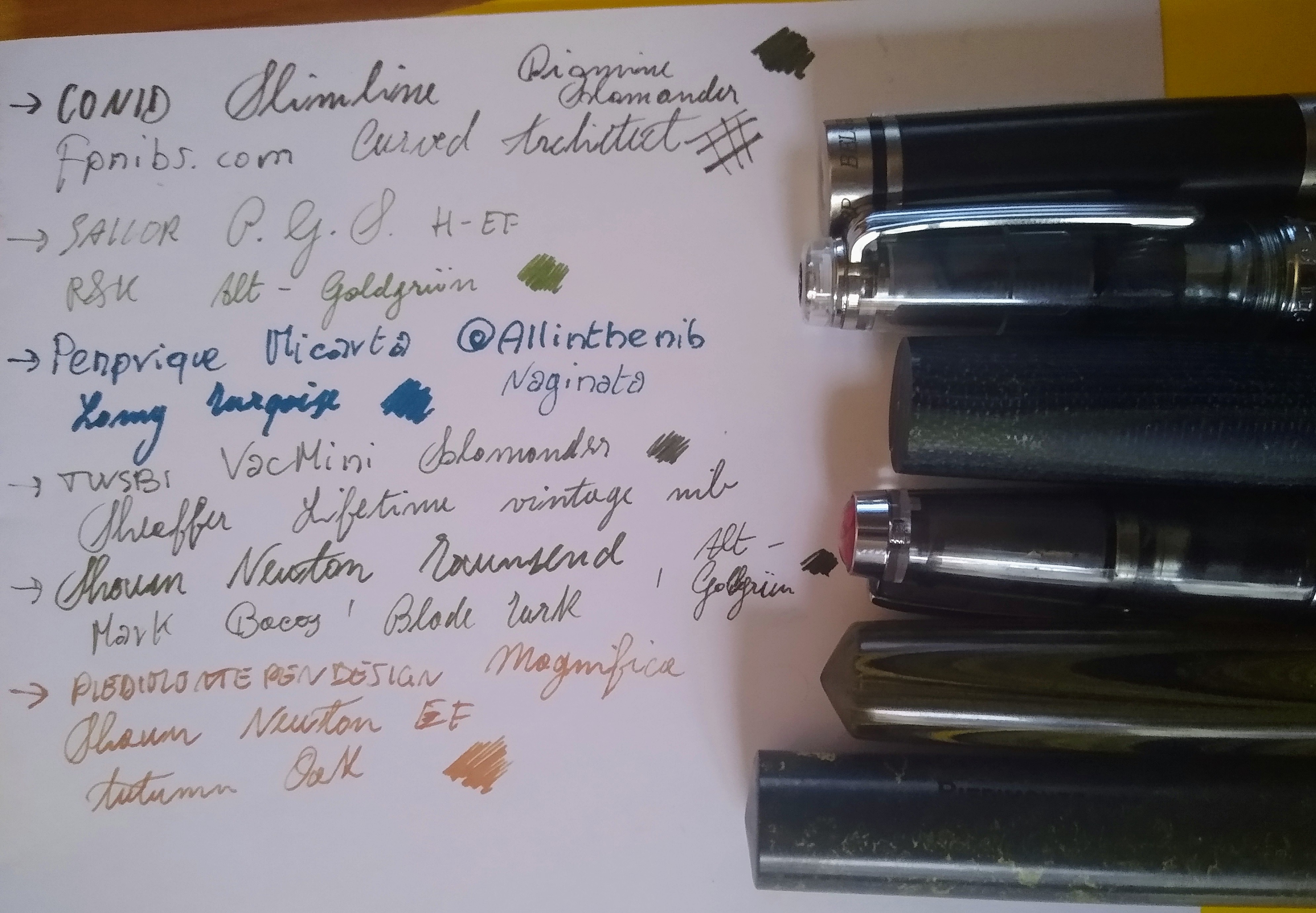 Sulla scrivania in studio la Parker 75 con inchiostro Parker blu, la MB 149 con inchiostro MB nero, una Omas Milord con inchiostro Pelikan blu, una Pelikan 400 con inchiostro Diamine Oxblood, che confermo essere un marrone ma assolutamente di mio gusto, e da ultima una Shaeffer Nononsense caricata con Pelikan verde scuro.