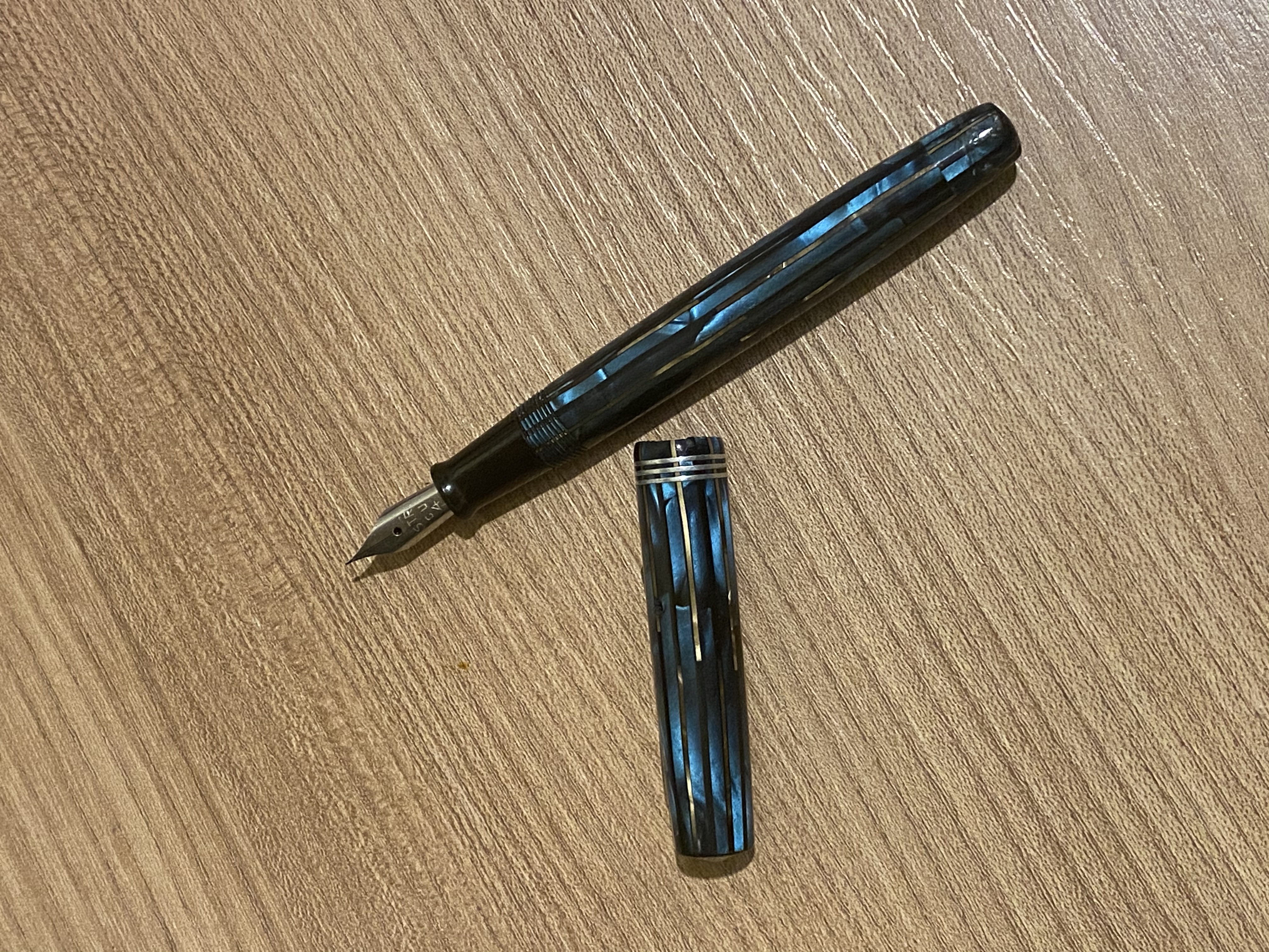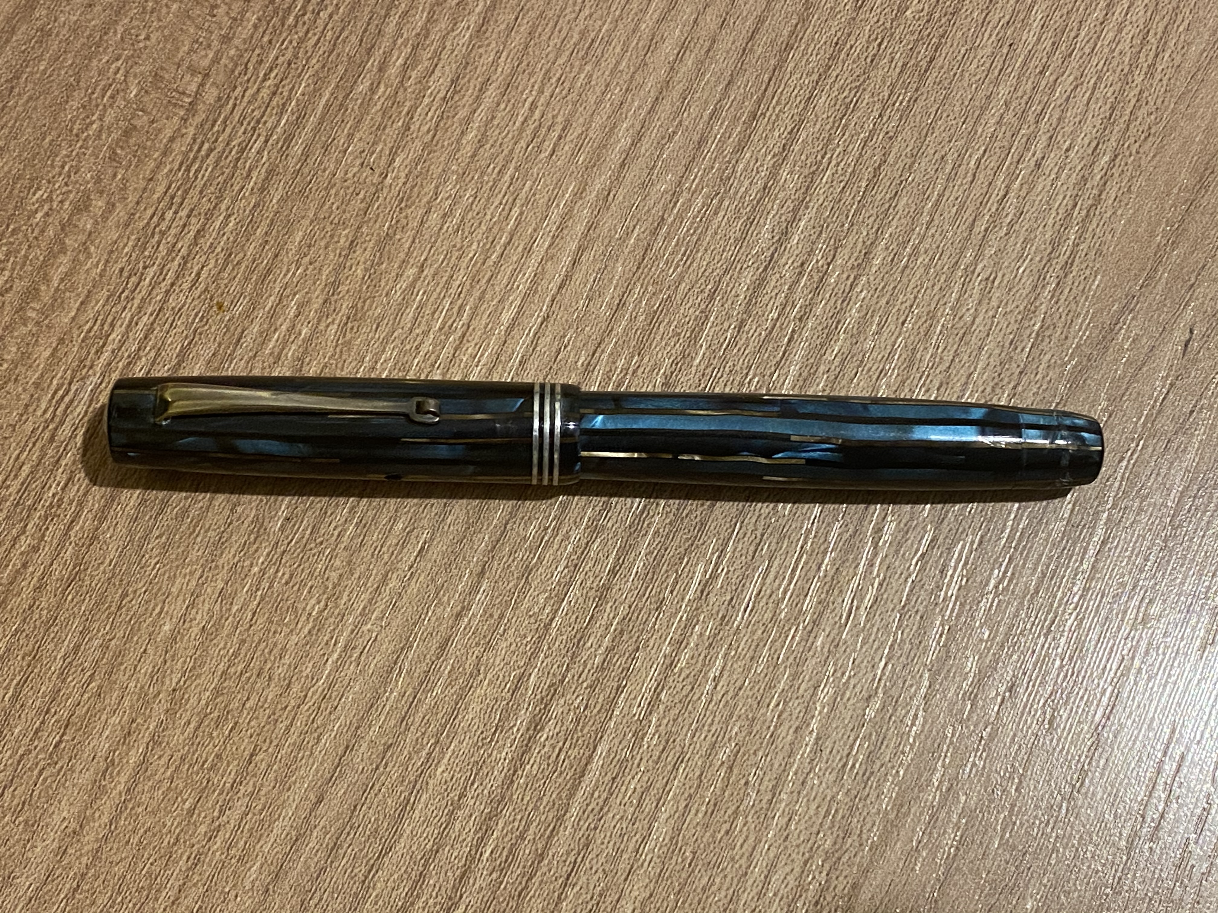 Ho scovato questa stilografica che inizialmente pensavo essere una trovatella, aveva un anonimo pennino ed era messa abbastanza male. Ripulendola è venuta fuori una bella celluloide e si è rivelata essere una S.T.B. ossia una Stiassi Tantini Bologna, produzione di seconda fascia di Tabo. La penna ha un caricamento a pulsante di fondo e le ho donato un pennino in acciaio molto simile a quello danneggiato con cui l’ho ritrovata. La penna necessita ancora di una barra di pressione che mancava (se qualcuno ne ha una disponibile gliene sarei grato) e, purtroppo, ha il fondello danneggiato, ma che comunque fa ancora bene il suo dovere non essendo rotto.