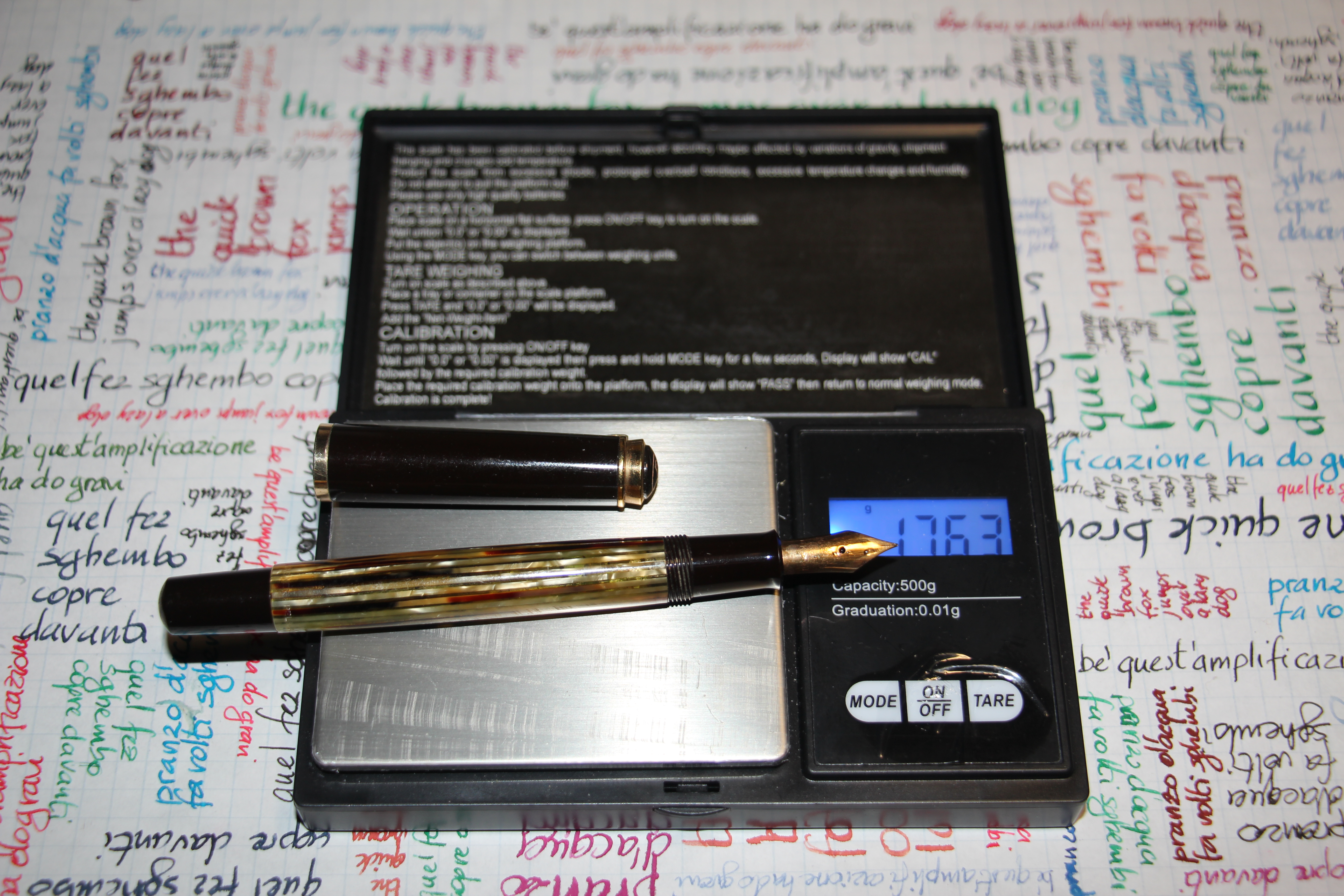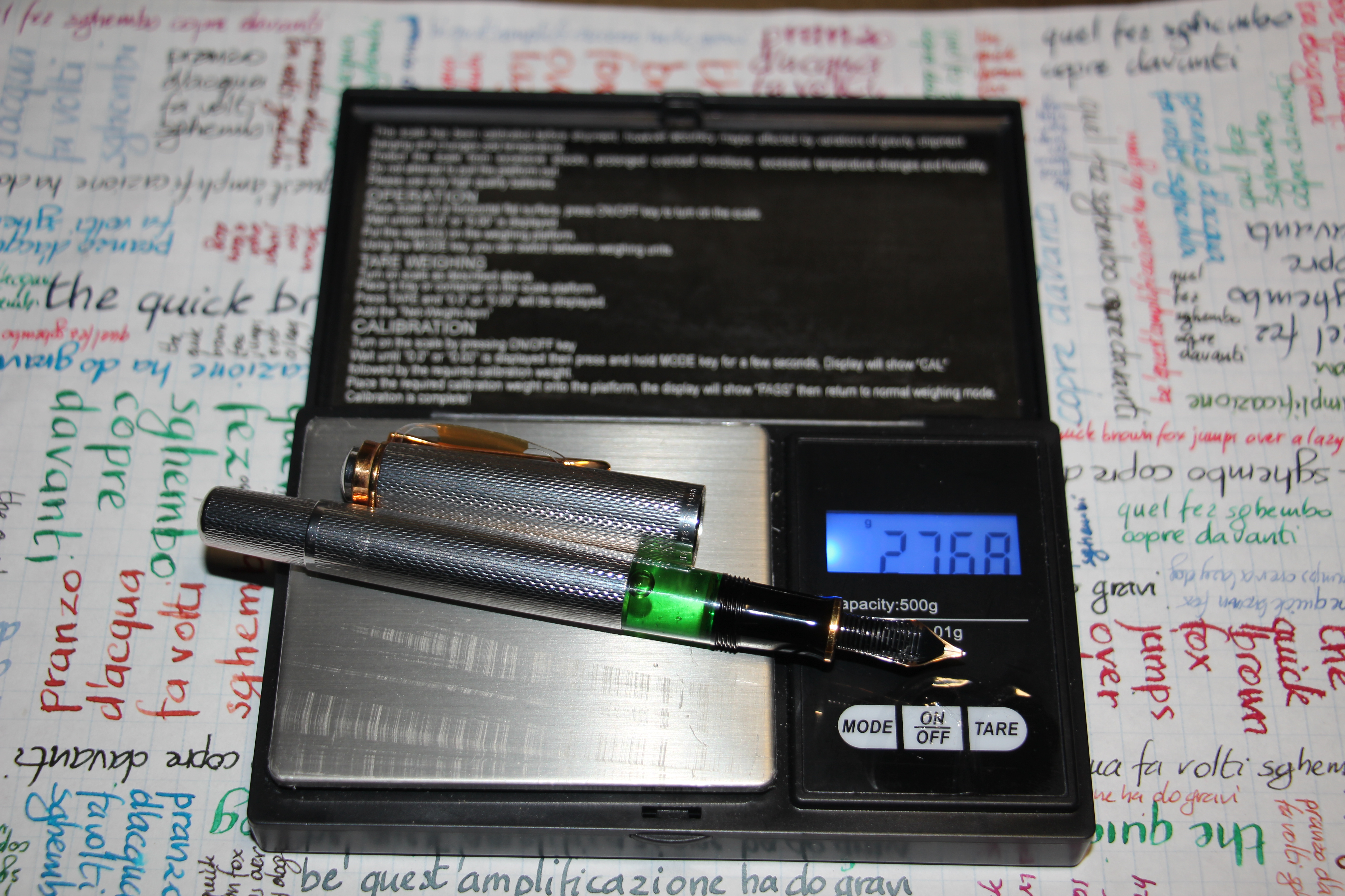 Come sempre si è iniziato a pesare la penna vuota e totalmente asciutta, in questo caso il peso della M600 è risultato essere di 13,91 g cui si applica il solito errore sistematico di 0,01 g dato dalla scala della bilancia. Si sono poi effettuati i cicli di carico e scarico della penna come descritto nei link citati, ottenendo i seguenti valori per ciascuna pesata: