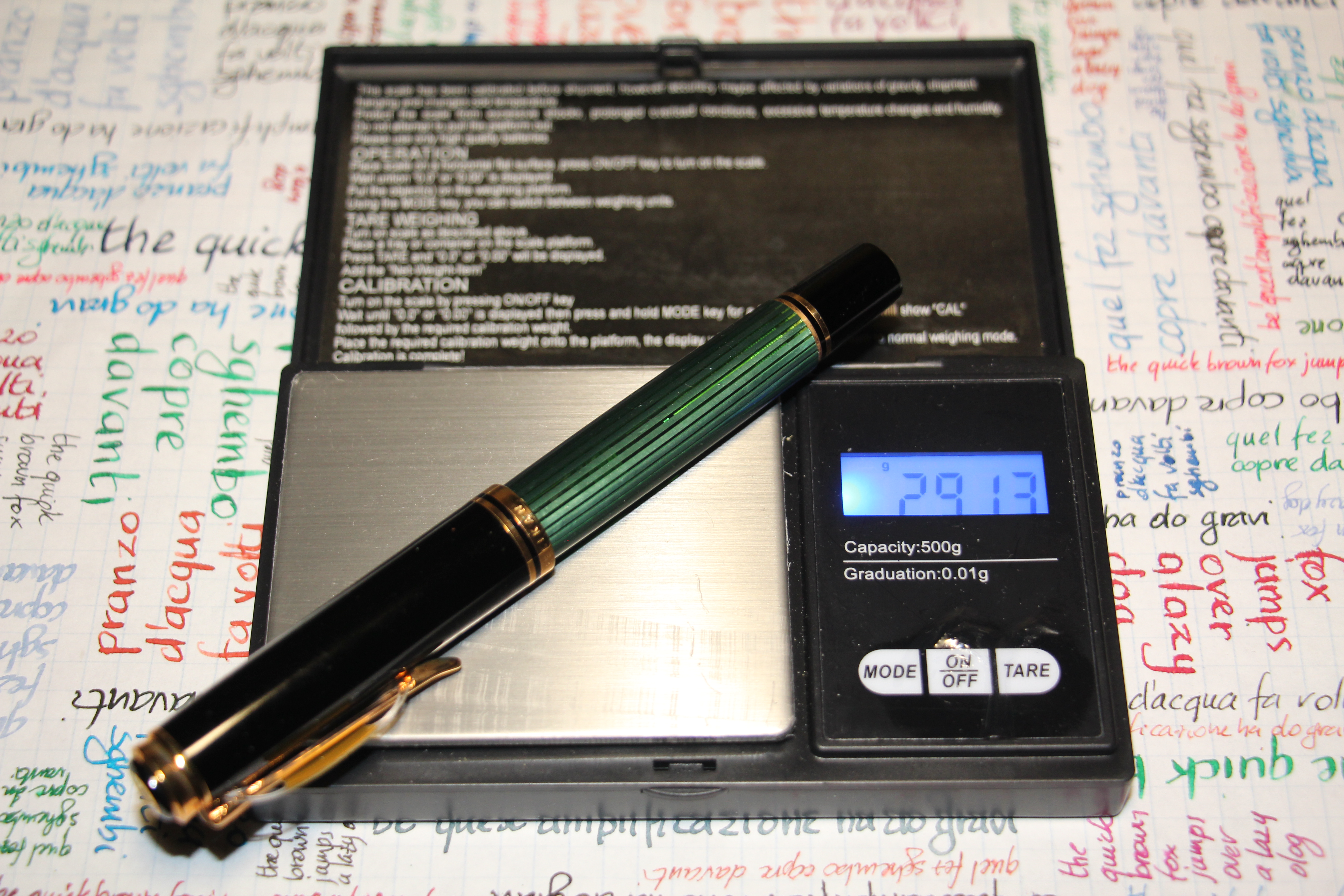 Infine l'ultima penna della serie è una M800, una penna di dimensioni generose, 13,9 cm di lunghezza e 1,35 cm di diametro, che, anche per via del suo meccanismo di caricamento in ottone, è risultata pesare da vuota e completamente asciutta 29,13 g.