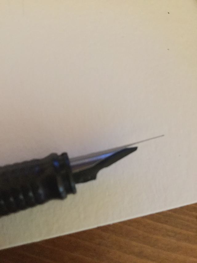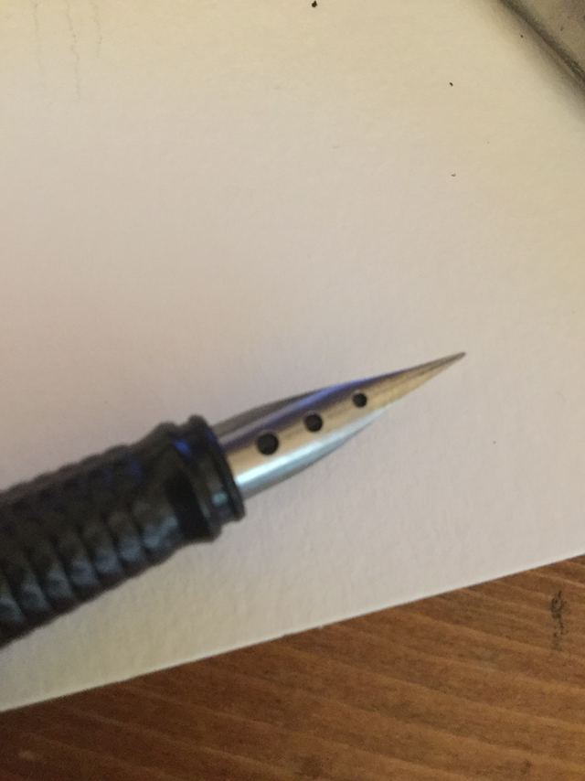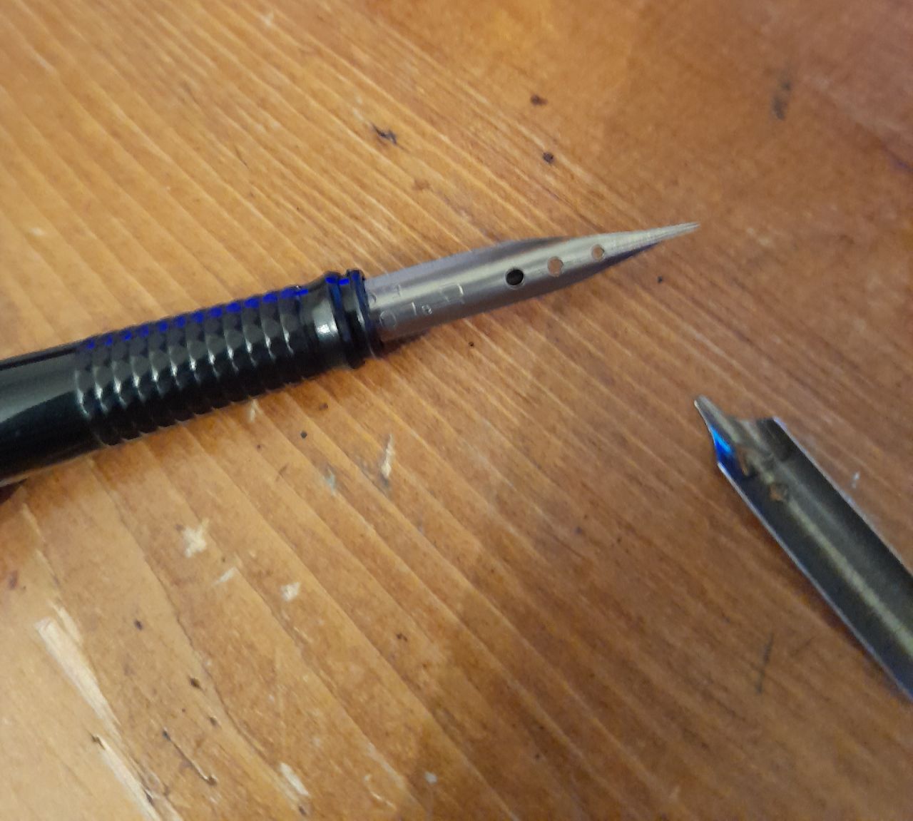 Qualche oretta fa mi è giunta alla mente un'idea assai balzana (probabilmente solo il delirio di una neofita), ovvero di provare a montare un pennino molto flessibile da intinzione su una stilografica economica (facente parte di un set comprato qualche anno fa da Tiger). Durante il processo mi sono accorta, tuttavia, che il pennino è ben più lungo dell'alimentatore, e che due fori su tre rimangono aperti. Ecco qualche foto:
