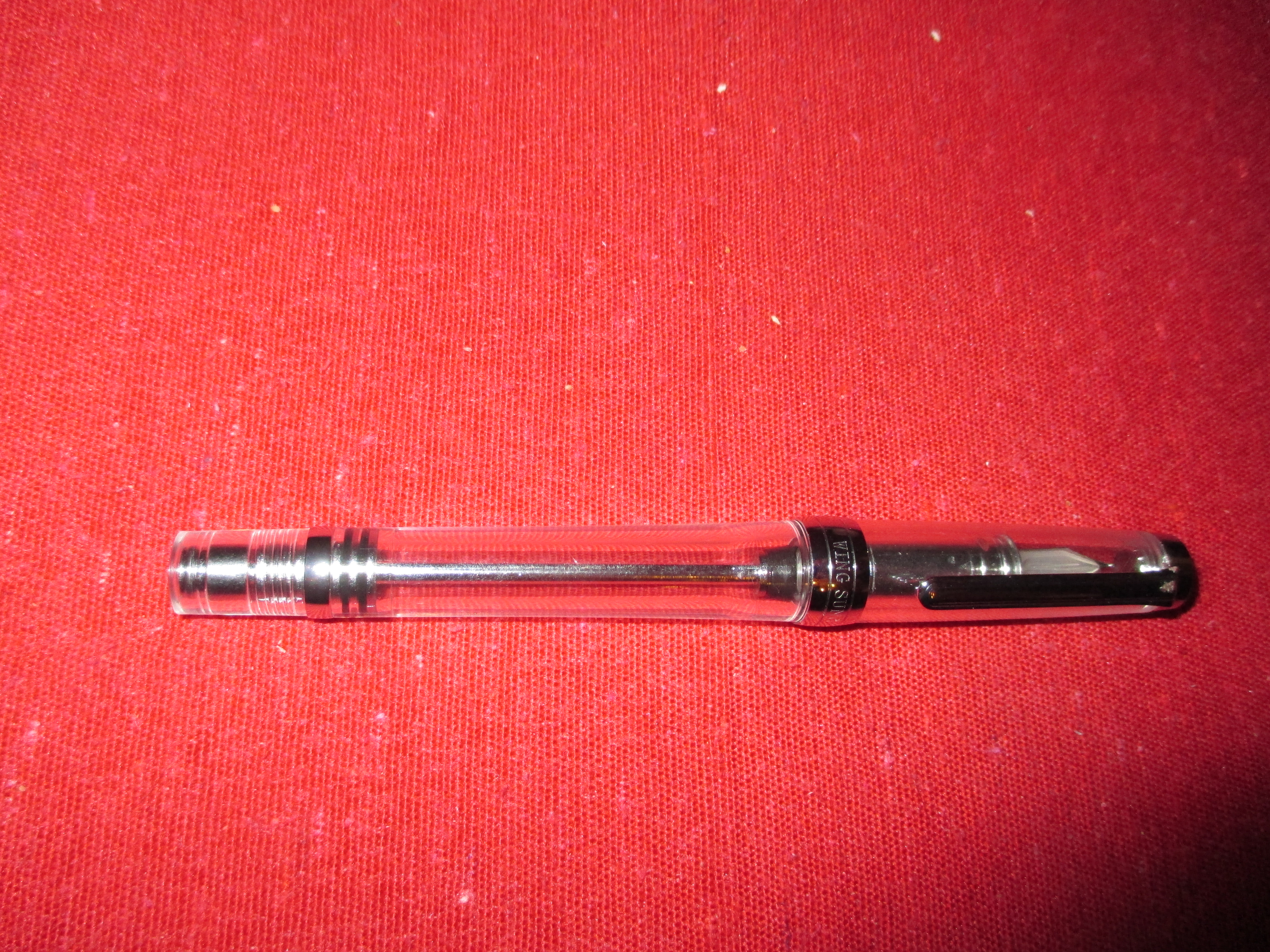 La penna è la copia cinese di una nota penna taiwanese…. Non mi dilungo sul sistema vacuum filler perché ne sapete più di me, quindi mi limito a dire che funziona tutto bene e che è scorrevole. Tutte rose e fiori dunque? Ovviamente no…i lati negativi ci sono e sono: 1) la clip è di marmo e il dot in acciaio nella parte inferiore della stessa la rende, di fatto, inutilizzabile, inoltre, ha i bordi taglienti; 2) l’acrilico presenta in più punti il segno della linea di congiunzione delle parti. Queste sono le uniche note di demerito ma vanno viste alla luce di un prezzo di acquisto davvero molto basso quindi non penso si possa pretendere di più.