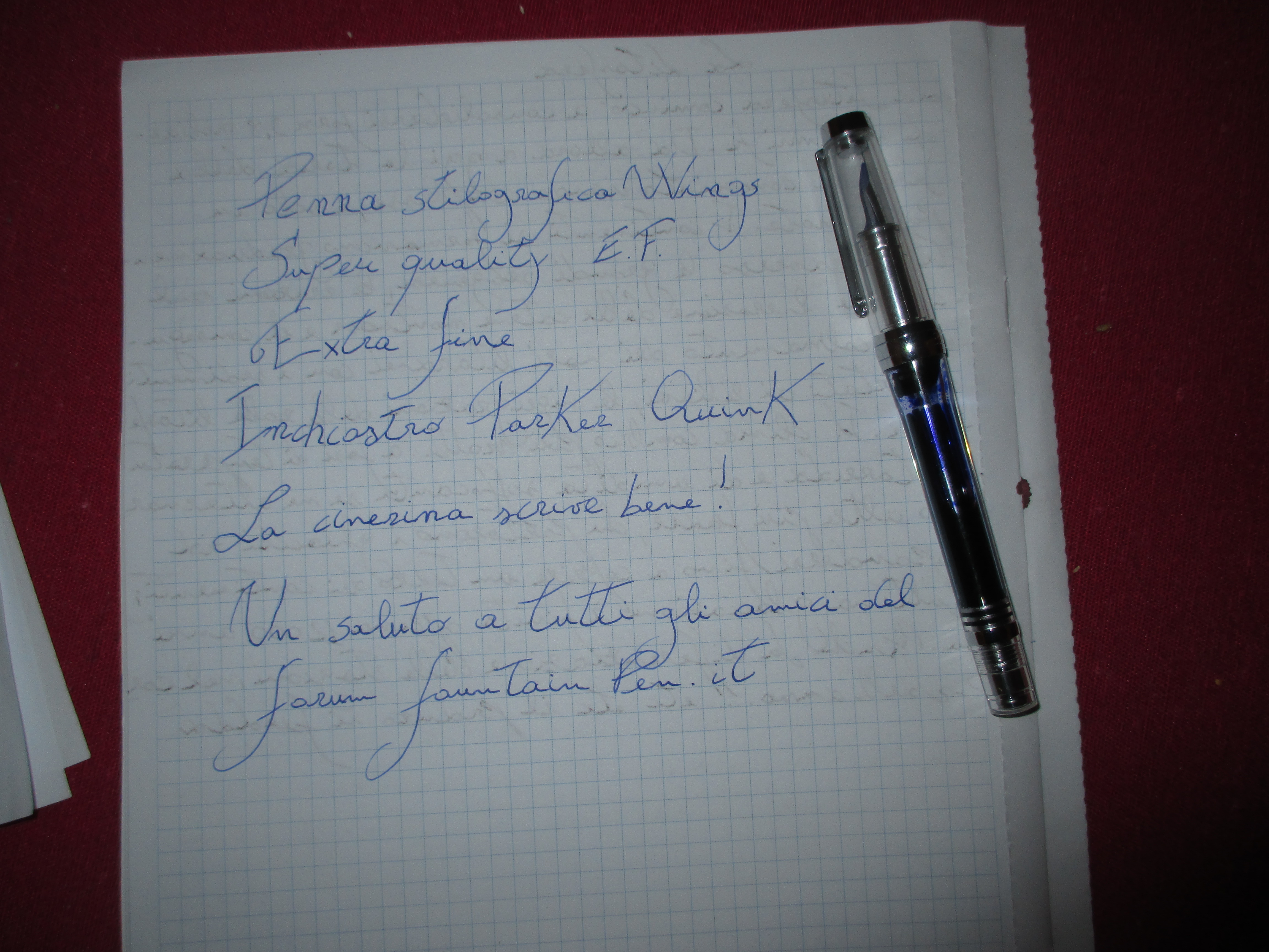 Ho anche io una Wingsung 3013, viola. Ma ha il pennino diverso, c'è il logo ma non la scritta super quality, credo sia una nuova versione questa. La mia, era un po' stitica, ma è bastato un interventino di smontapennino, schiacciapennino, rimontapennino ed ora va benissimo. Una volta immersa la punta nel calamaio, basta ripeterd 2 volte l'operazione di carica e si carica quasi del tutto, senza fare operazioni acrobatiche. Direi che per ben 3 euro che la pagai, spedizione inclusa, va più che bene. Ora è carica con un grigio scuro, Diamine Quartz Black.