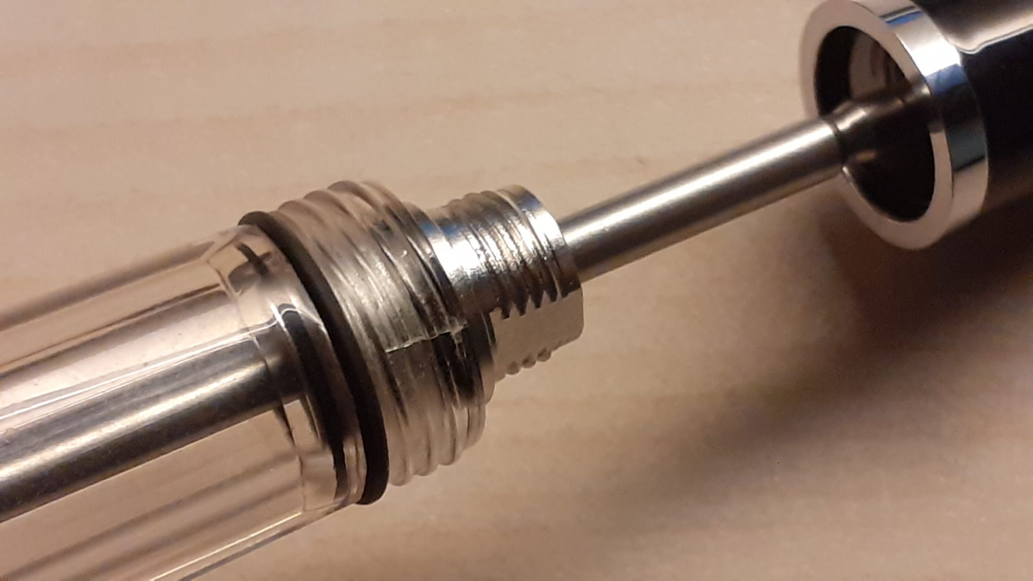 ahimè dopo tre anni (un po' meno ad essere sinceri) anche la mia Vac Mini comincia a cedere. Mi sono accorto che la filettatura del pistone si sta crepando, stranamente non sulla saldatura del policarbonato ma un paio di millimetri più accanto, quindi è il materiale che sta cedendo.
