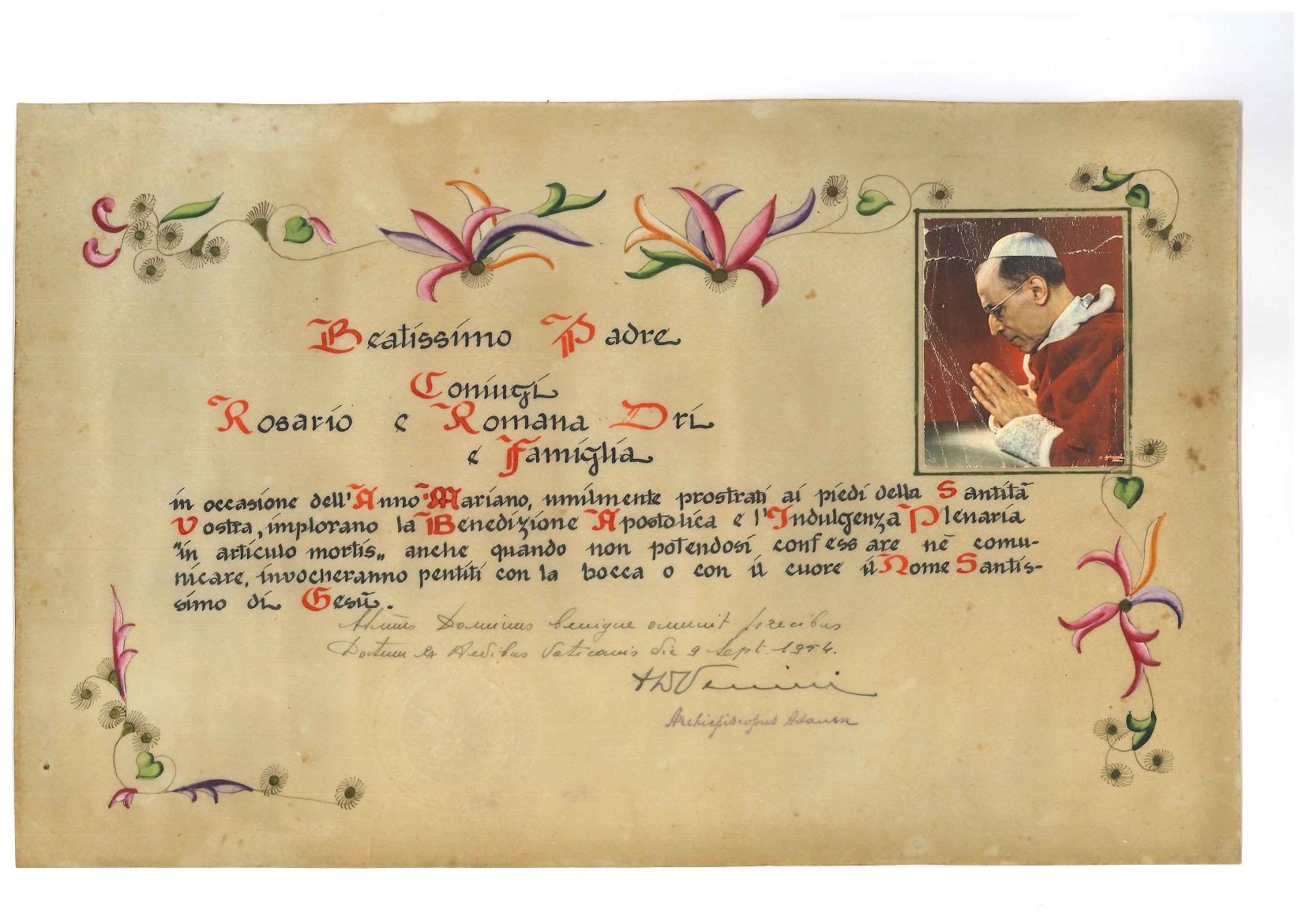 Ogni tanto, nel tempo libero, salgo in soffitta e riordino un po' di cose che conservo in scatoloni e di cui non mi ricordo neanche il contenuto.In uno di questi ieri pomeriggio ho trovato questa pergamena appartenuta ai miei genitori. E' datata nove settembre 1954, l'anno Mariano istituito l'otto dicembre 1953 da Papa Pio XII.