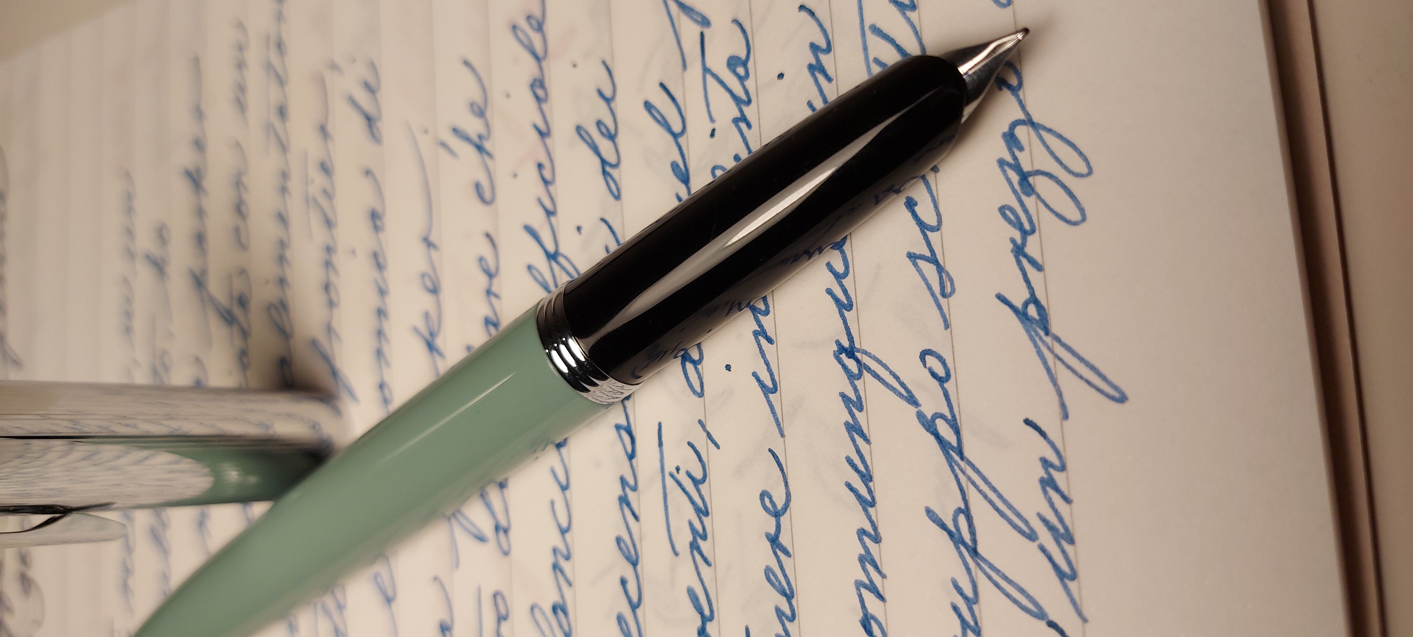 Ma adesso, per farla il più breve possibile ho ordinato, finalmente la penna in questione, anche in concomitanza di una ricorrenza. La penna è stata otdinata presso un noto negozio specializzato che è anche convenzionato con questo forum , ho infatti, tra le altre cose, usufruito del buono sconto utenti che i negozi convenzionati ci mettono gentilmente a disposizione. Prima dell’ordine mi sono premurato di telefonare al negozio in oggetto, chiedendo la cortesia di provare la penna per evitare spiacevoli sorprese, poichè come già su detto era un acquisto effettuato per una occasione particolare, mi è stato assicurato, nei limiti del possibile che il mio desiderio sarebbe stato soddisfatto, inoltre per un “doppio riscontro" ho pure aggiunto una nota in fase finale di ordine specificando la cortesia di un controllo come già da precedenti accordi telefonici avvenuti il giorno prima. La penna è arrivata a casa dopo qualche giorno, come da mia abitudine con le penne nuove l’ho accuratamente lavata ma non ho notato la fuoriuscita di nessun residuo di inchiostro. Quindi l’ho caricata con un waterman mysterious blue. Scrivendo ho notato subito un flusso abbastanza controllato, direi magro, e più che un M mi è parso un F, ma non avendo mai posseduto prima una Aurora stilografica ho preso la cosa come una caratteristica propria della penna, accompagnata comunque da una certa magrezza poco piacevole.