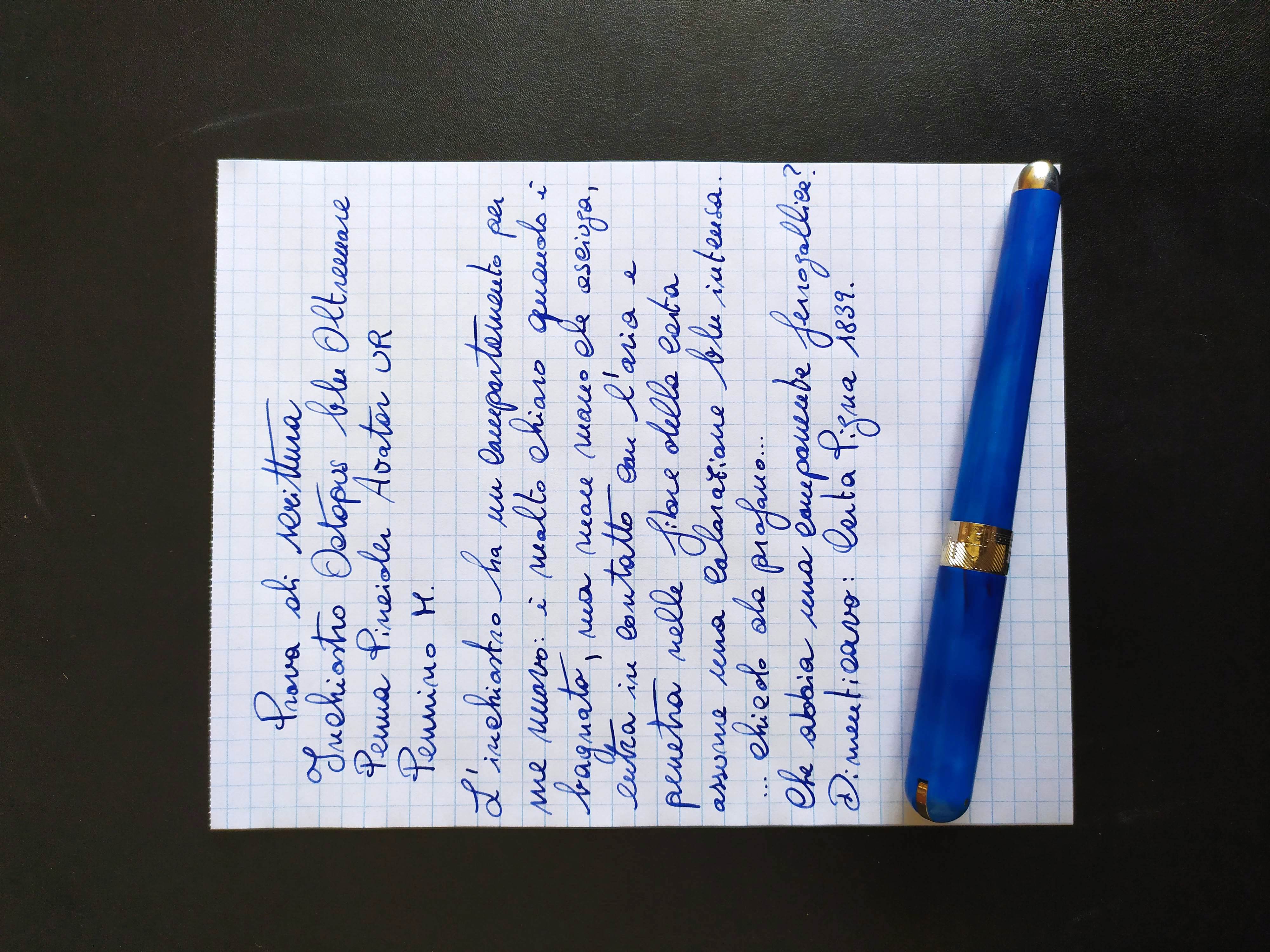 2. L'altro comportamento è legato alla tonalità di blu: nell'immediato, quando scrivo, il colore sembra essere un po' slavato, ma quando si asciuga diventa di un bel blu scuro... Al contrario rispetto ad altri blu che uso ordinariamente (Pelikan, Visconti, Waterman). Mi viene da fare una considerazione, da profano che ha visto alcuni tutorial: ma non è che abbia una componente ferrogallica che si accentua in saturazione? ...chiedo anche per la salute delle mie penne :lol: