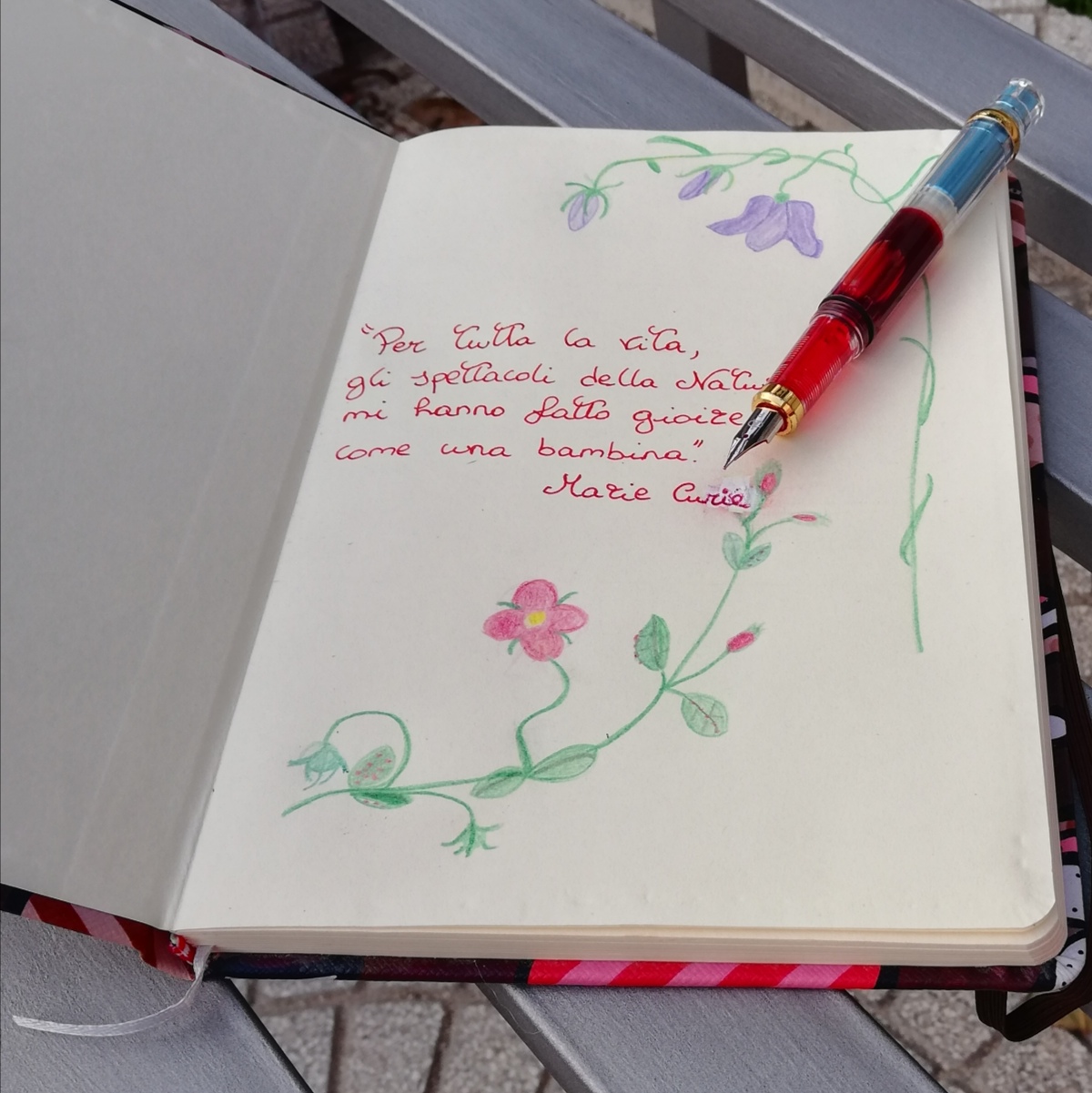 Così oggi pomeriggio ho preso un quadernino, delle matite colorate, una gomma... E ovviamente una stilografica e ho iniziato a "produrre" fiori, foglie e pensieri...
